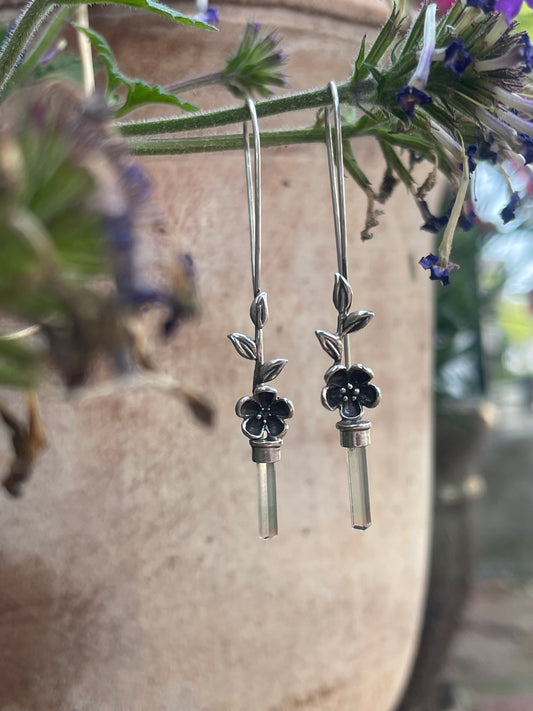 Blooms on the Vine • Watermelon Tourmaline Crystal Cherry Blossom Long Drop Earrings • Sterling Silver
