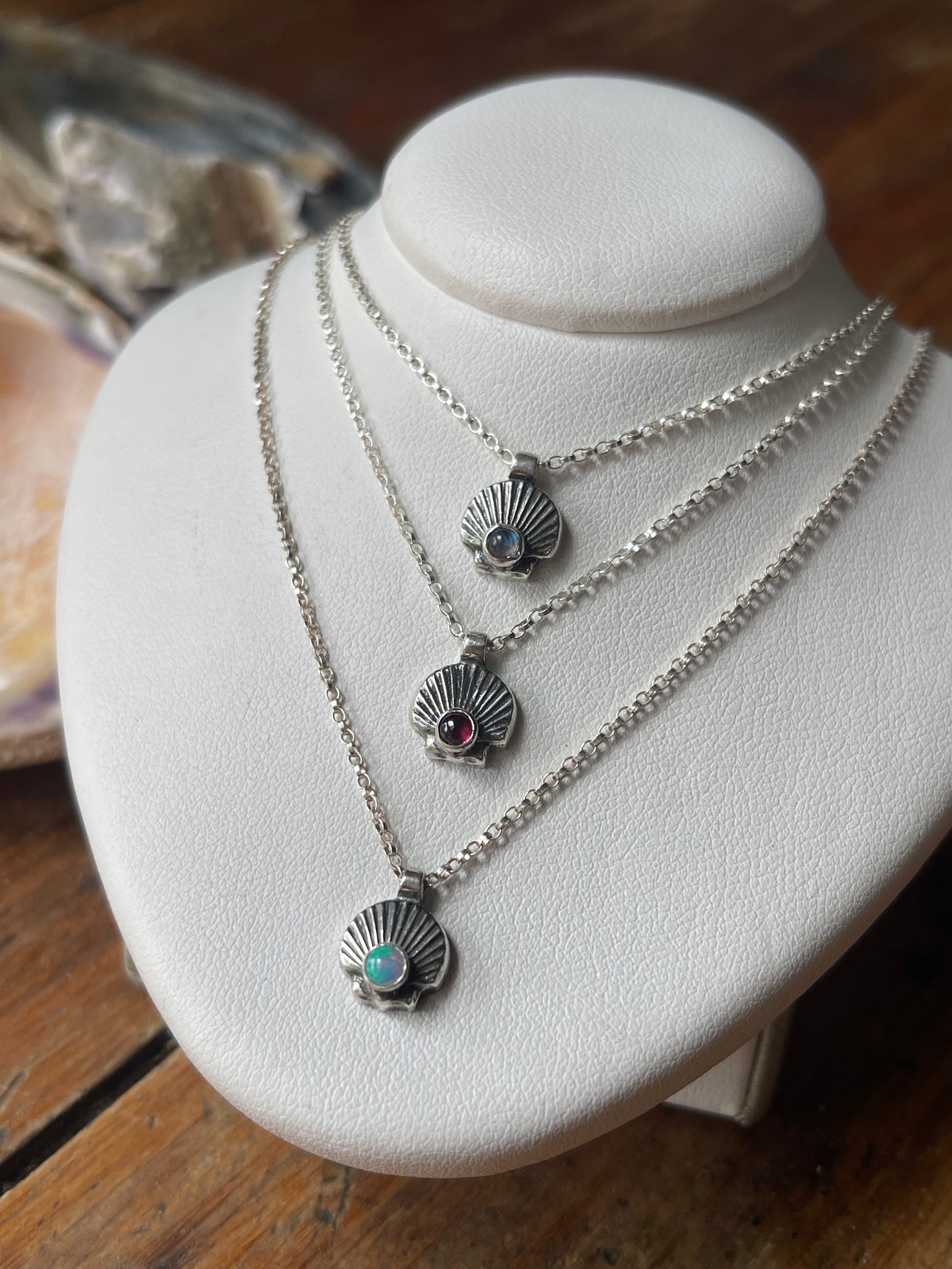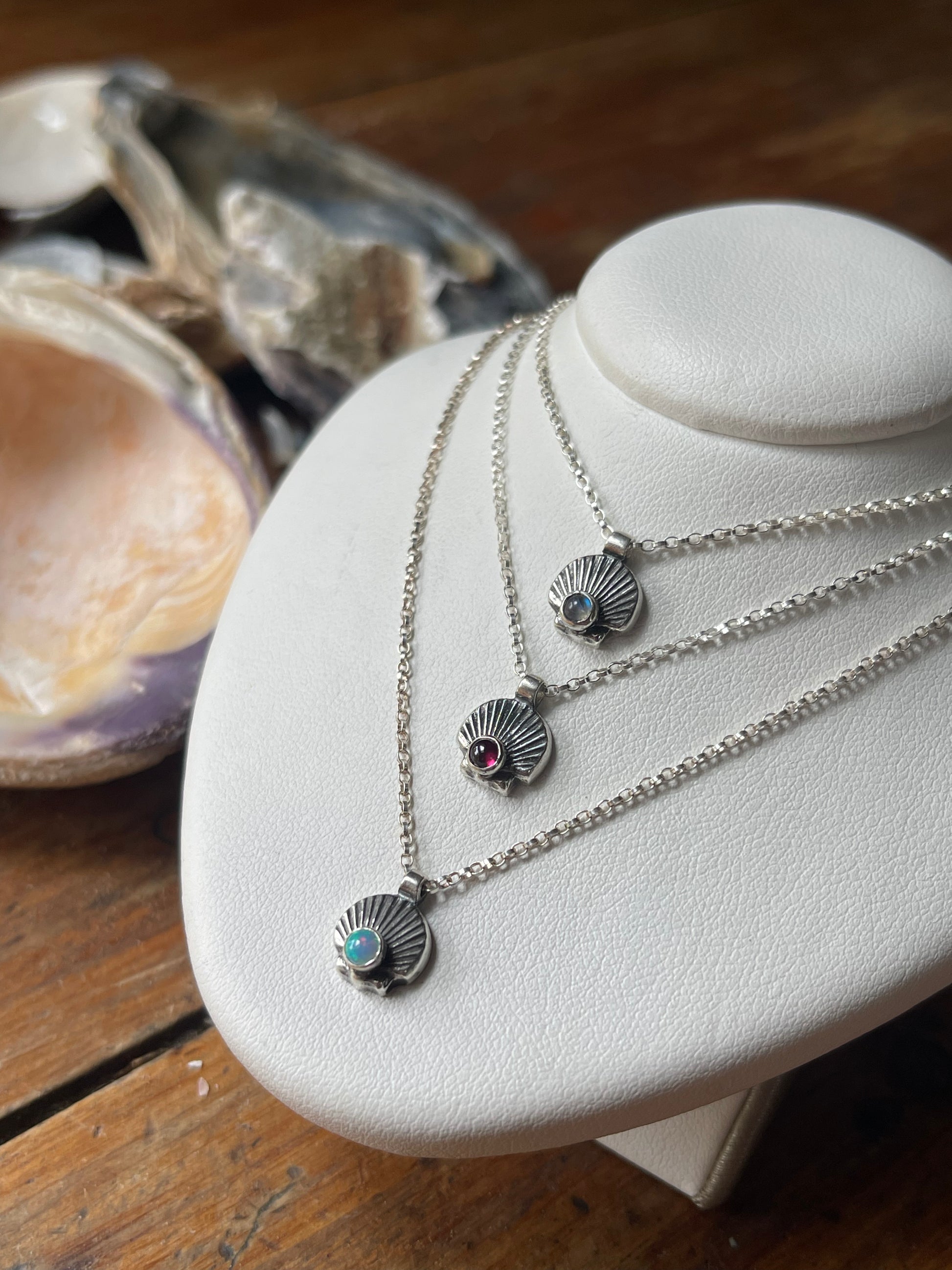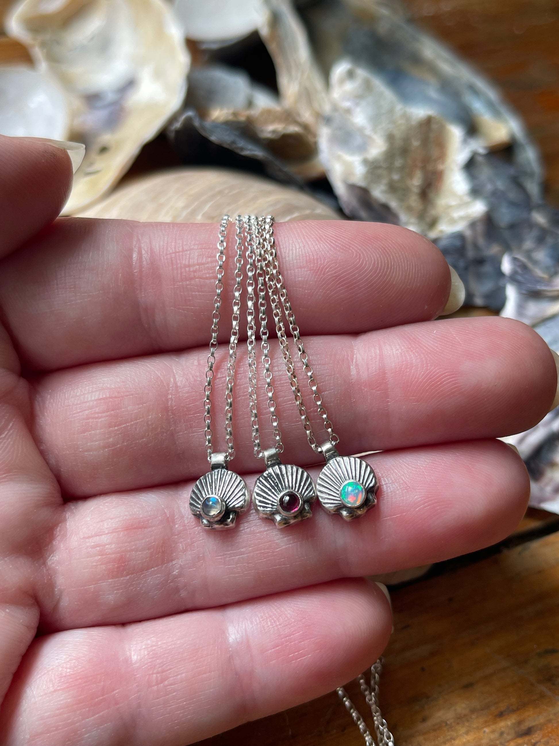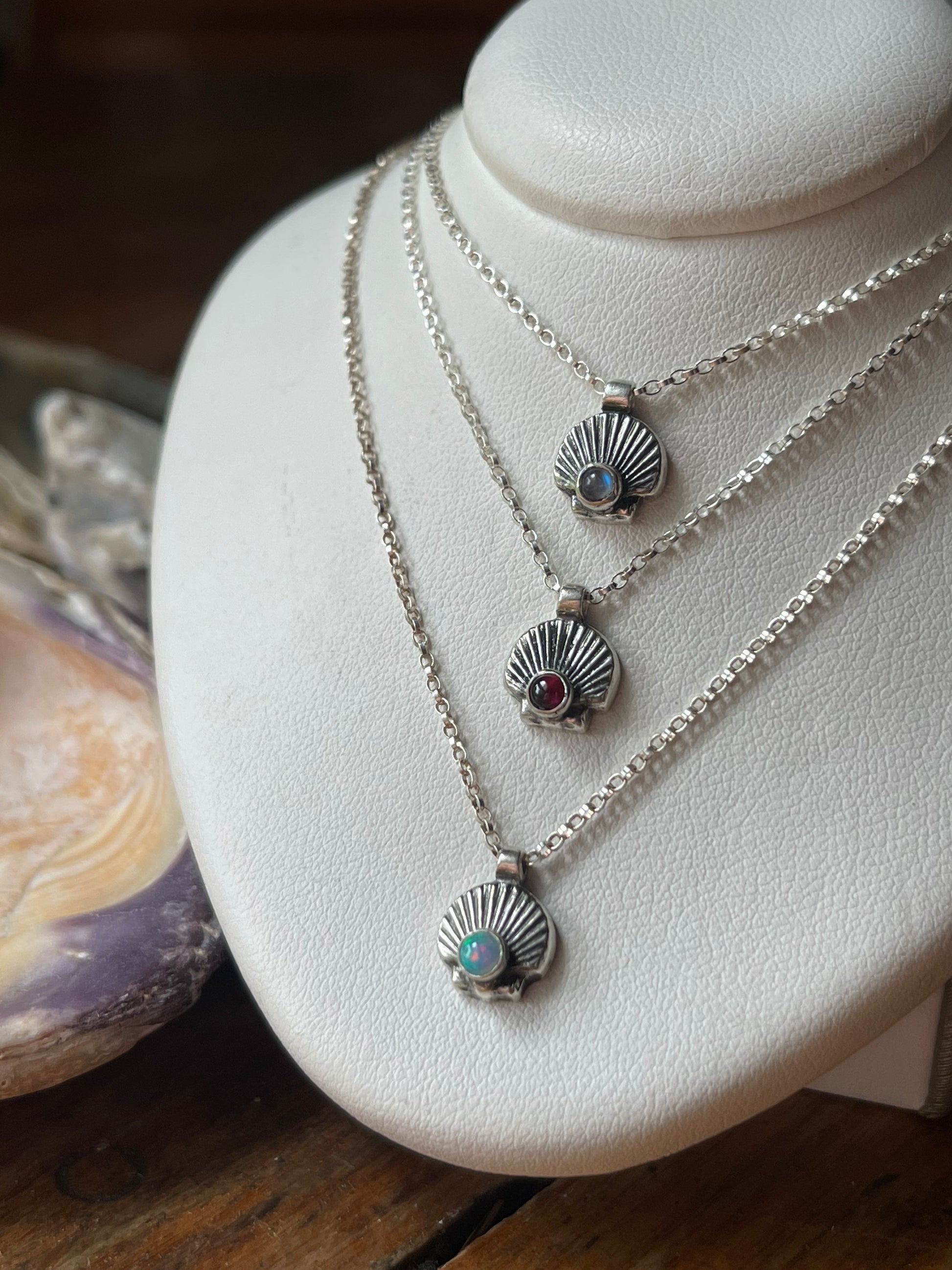 Dive in and make a splash with Ariel's Charm! This simple and sleek made to order necklace features a scallop shell made of thick, recycled silver with a beautiful, eye-catching gemstone accent; Choose between a glowing rainbow moonstone, bold pink garnet, or an iridescent opal. This charm glides effortlessly on a 15-inch small sterling silver rolo chain with a secure hook clasp. An eco-friendly piece with a vintage art deco vibe that will stand out in your jewelry box.
