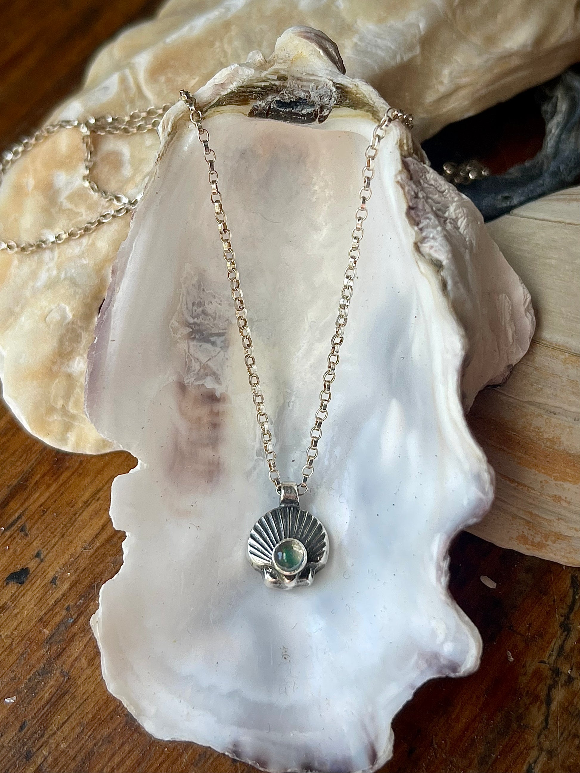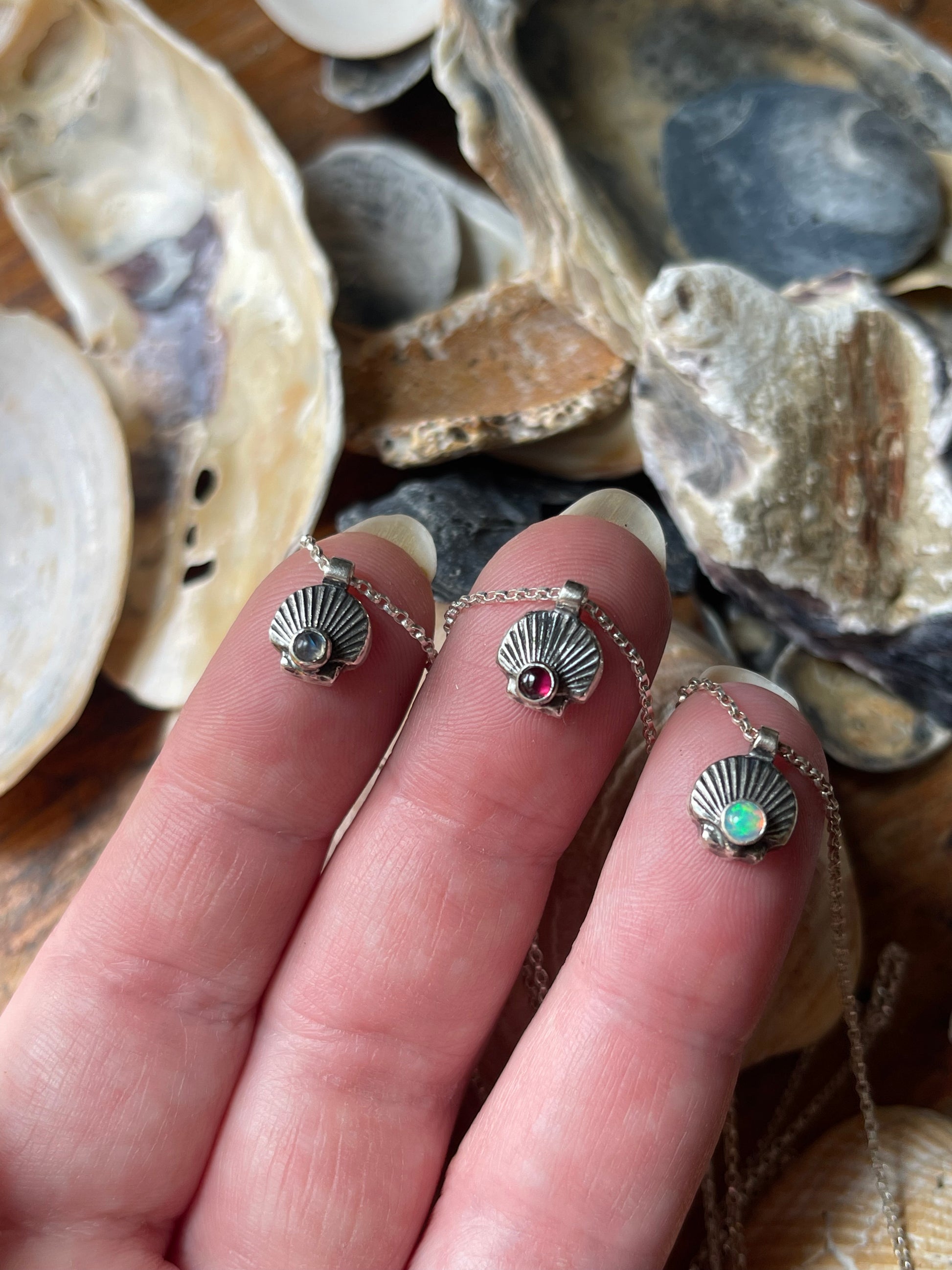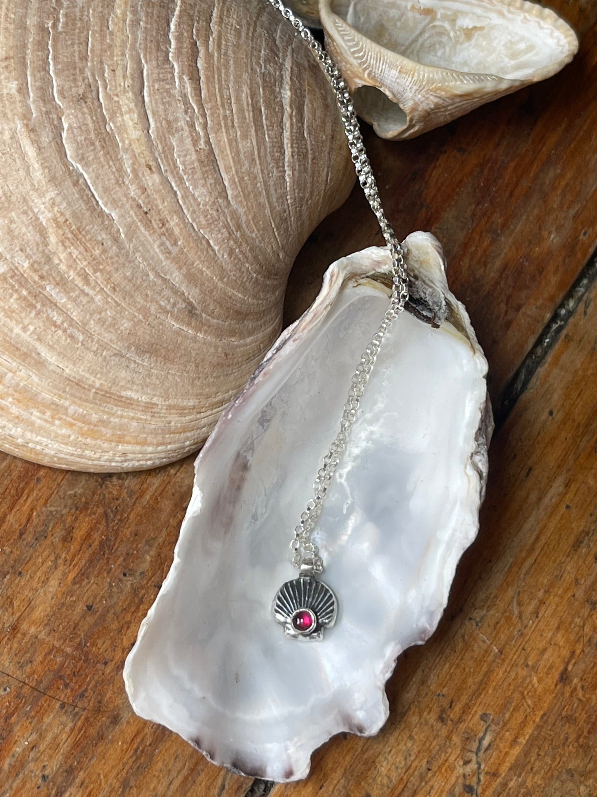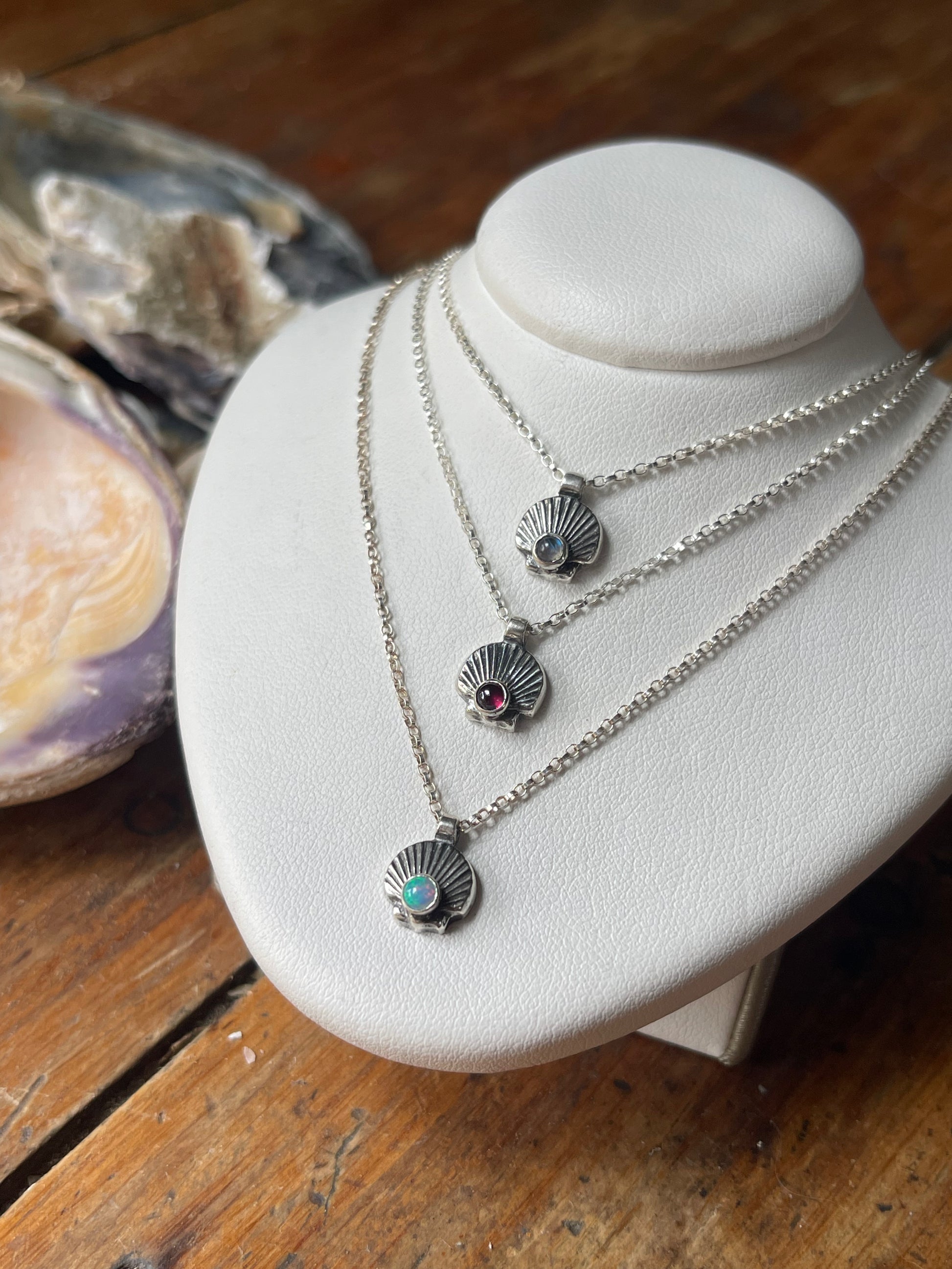 Dive in and make a splash with Ariel's Charm! This simple and sleek made to order necklace features a scallop shell made of thick, recycled silver with a beautiful, eye-catching gemstone accent; Choose between a glowing rainbow moonstone, bold pink garnet, or an iridescent opal. This charm glides effortlessly on a 15-inch small sterling silver rolo chain with a secure hook clasp. An eco-friendly piece with a vintage art deco vibe that will stand out in your jewelry box.