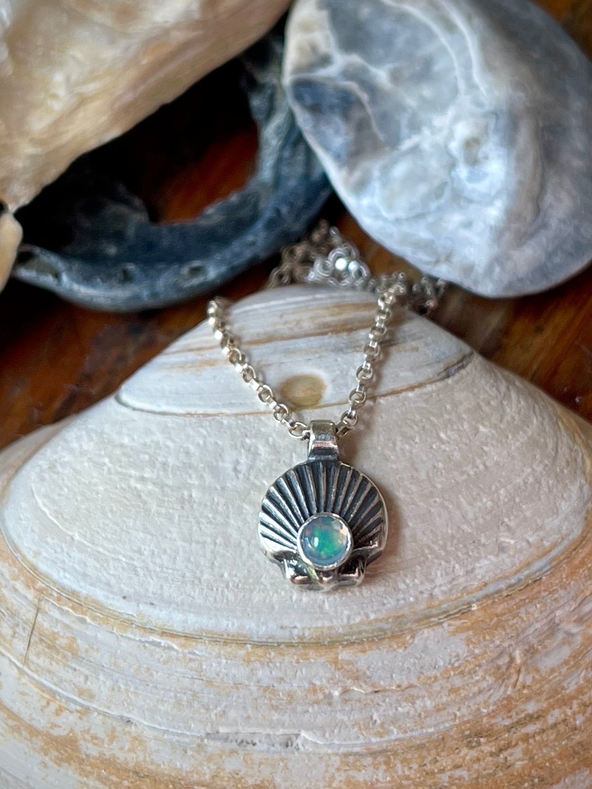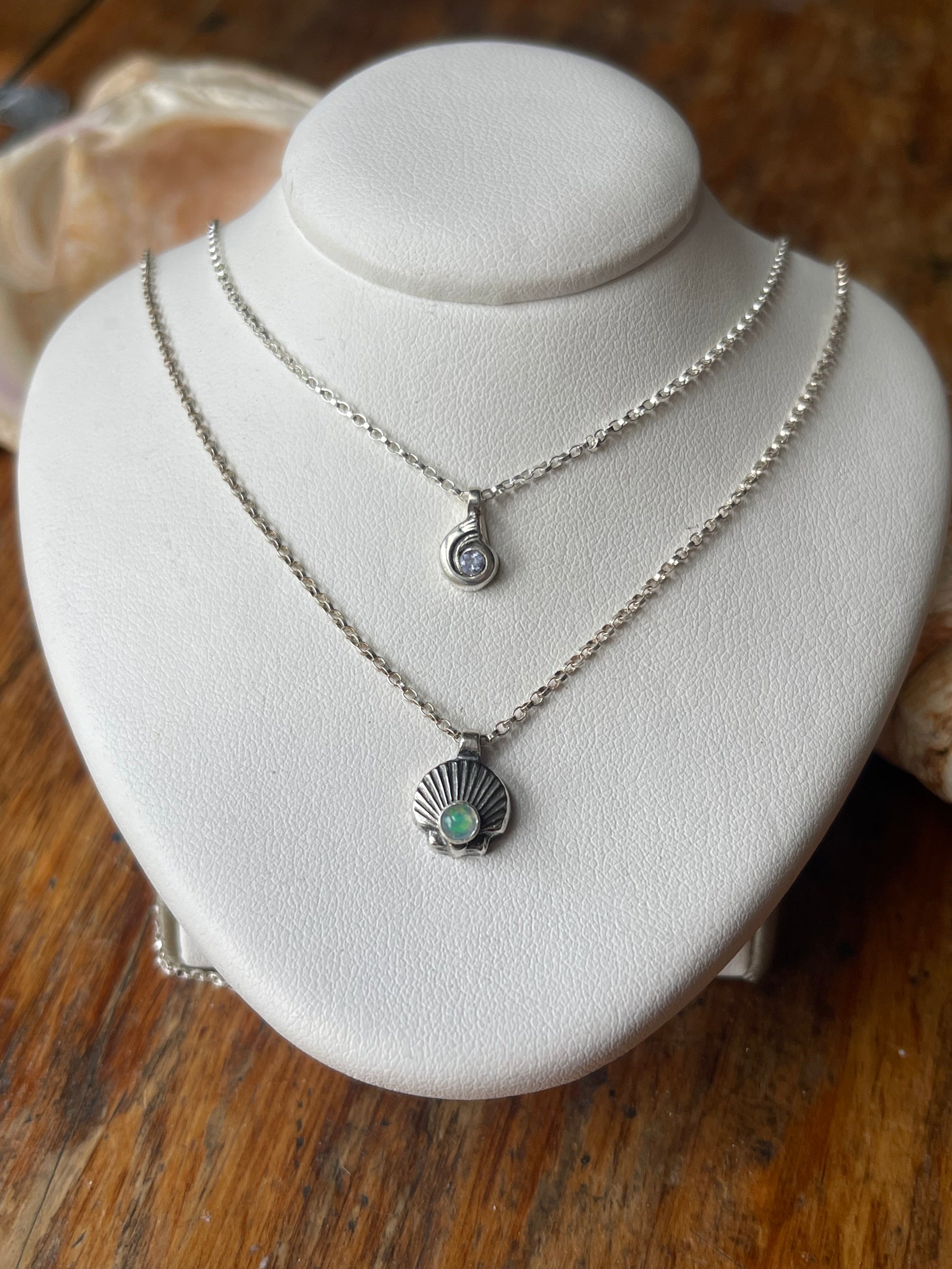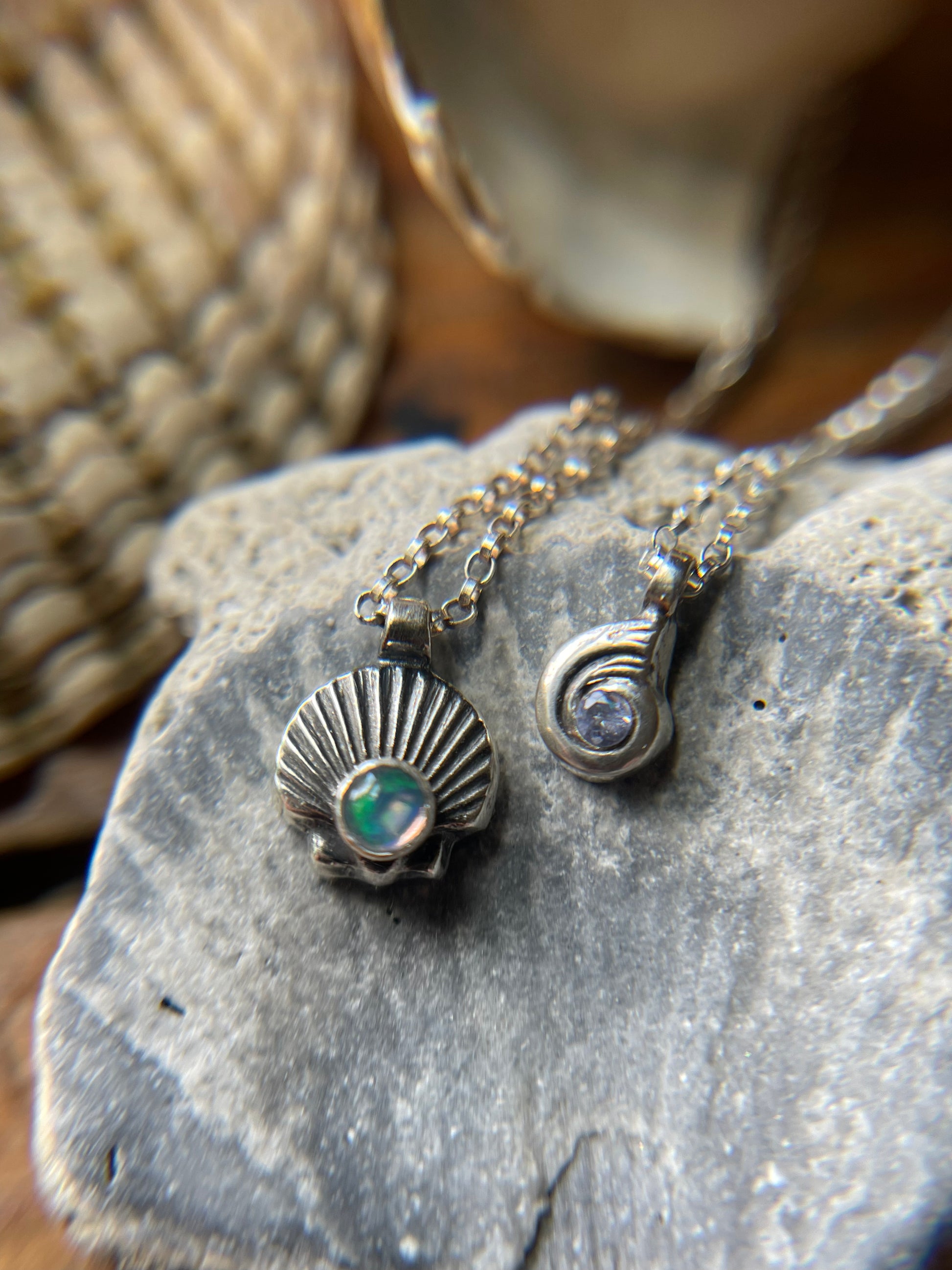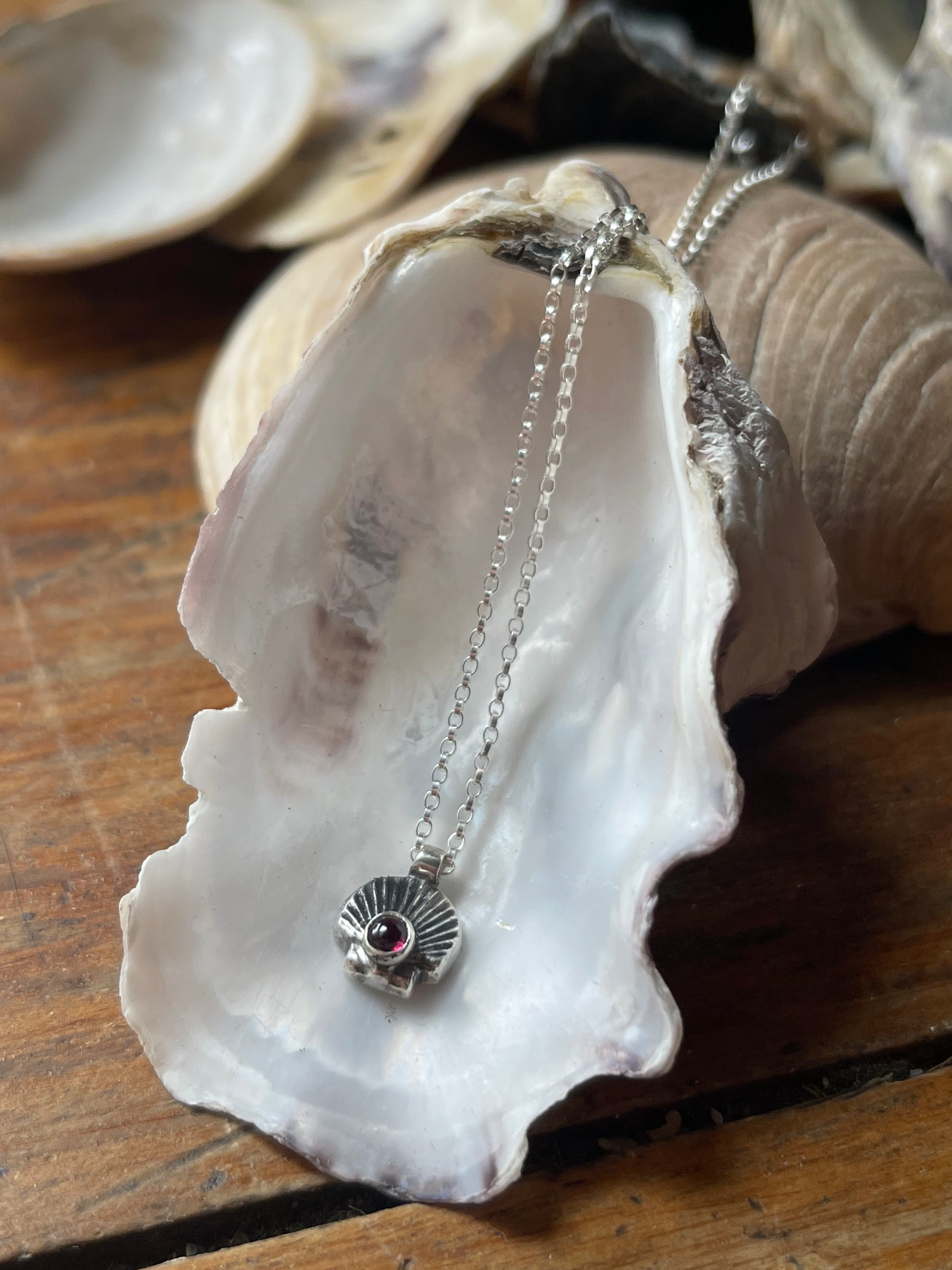 Dive in and make a splash with Ariel's Charm! This simple and sleek made to order necklace features a scallop shell made of thick, recycled silver with a beautiful, eye-catching gemstone accent; Choose between a glowing rainbow moonstone, bold pink garnet, or an iridescent opal. This charm glides effortlessly on a 15-inch small sterling silver rolo chain with a secure hook clasp. An eco-friendly piece with a vintage art deco vibe that will stand out in your jewelry box.