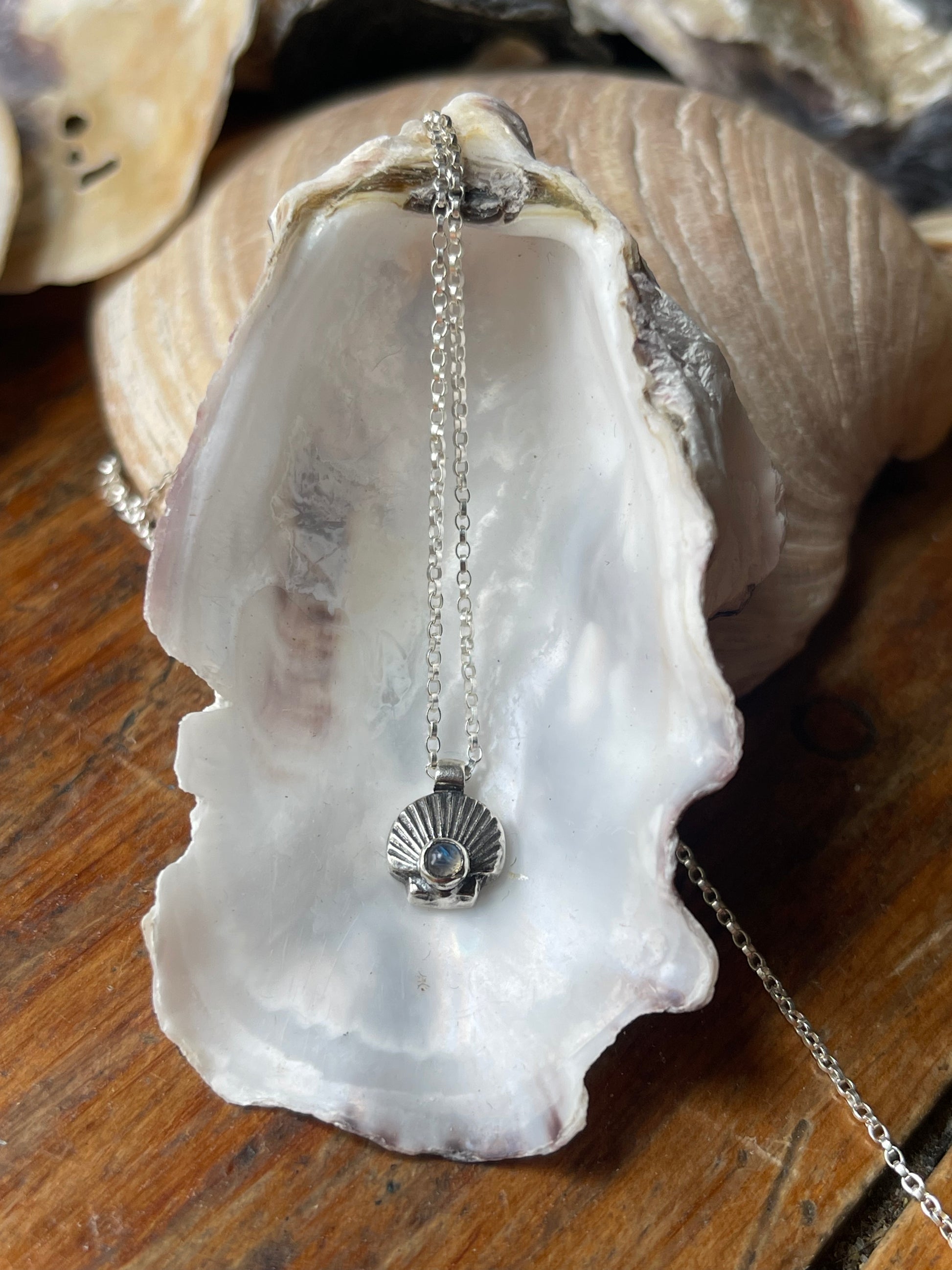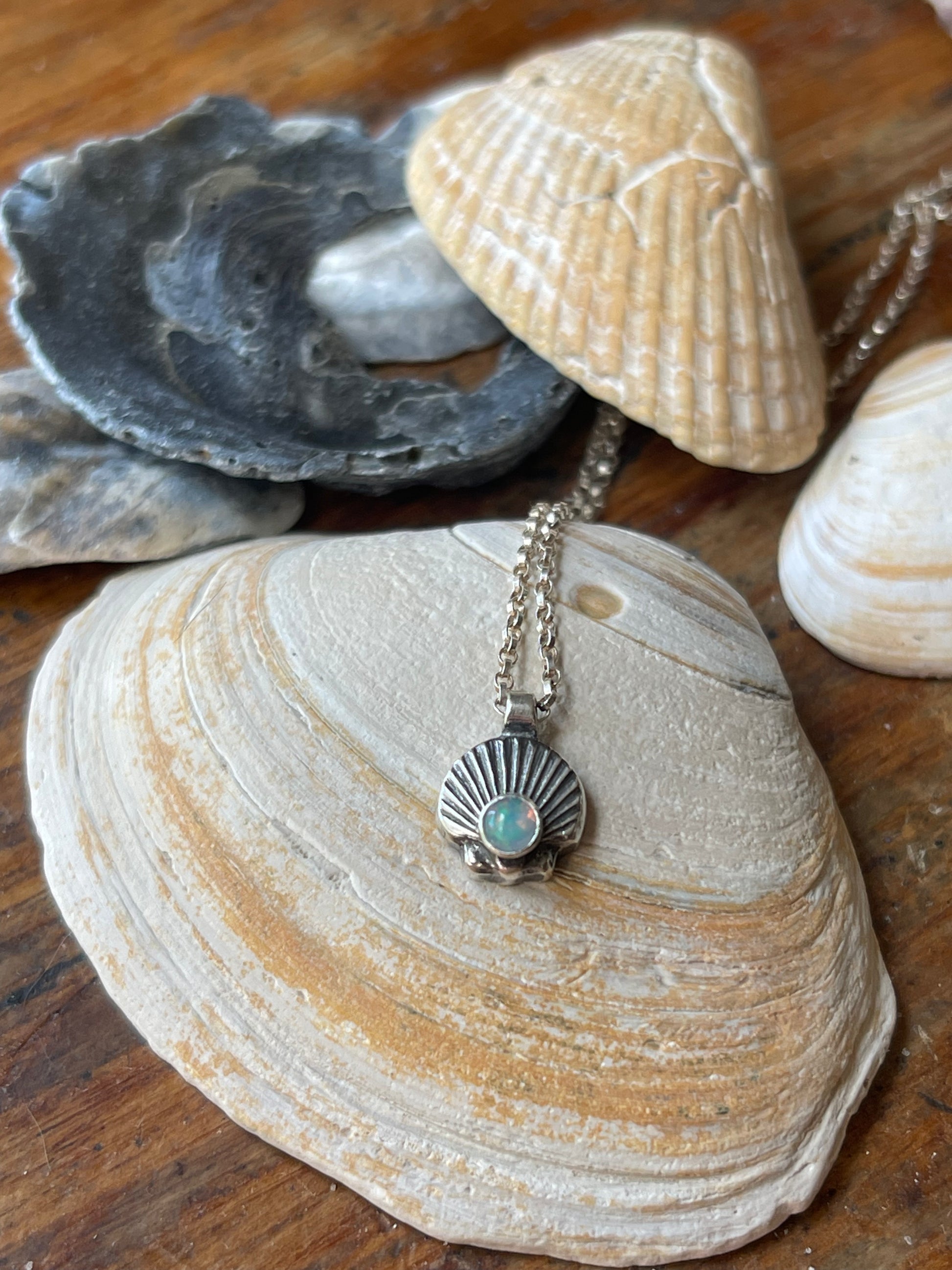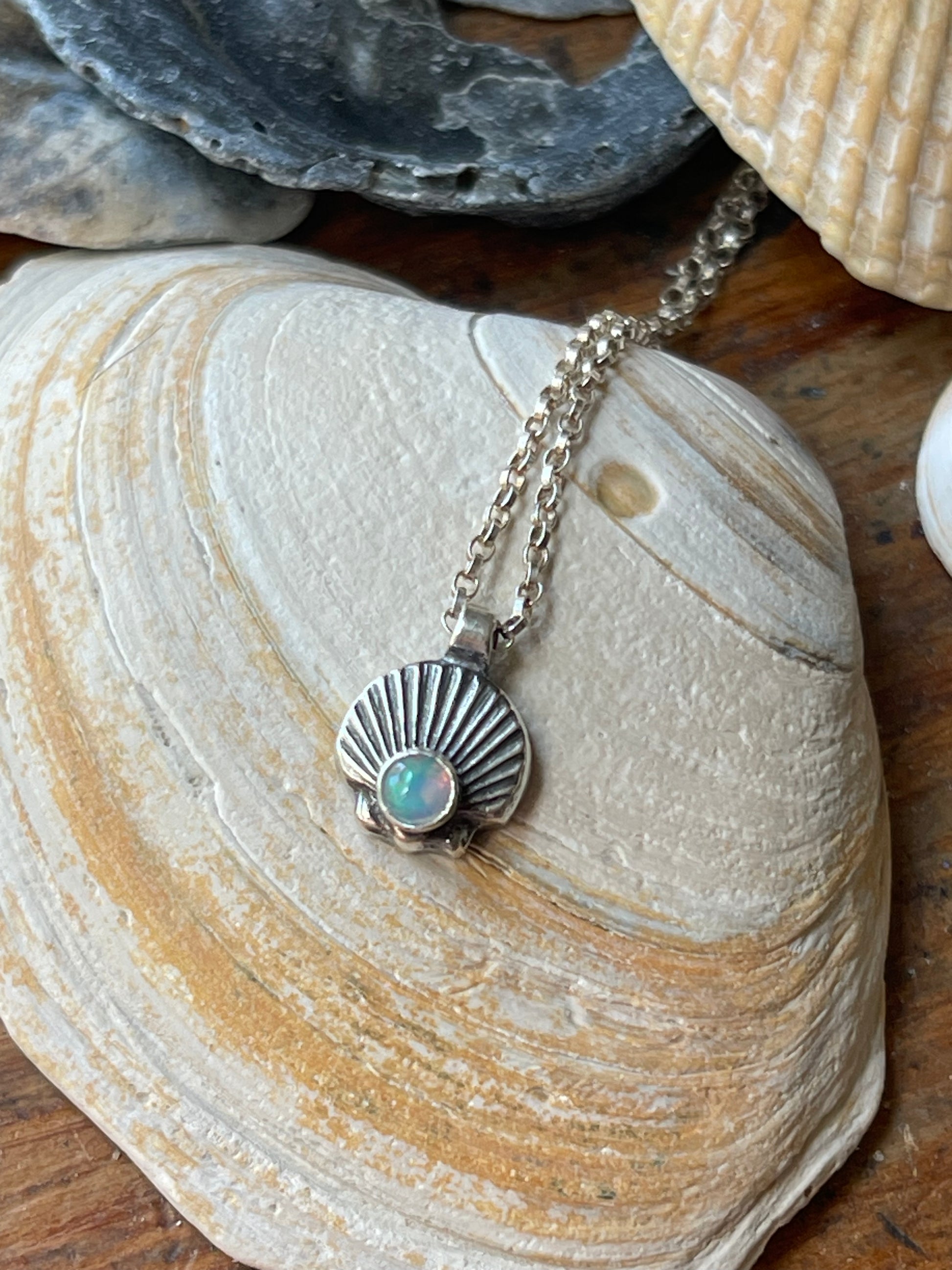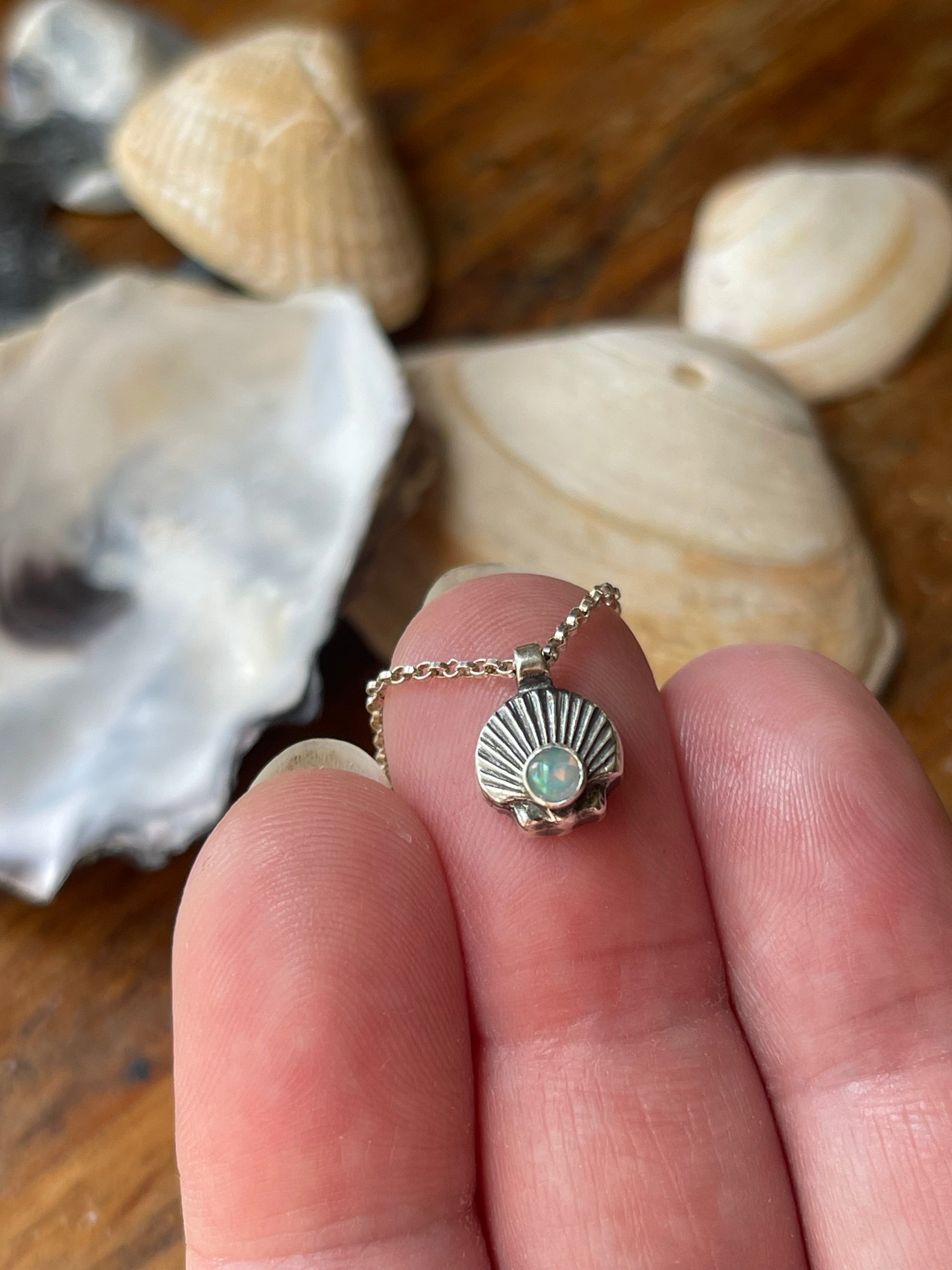 Dive in and make a splash with Ariel's Charm! This simple and sleek made to order necklace features a scallop shell made of thick, recycled silver with a beautiful, eye-catching gemstone accent; Choose between a glowing rainbow moonstone, bold pink garnet, or an iridescent opal. This charm glides effortlessly on a 15-inch small sterling silver rolo chain with a secure hook clasp. An eco-friendly piece with a vintage art deco vibe that will stand out in your jewelry box.