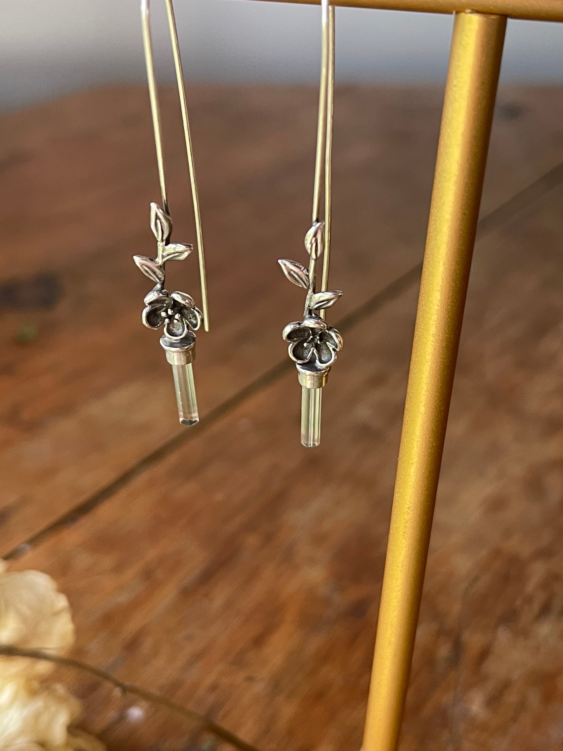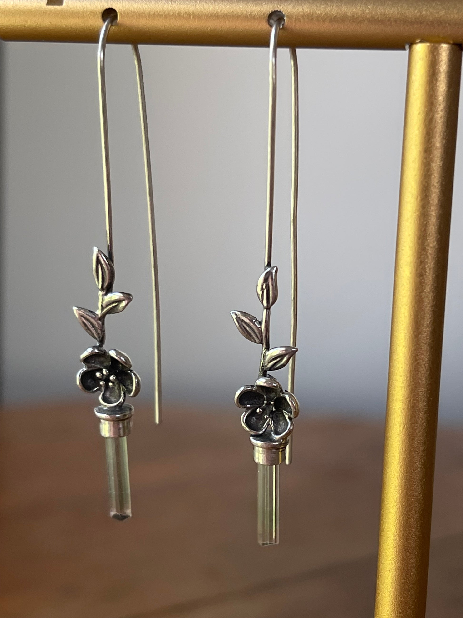 Graceful and full of quiet bloom, Blooms on the Vine earrings bring natural elegance to every movement. Handcrafted in sterling silver, each pair features stunning Afghani Watermelon Tourmaline crystals—light green with soft blush-pink tips, like spring captured in stone. Climbing up each crystal are solid silver cherry blossom flowers and delicate leaves, adding a touch of botanical romance. Long, lightweight, and refined, these earrings are easy to wear and safe for sensitive ears—perfect for those who love their sparkle with a story.
