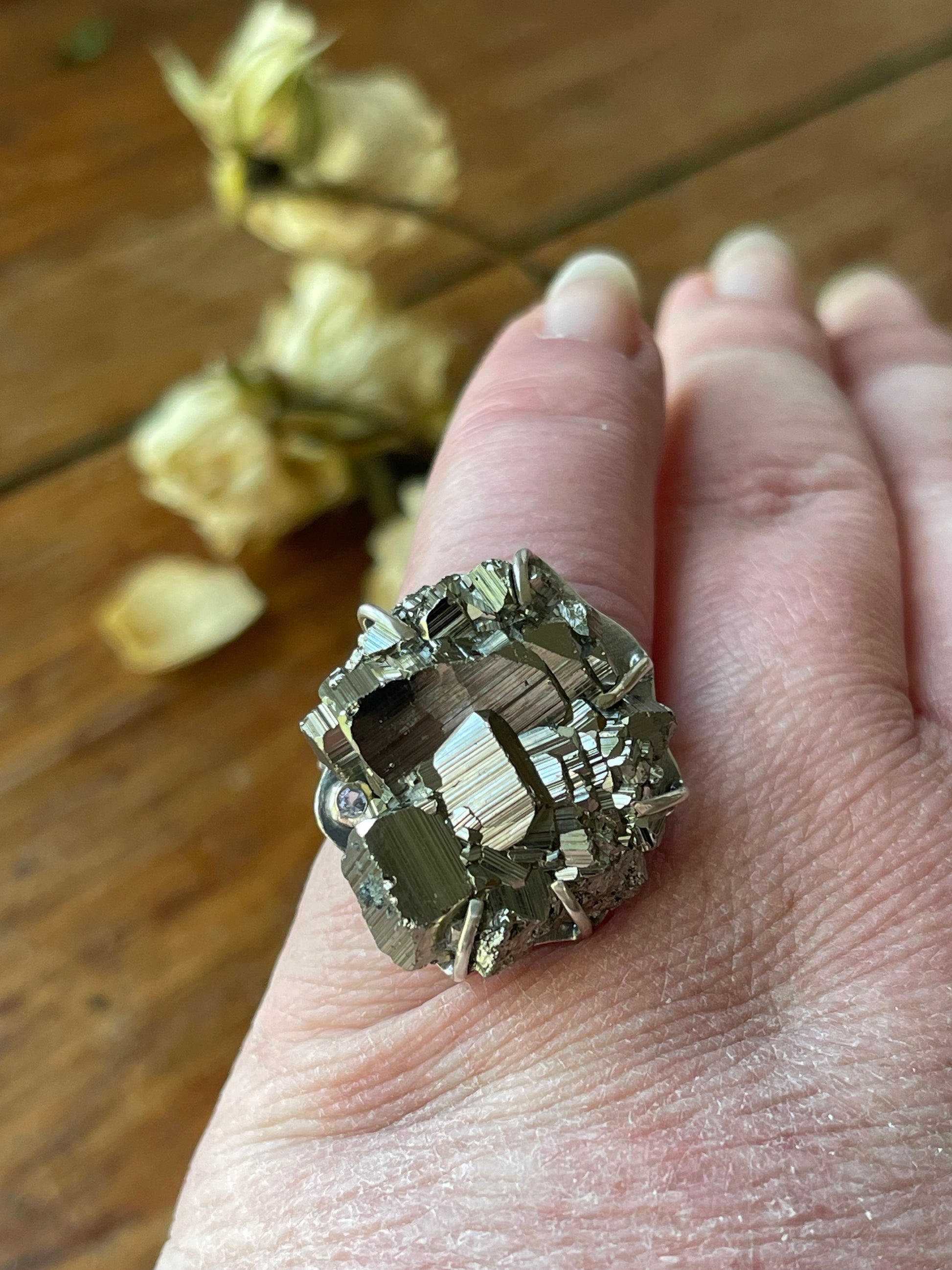 Rugged beauty meets celestial shimmer in the Celtic Cliffs statement ring. Handcrafted in sterling silver, this one-of-a-kind piece showcases a truly extraordinary pyrite—its raw, angular surfaces catch the light from every angle, radiating golden brilliance. Like sunlight striking stone, the pyrite’s dramatic textures evoke ancient cliffs carved by time. Tucked beneath its surface, a small tanzanite gemstone gleams through a natural break in the pyrite, adding an unexpected pop of cool color and contrast. Set on a thick silver band with a textured center, this ring is a bold tribute to nature’s power and elegance—epic, earthy, and unforgettable.