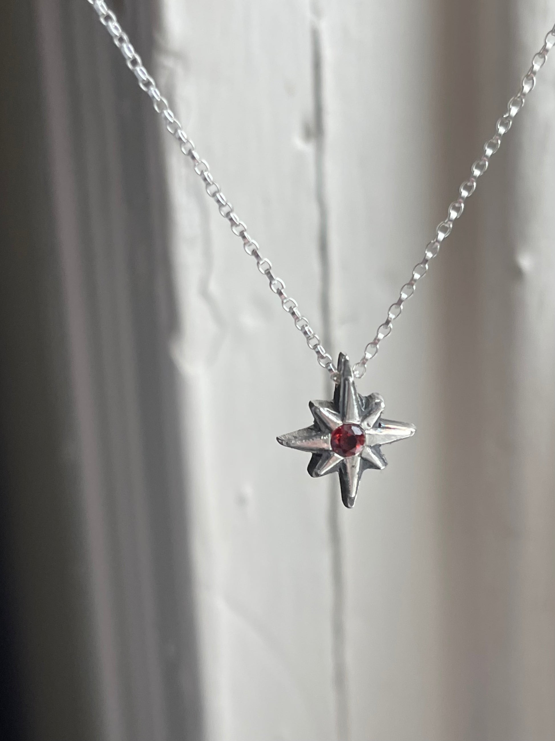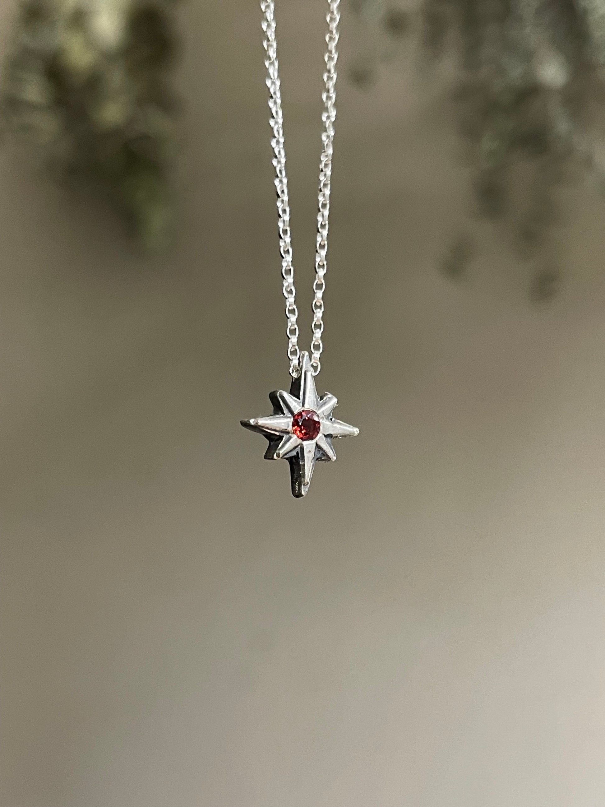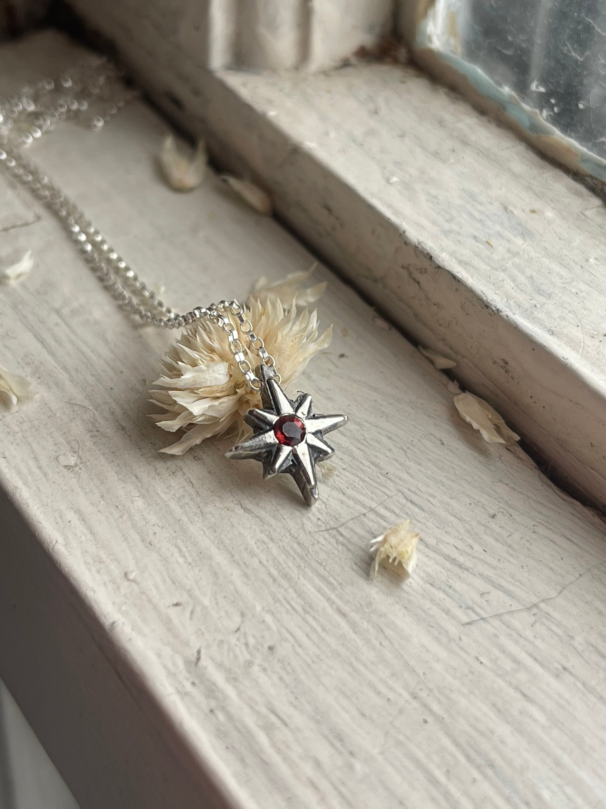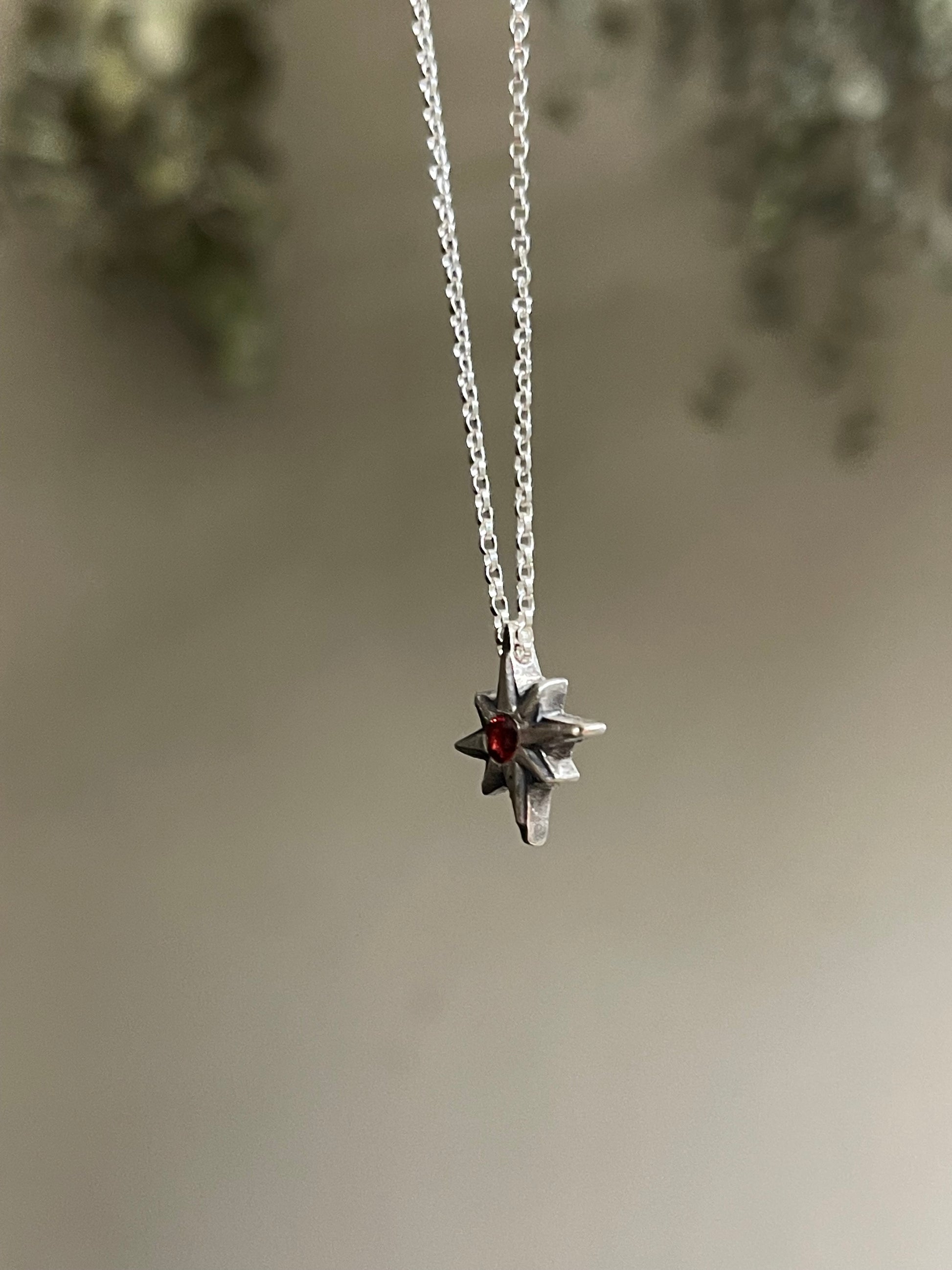 A striking and vibrant statement piece, the **Dark Star Charm Necklace** is handcrafted from recycled sterling silver, embodying both strength and elegance. At its heart lies a faceted, deep red garnet—bold and captivating in its rich hue. Known for being the January birthstone and therefore one of the stones for the zodiac sign of Capricorn, garnet brings a sense of grounding energy and determination to the wearer.