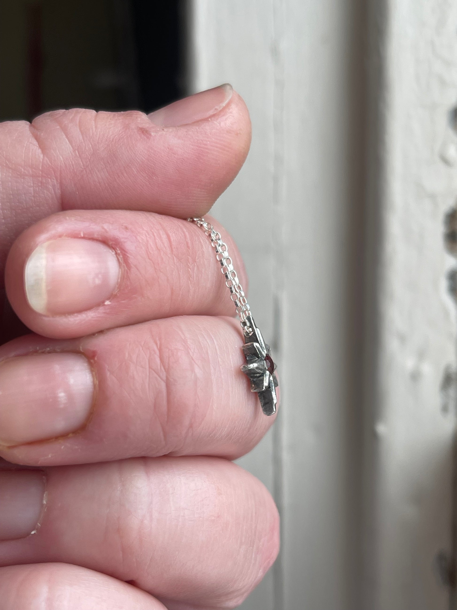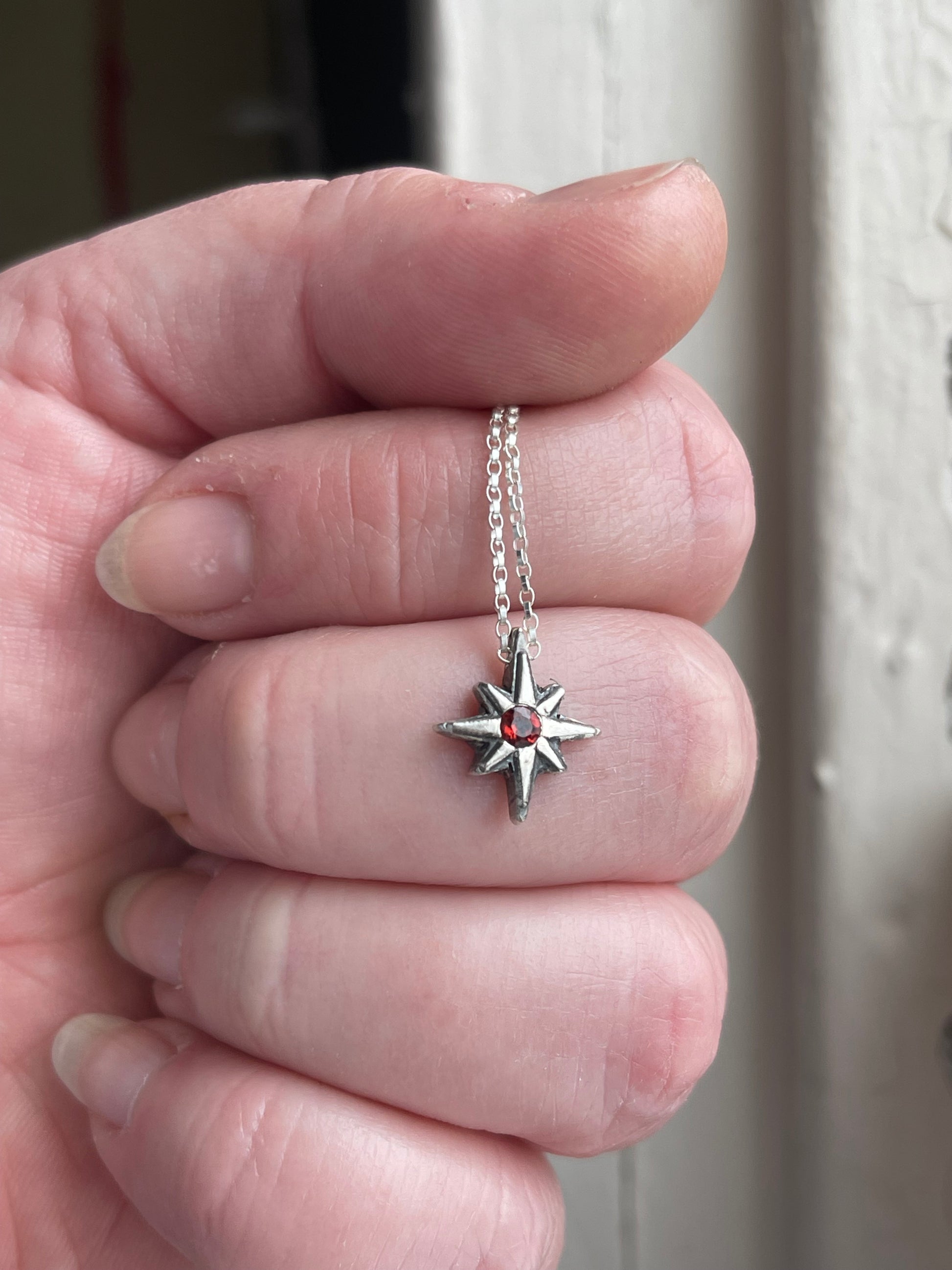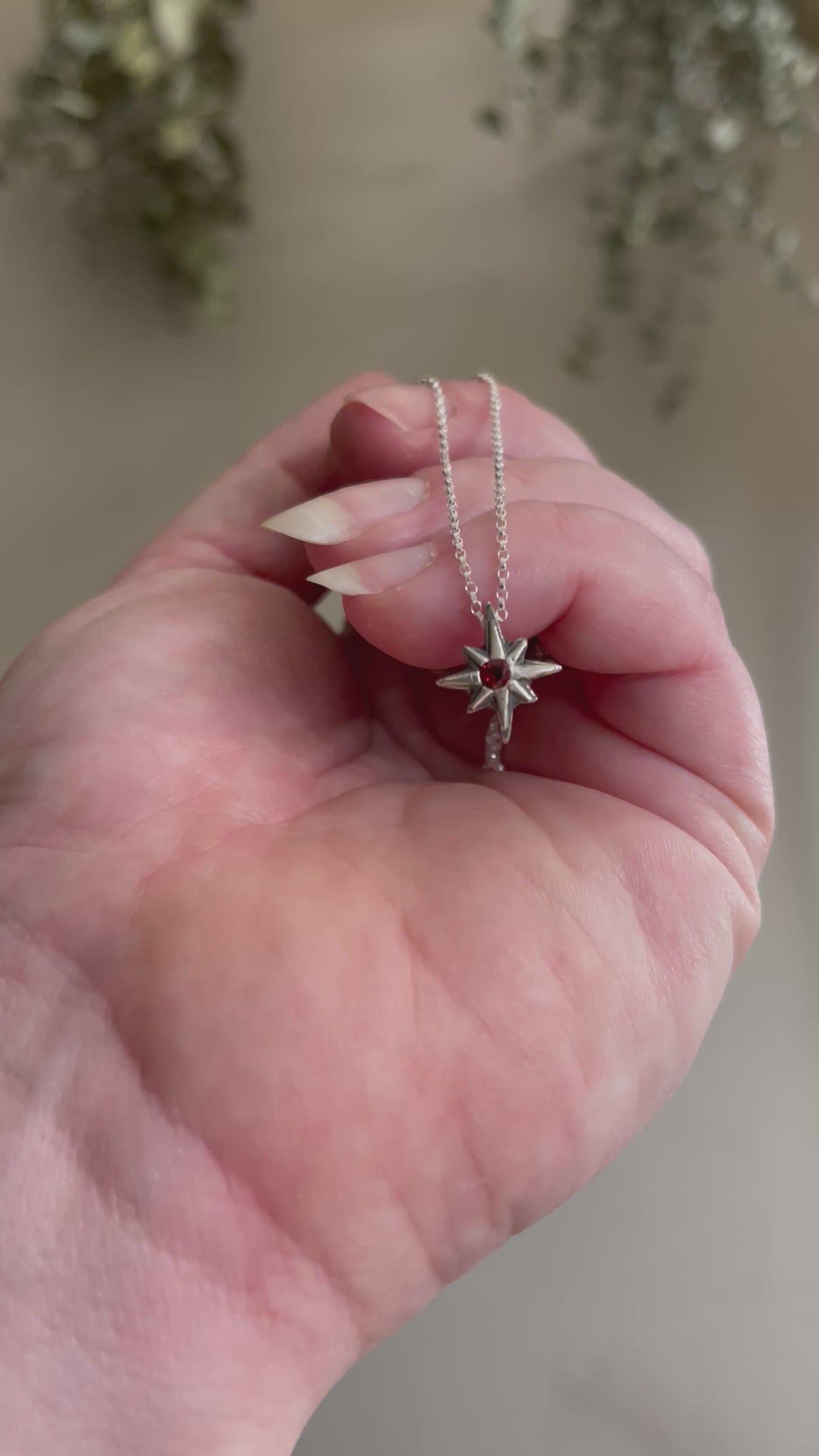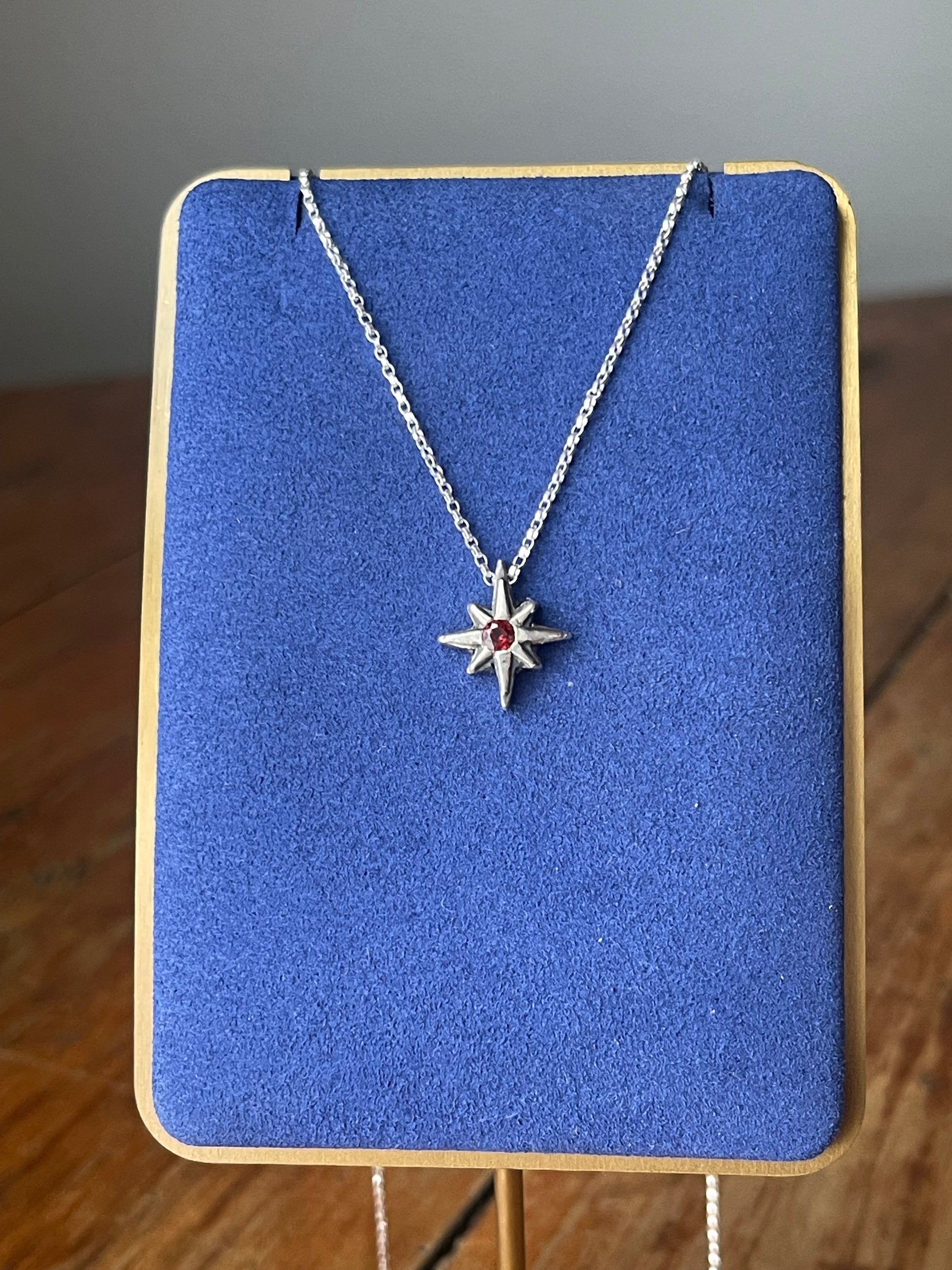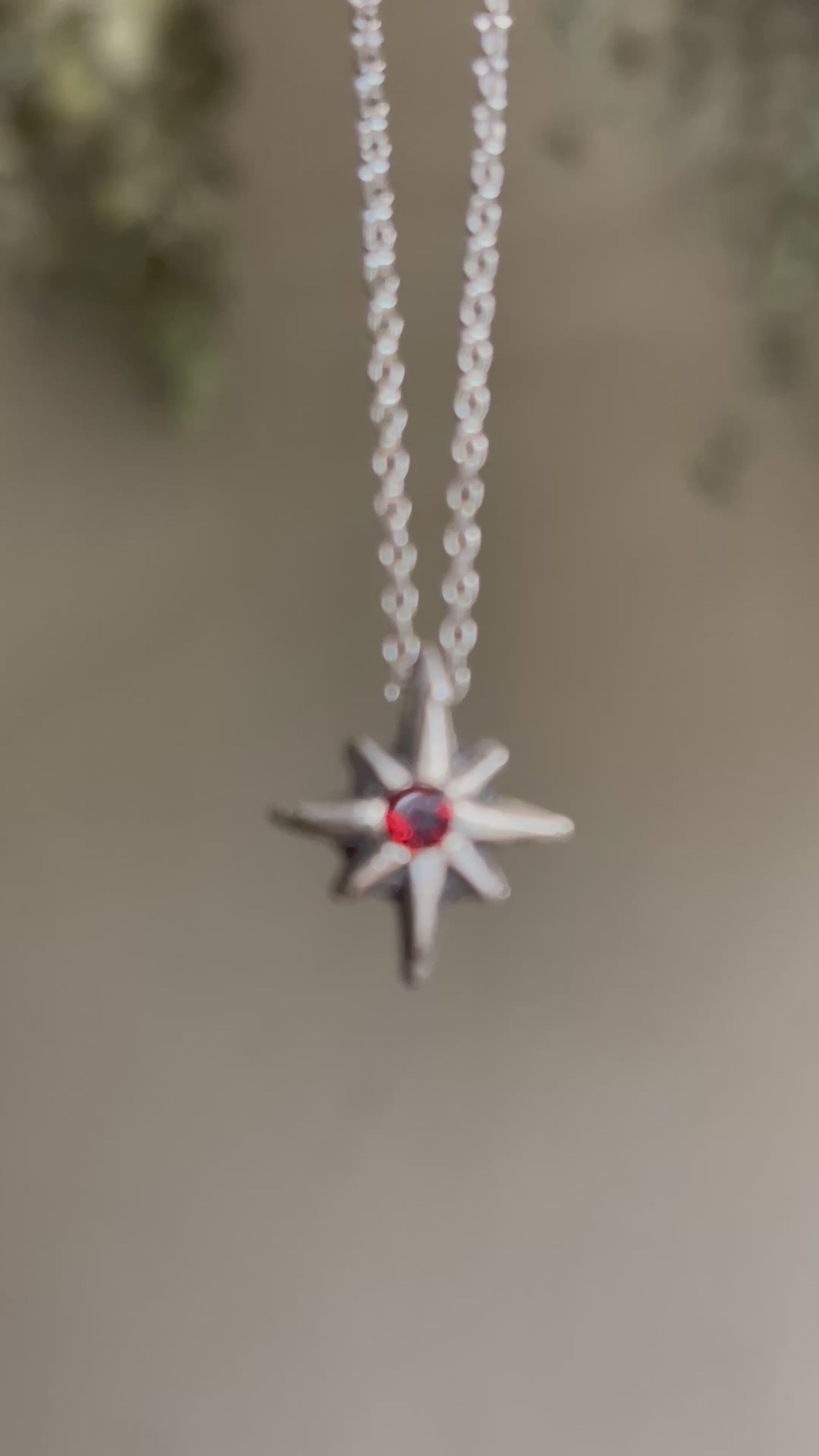 A striking and vibrant statement piece, the **Dark Star Charm Necklace** is handcrafted from recycled sterling silver, embodying both strength and elegance. At its heart lies a faceted, deep red garnet—bold and captivating in its rich hue. Known for being the January birthstone and therefore one of the stones for the zodiac sign of Capricorn, garnet brings a sense of grounding energy and determination to the wearer.