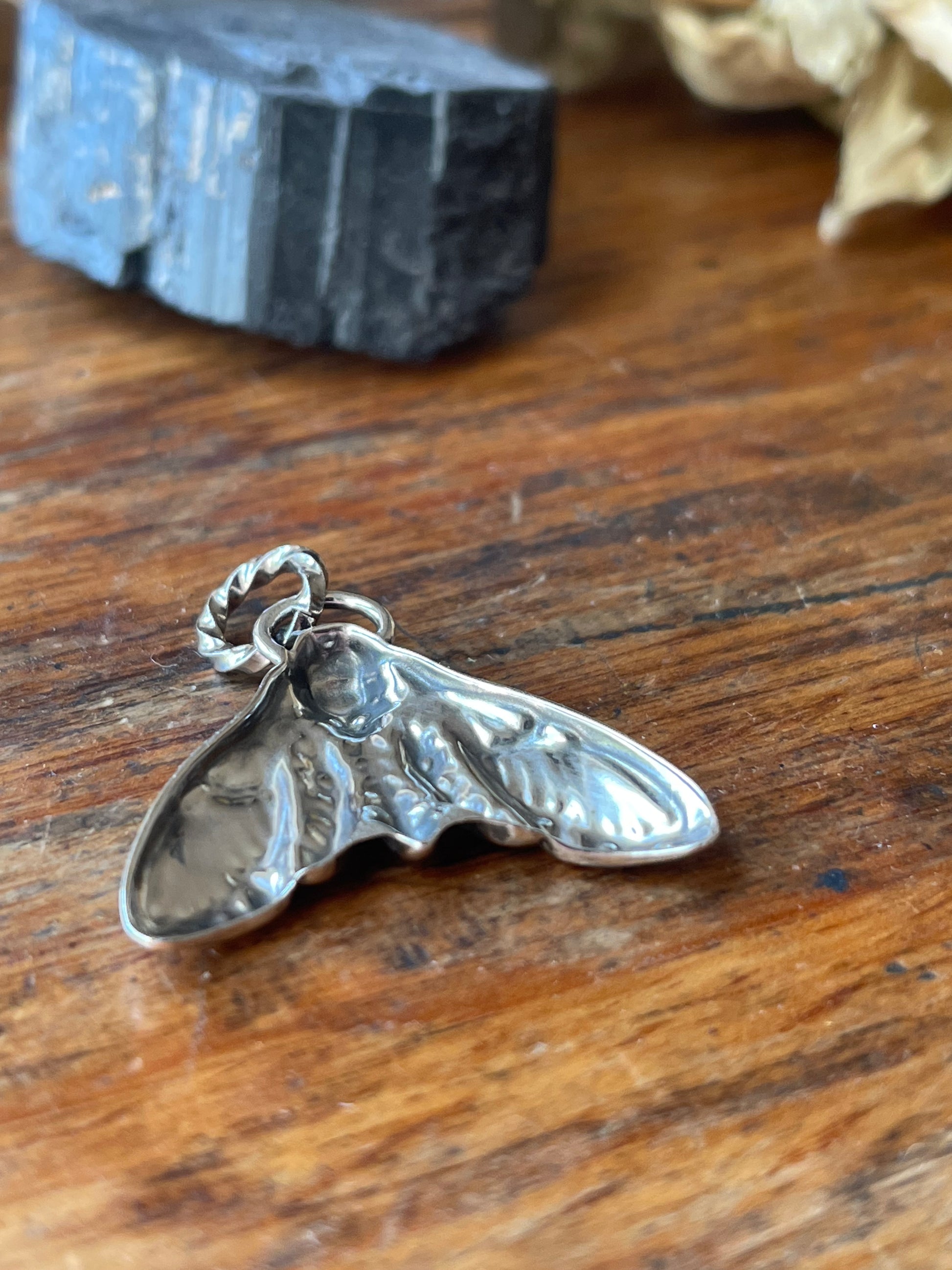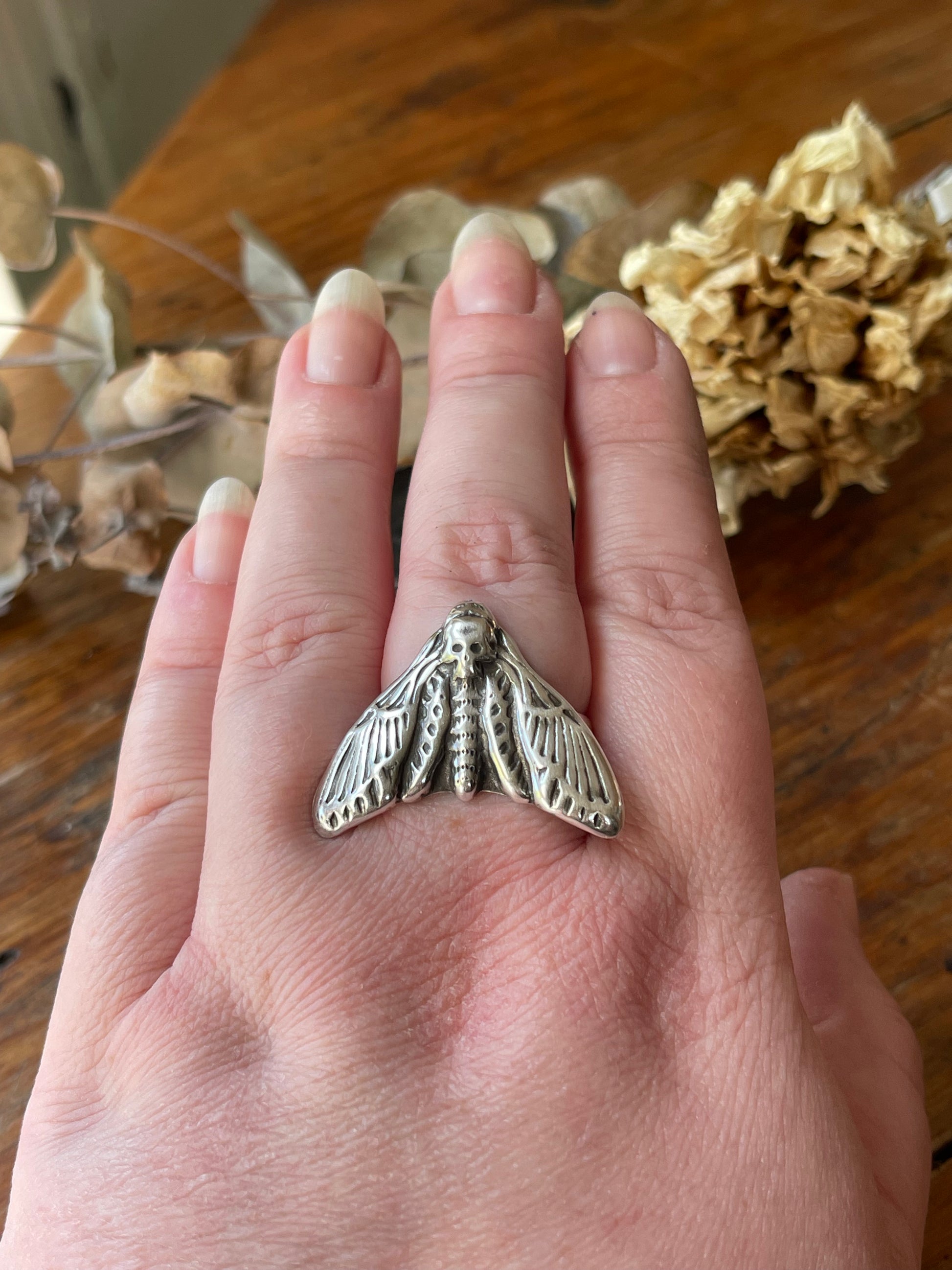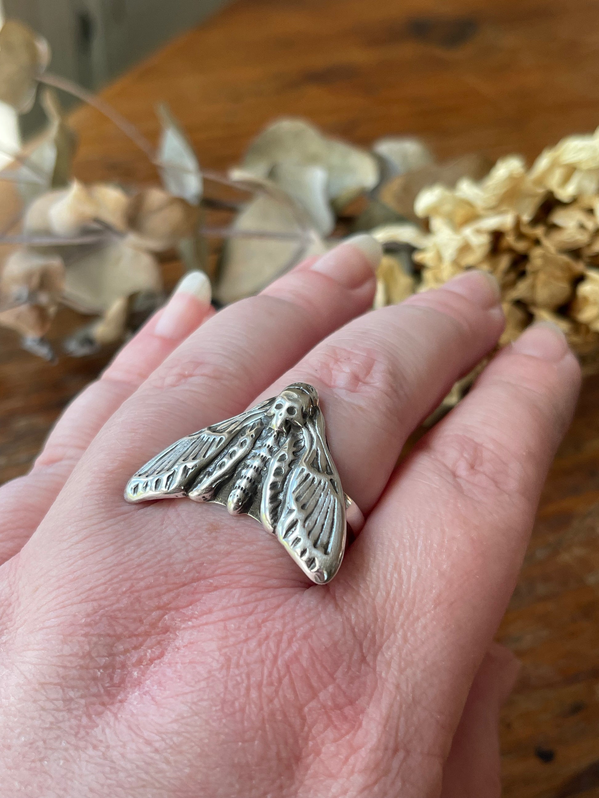 Stand out with this daring and bold combination of sterling silver deathmoth pendant and ring. Handcrafted with a steel impression die and hydraulic press, each piece is pressed in thick sterling silver, ensuring exclusive detail and superior quality. Choose between a pendant or a ring (or get both for a complete set!) and make a statement with The Dwelling Gem's newest handmade-to-order jewel!
