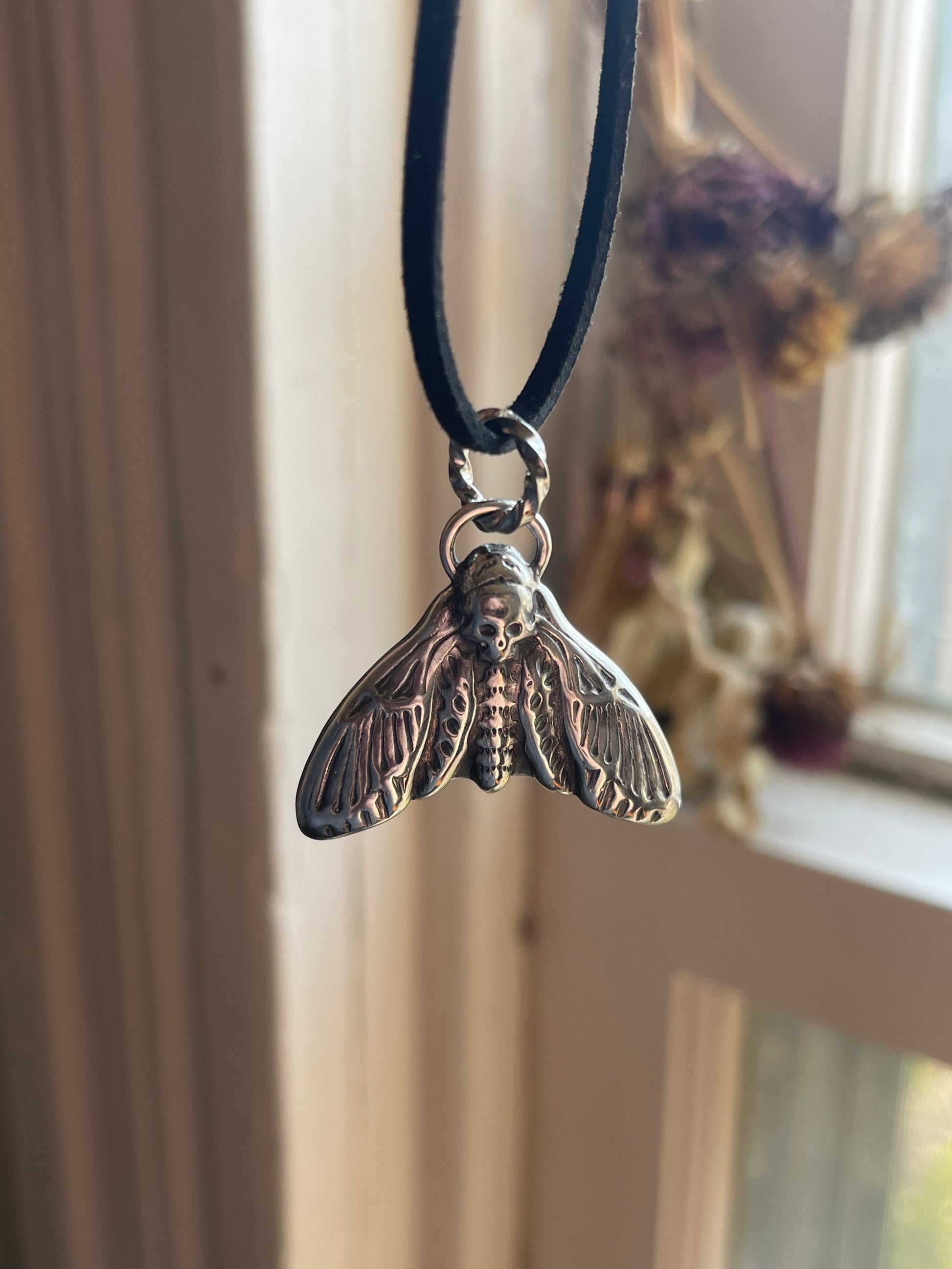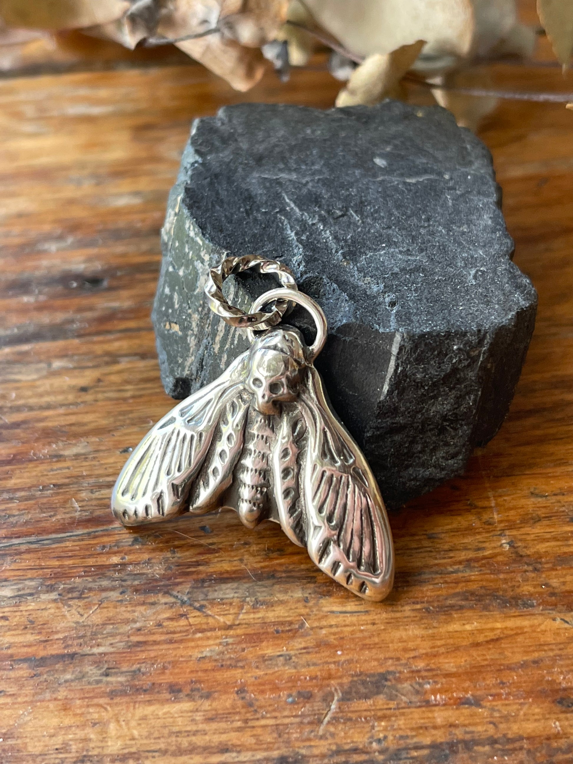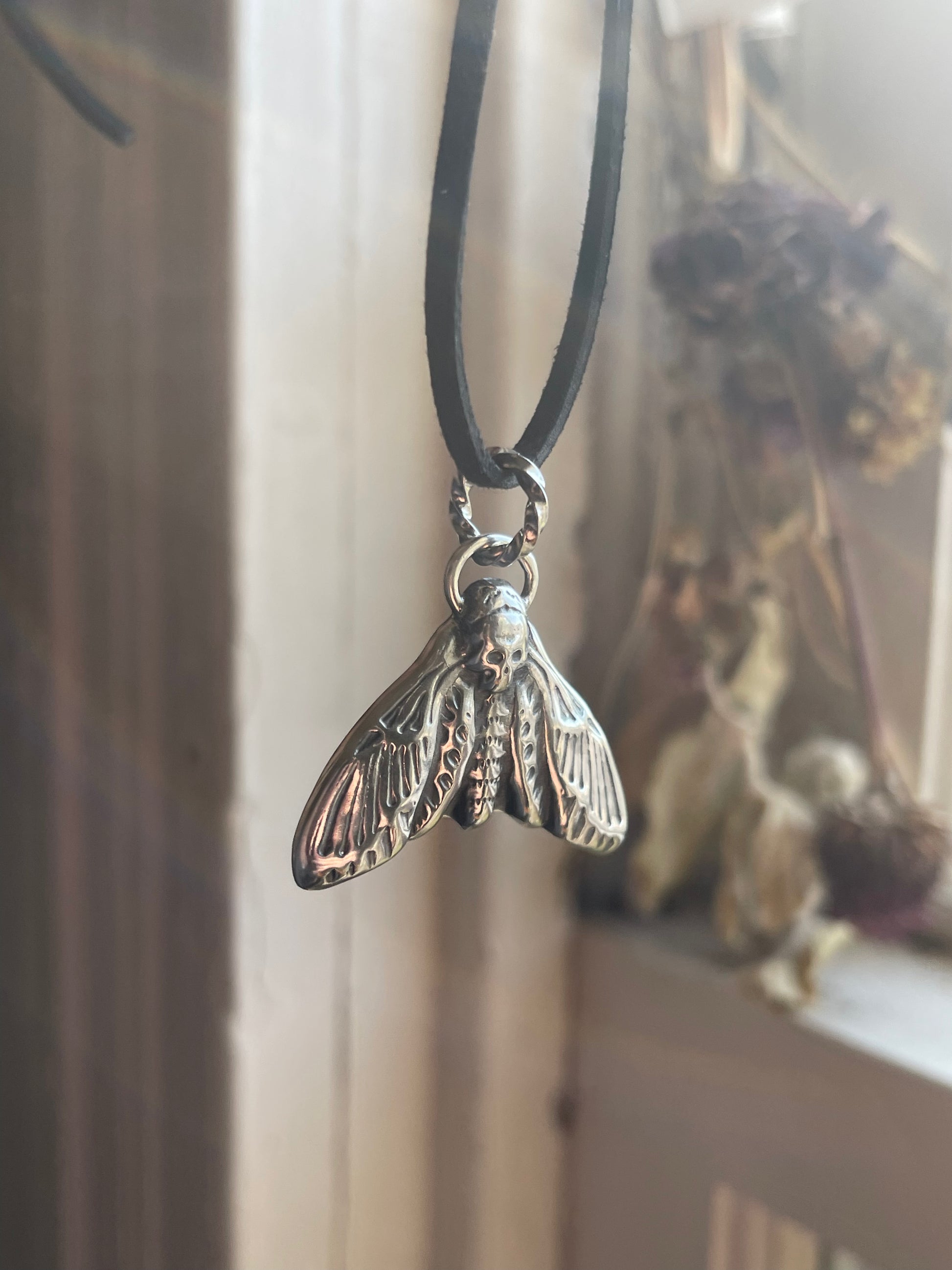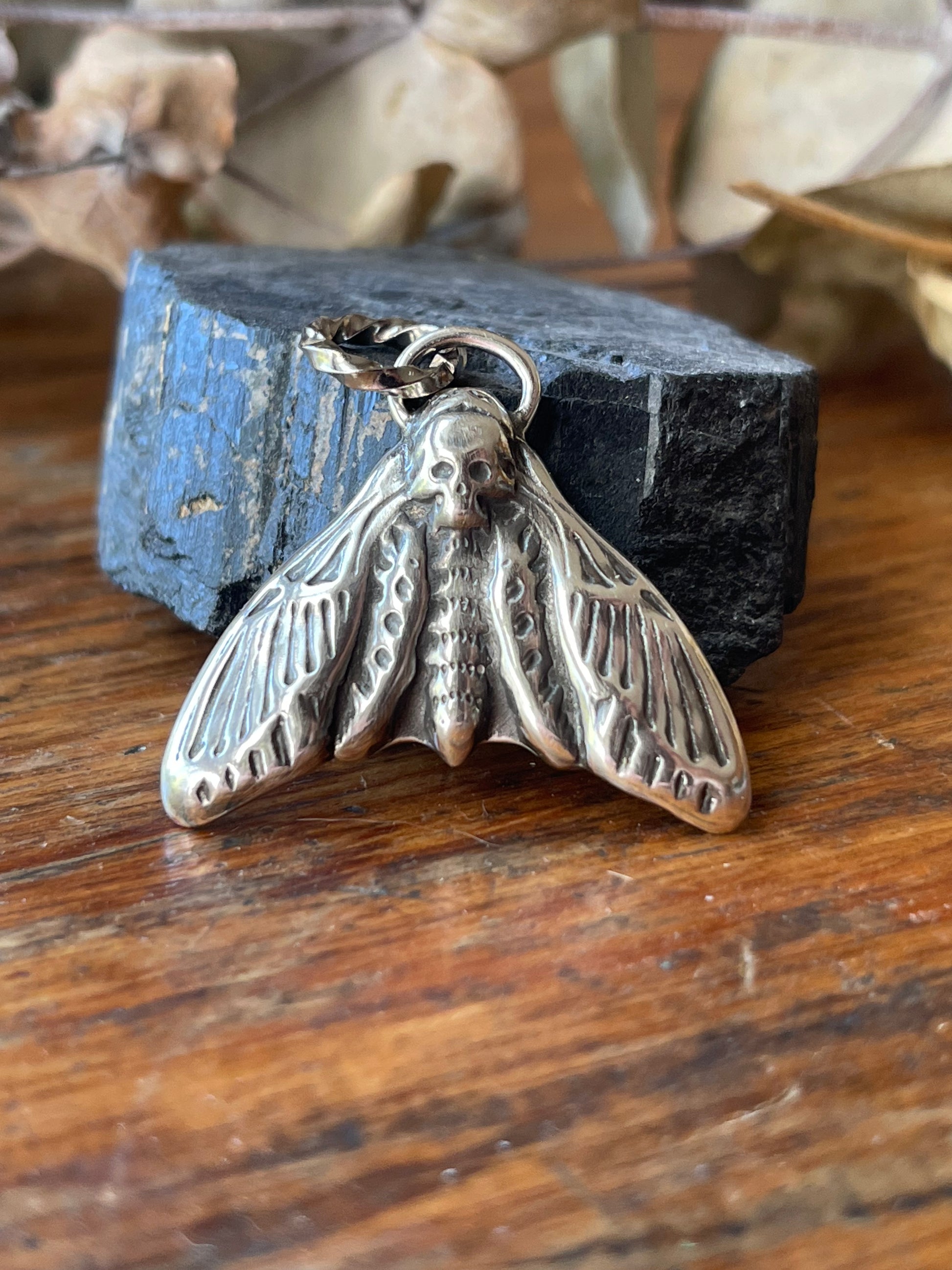 Stand out with this daring and bold combination of sterling silver deathmoth pendant and ring. Handcrafted with a steel impression die and hydraulic press, each piece is pressed in thick sterling silver, ensuring exclusive detail and superior quality. Choose between a pendant or a ring (or get both for a complete set!) and make a statement with The Dwelling Gem's newest handmade-to-order jewel!