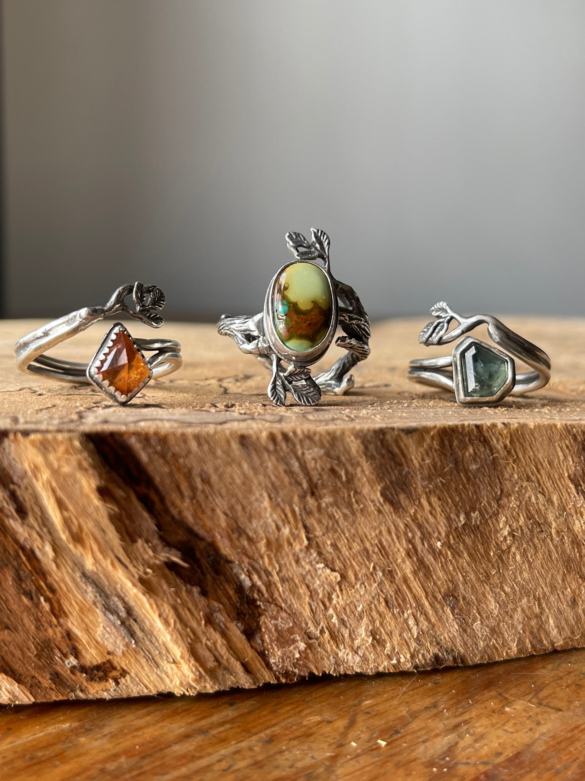 This is an adjustable, open-style ring designed for exceptional comfort and versatility. One end of the shank cradles the garnet in a handcrafted sterling setting; the other is finished with a beautifully cast leaf that wraps around the finger, perfectly framing and accenting the stone. The open design makes it an excellent choice for those whose fingers swell throughout the day, for people with arthritis, or for anyone whose knuckles are significantly larger than the base of the finger—simply adjust the ring gently to find the ideal fit.
