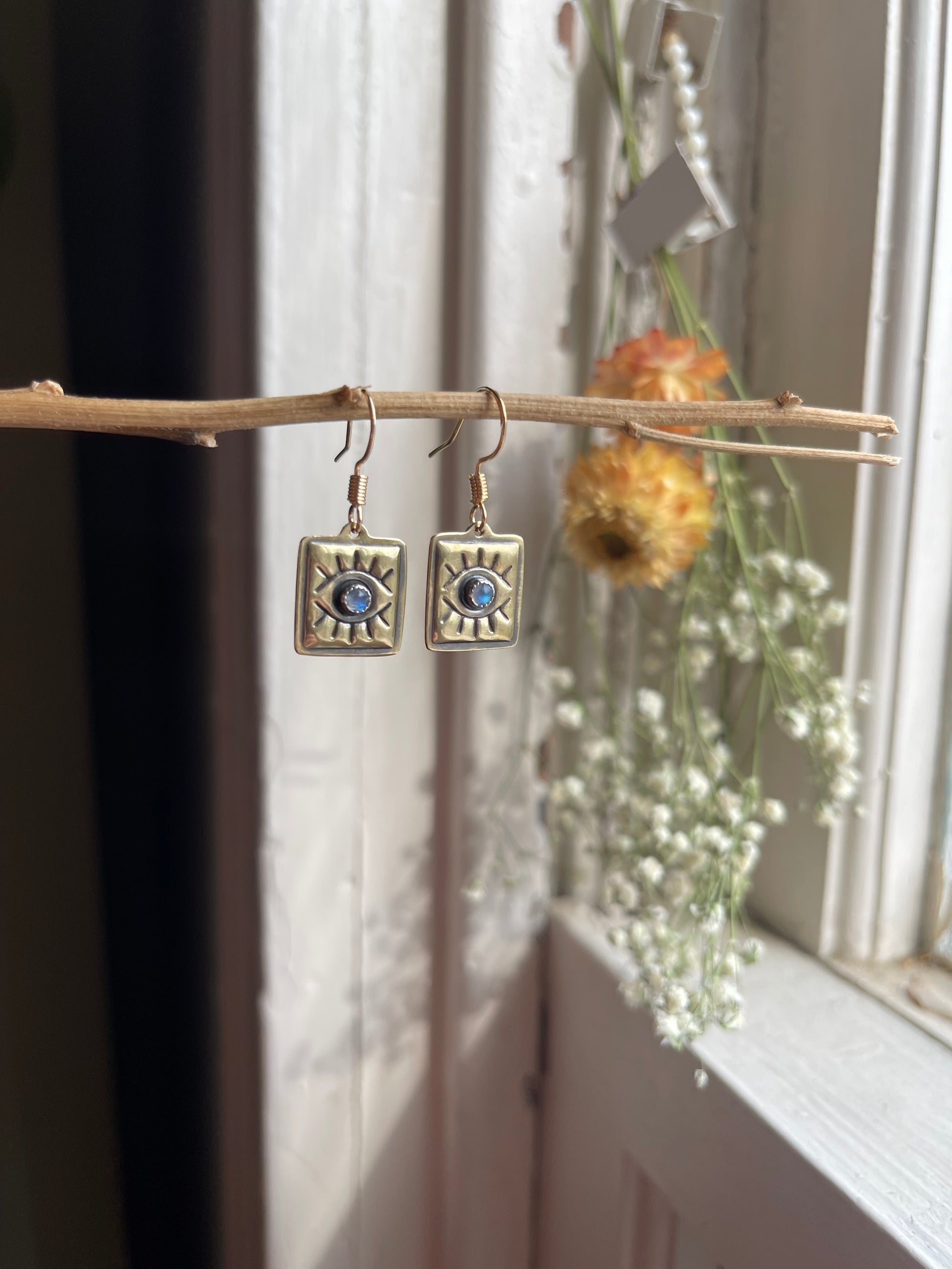 Ward off negativity and add a flash of rainbow to your style with our Evil Eye Rainbow Moonstone Earrings! These made to order earrings feature a stunning rainbow moonstone center representing the pupil of the pressed evil eye design, available in sterling silver or brass. Warding off haters has never looked this good!