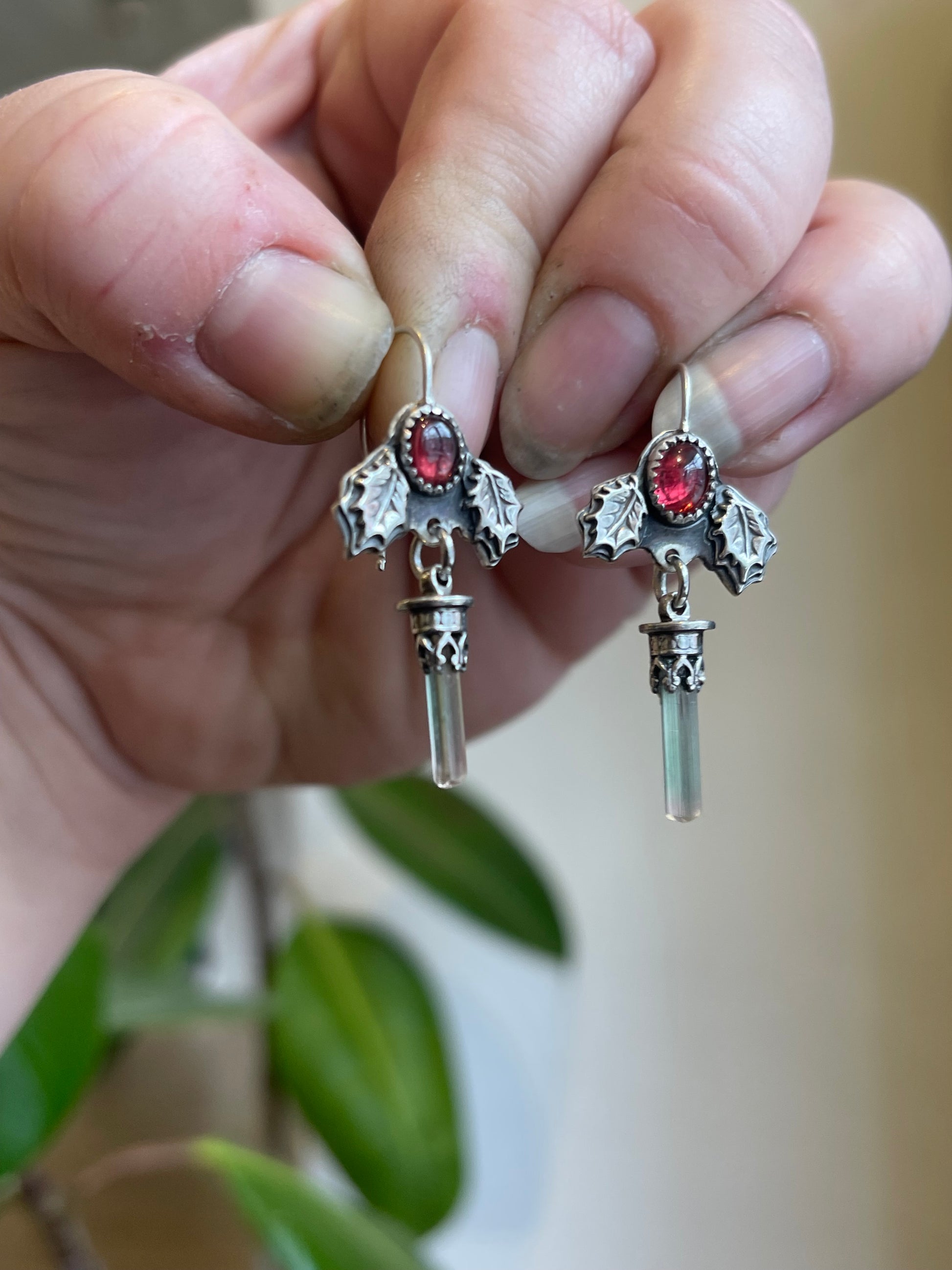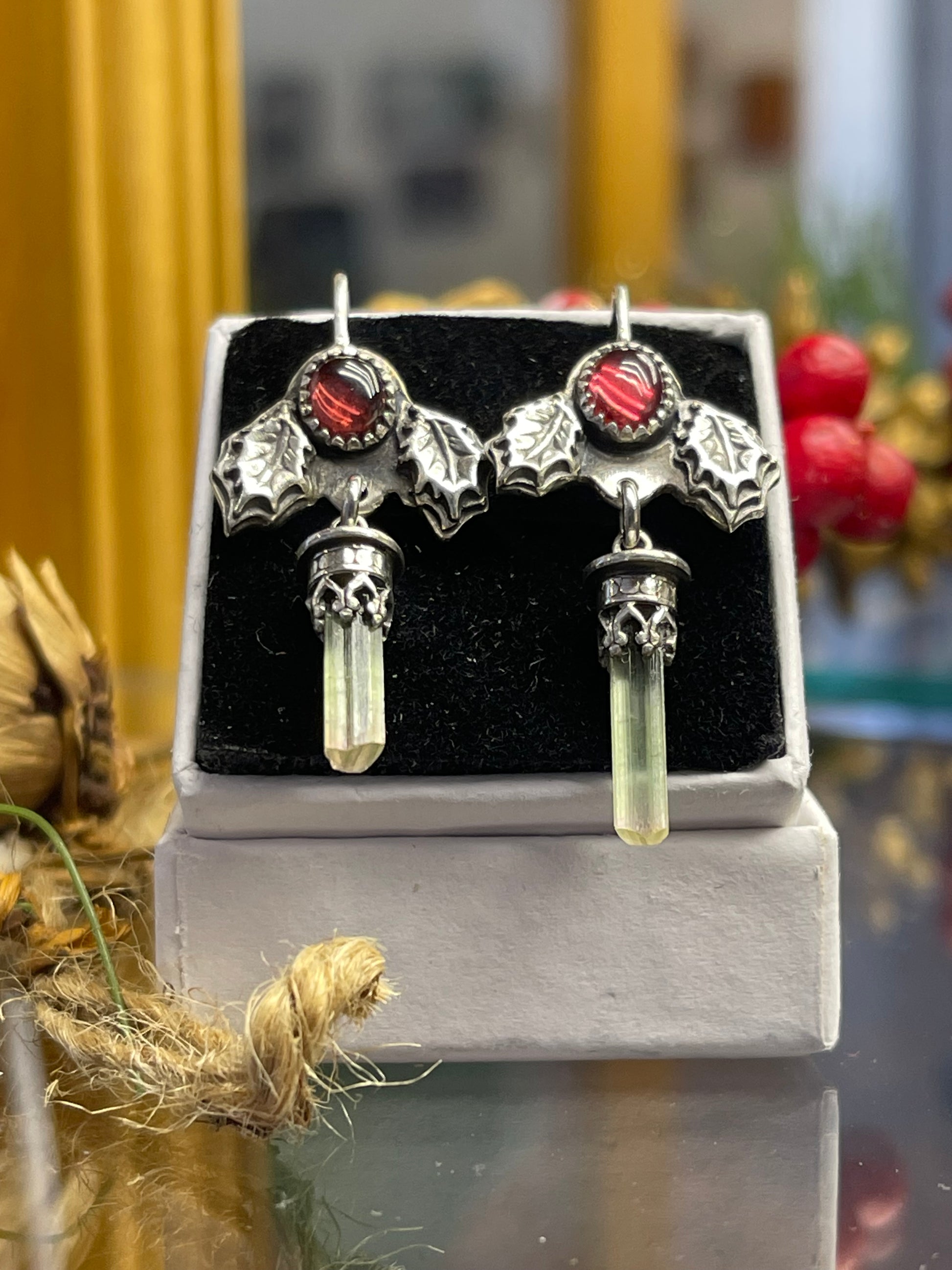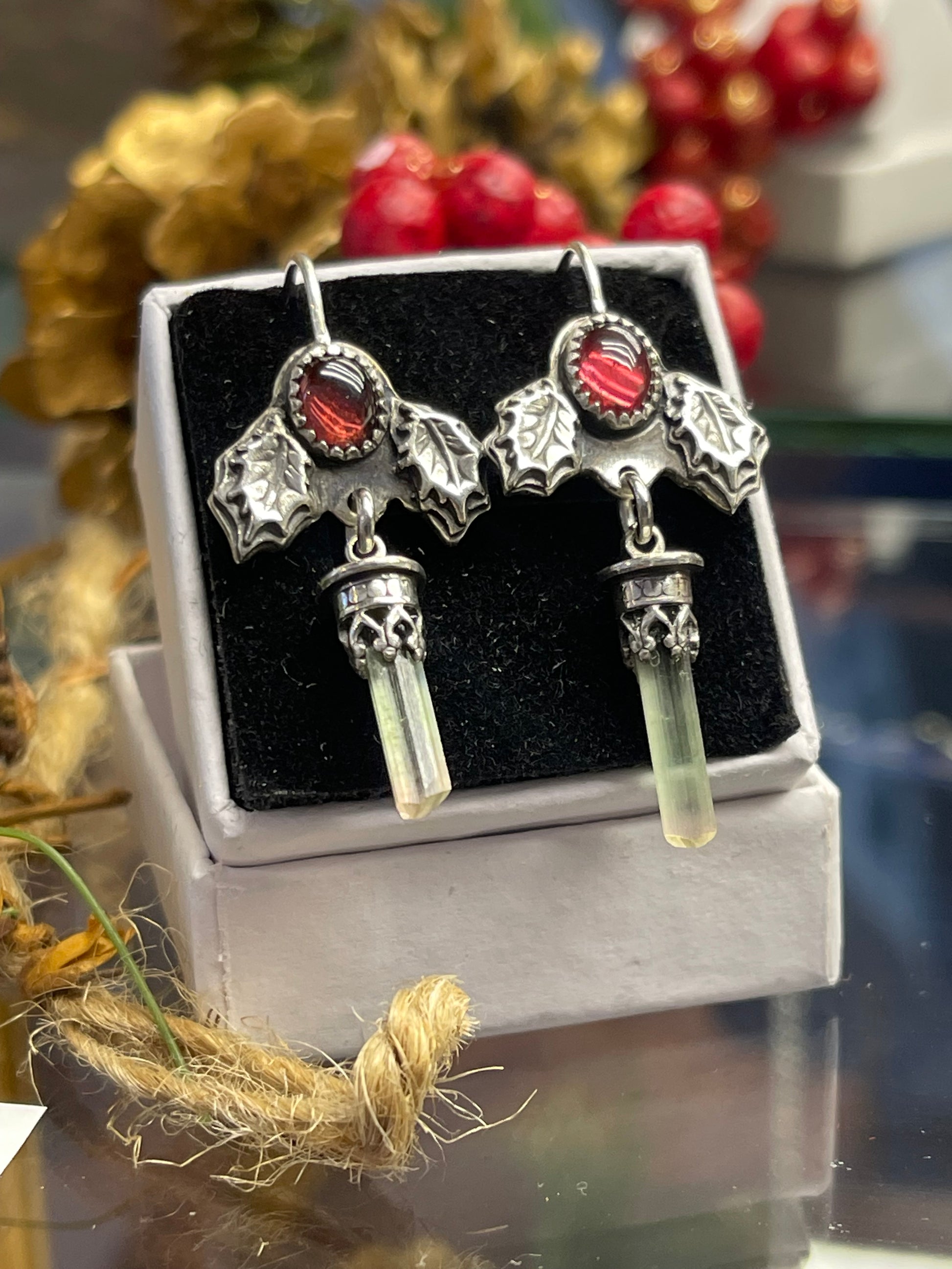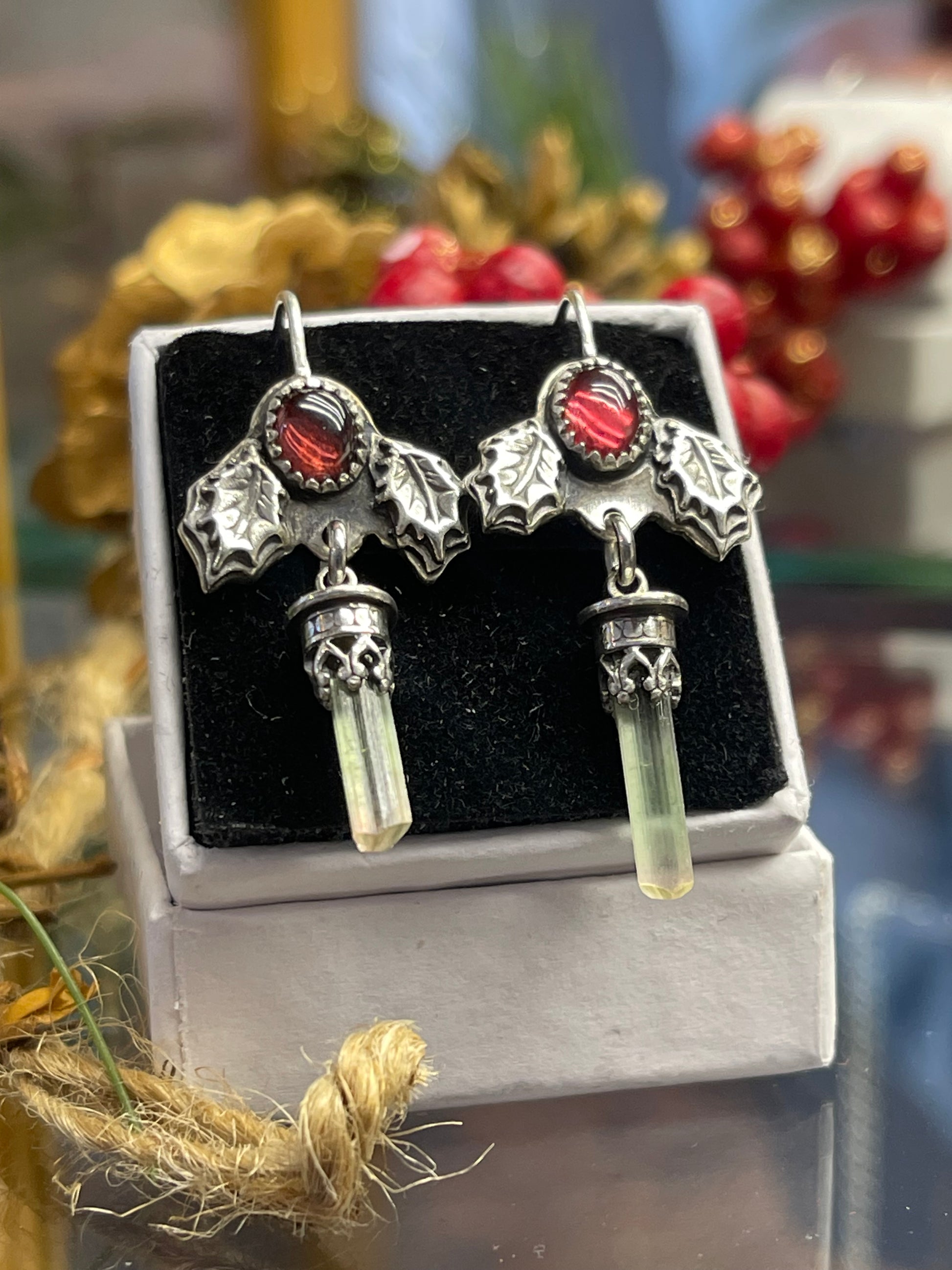 Add a touch of elegant holiday charm with the *Festive Holly Crystal Dangle* earrings. Handcrafted from sterling silver, these lightweight earrings feature intricate holly leaf designs cradling glowing, high-grade rhodolite garnets that beautifully represent festive holly berries.