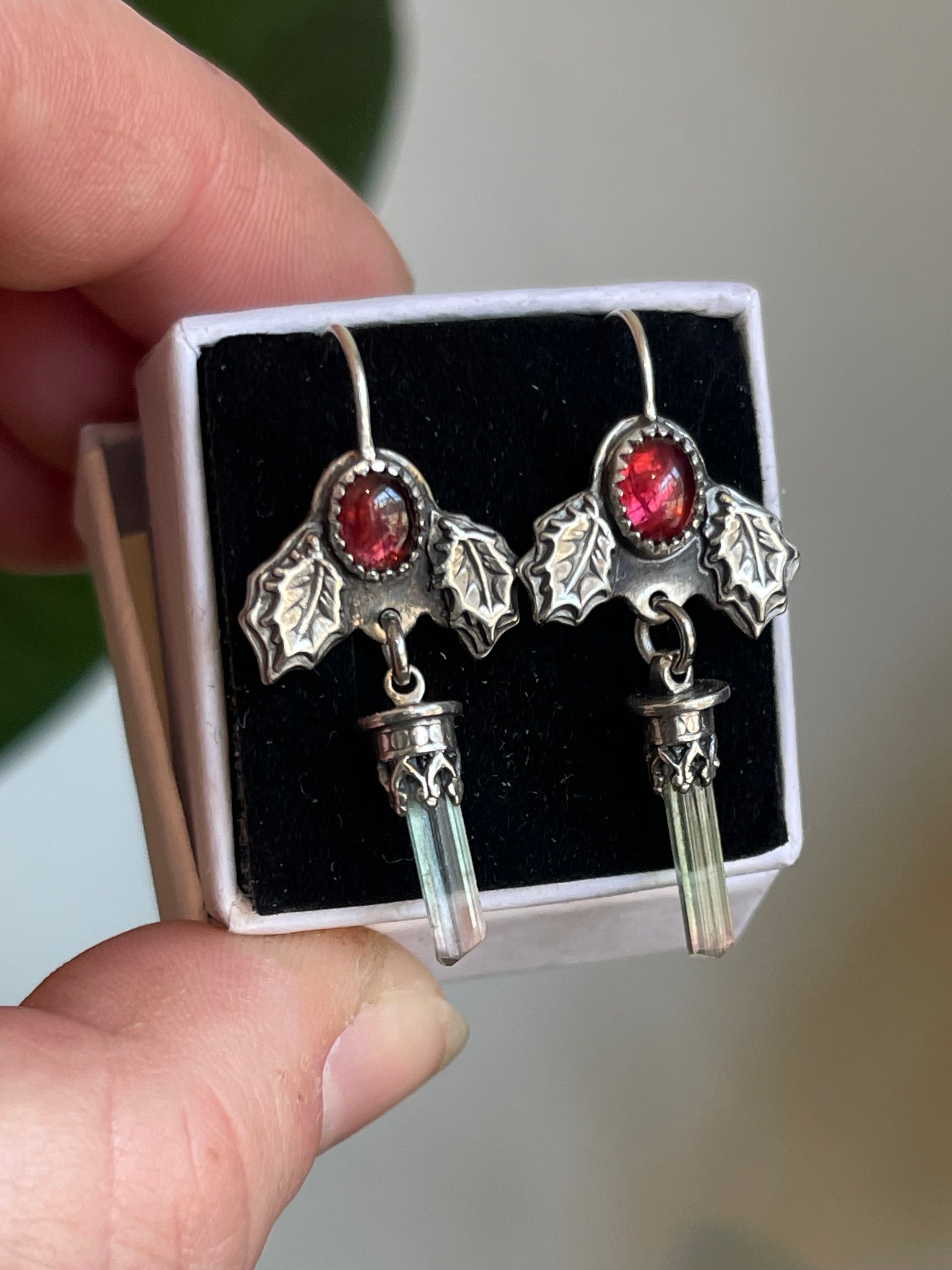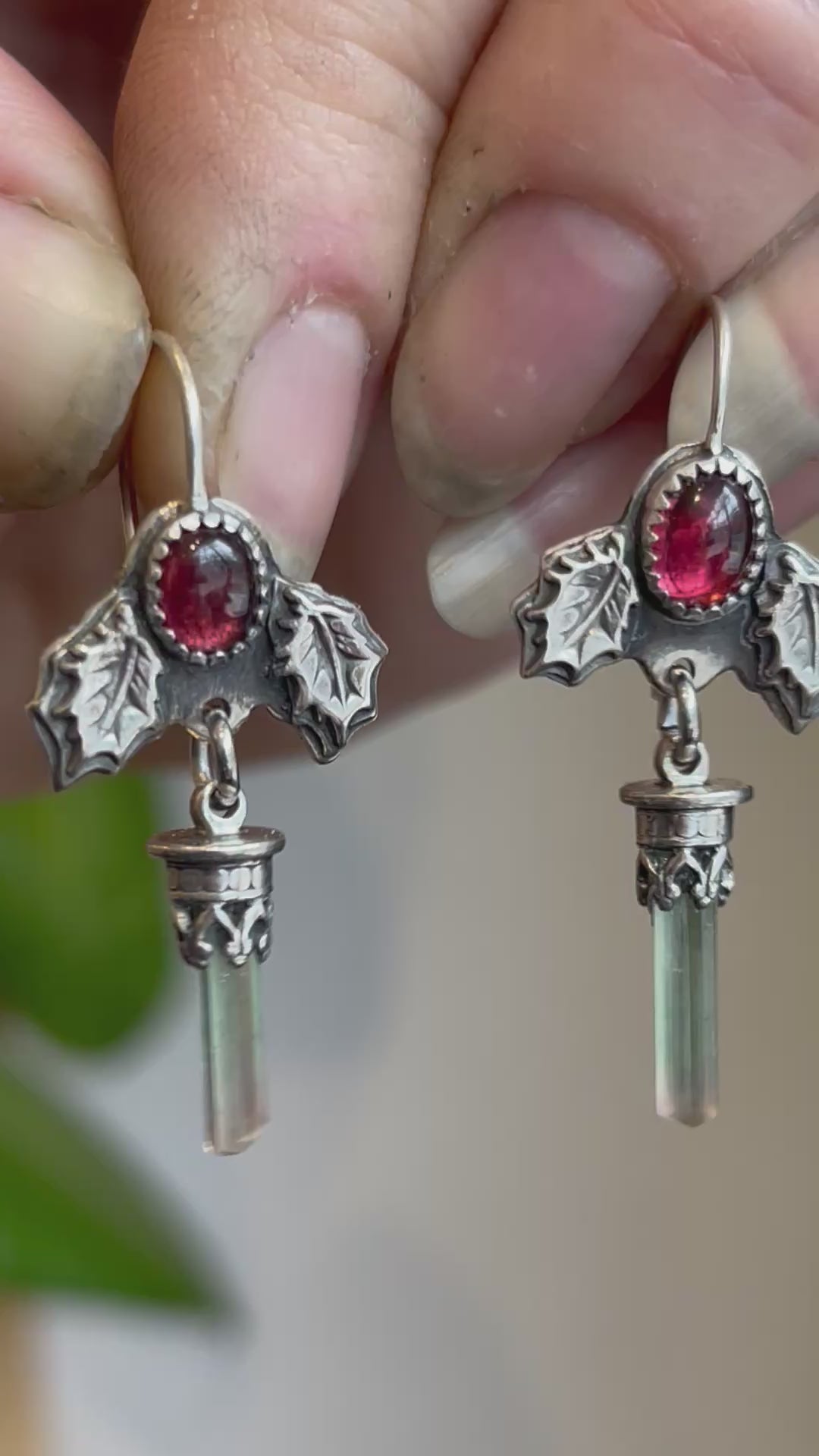 Below, exquisite watermelon tourmaline crystals dangle gracefully, showcasing their unique green hues with soft pink tips. The gothic-inspired setting adds a whimsical flair, making these earrings a perfect blend of sophistication and seasonal magic.