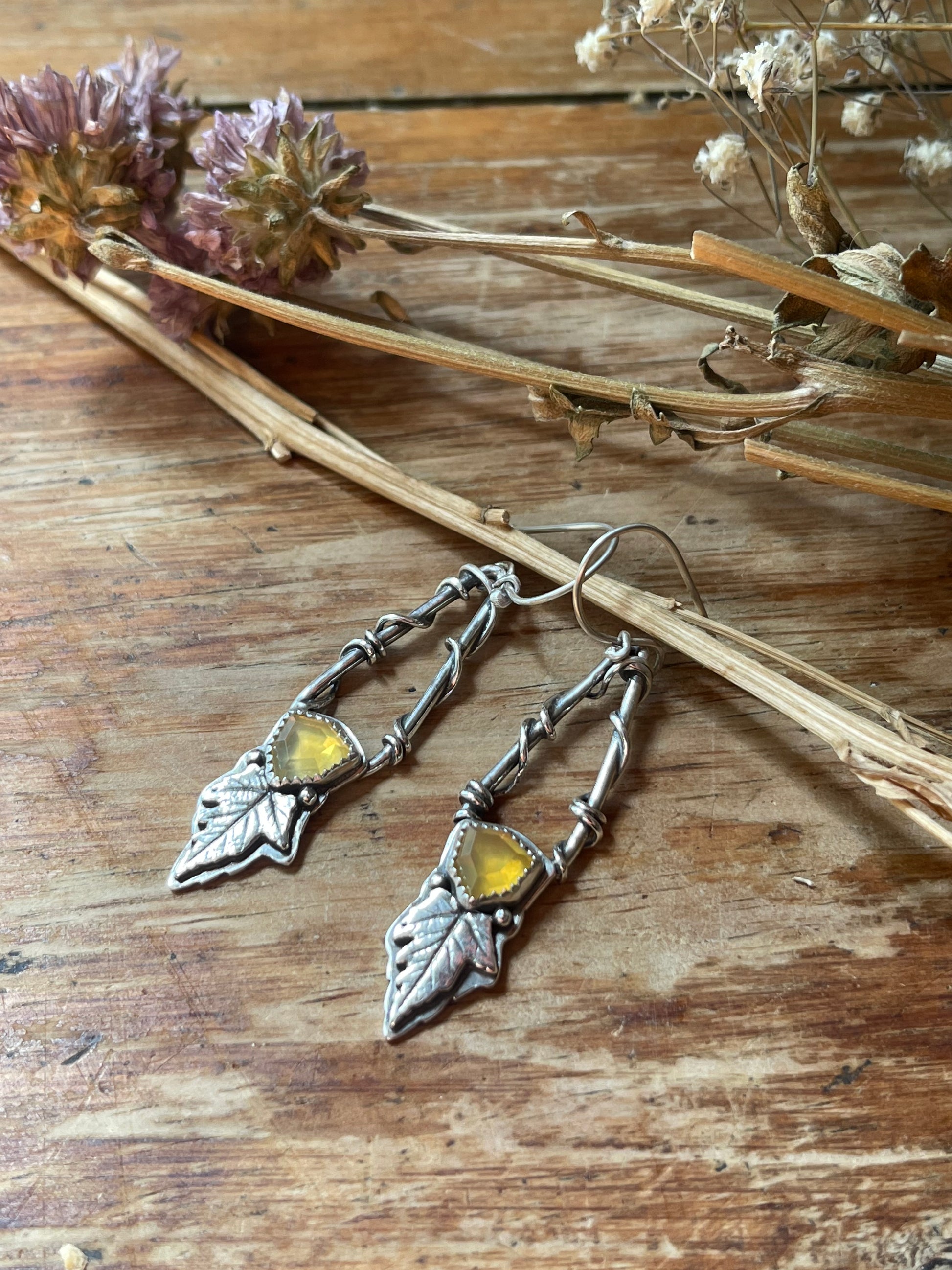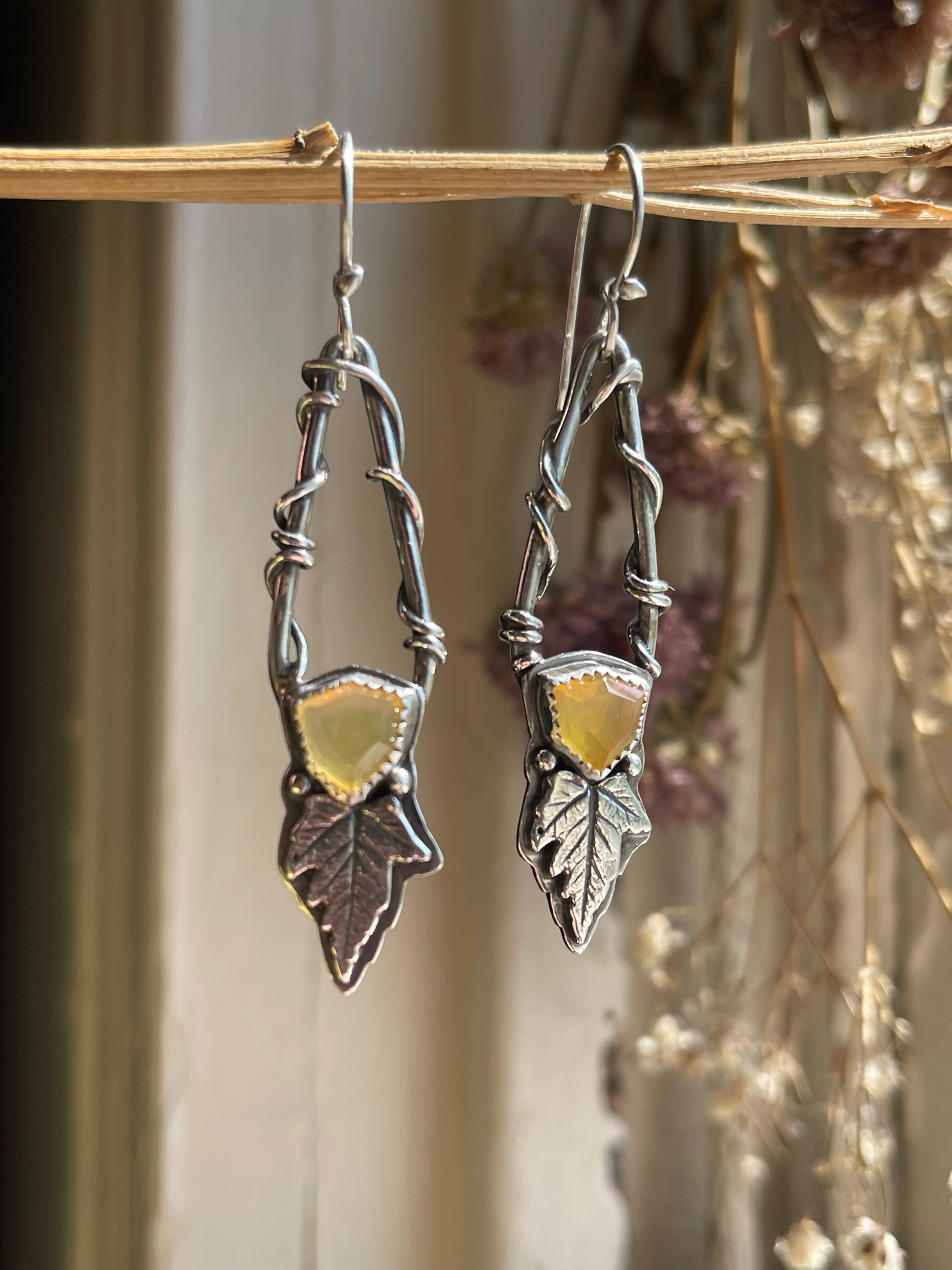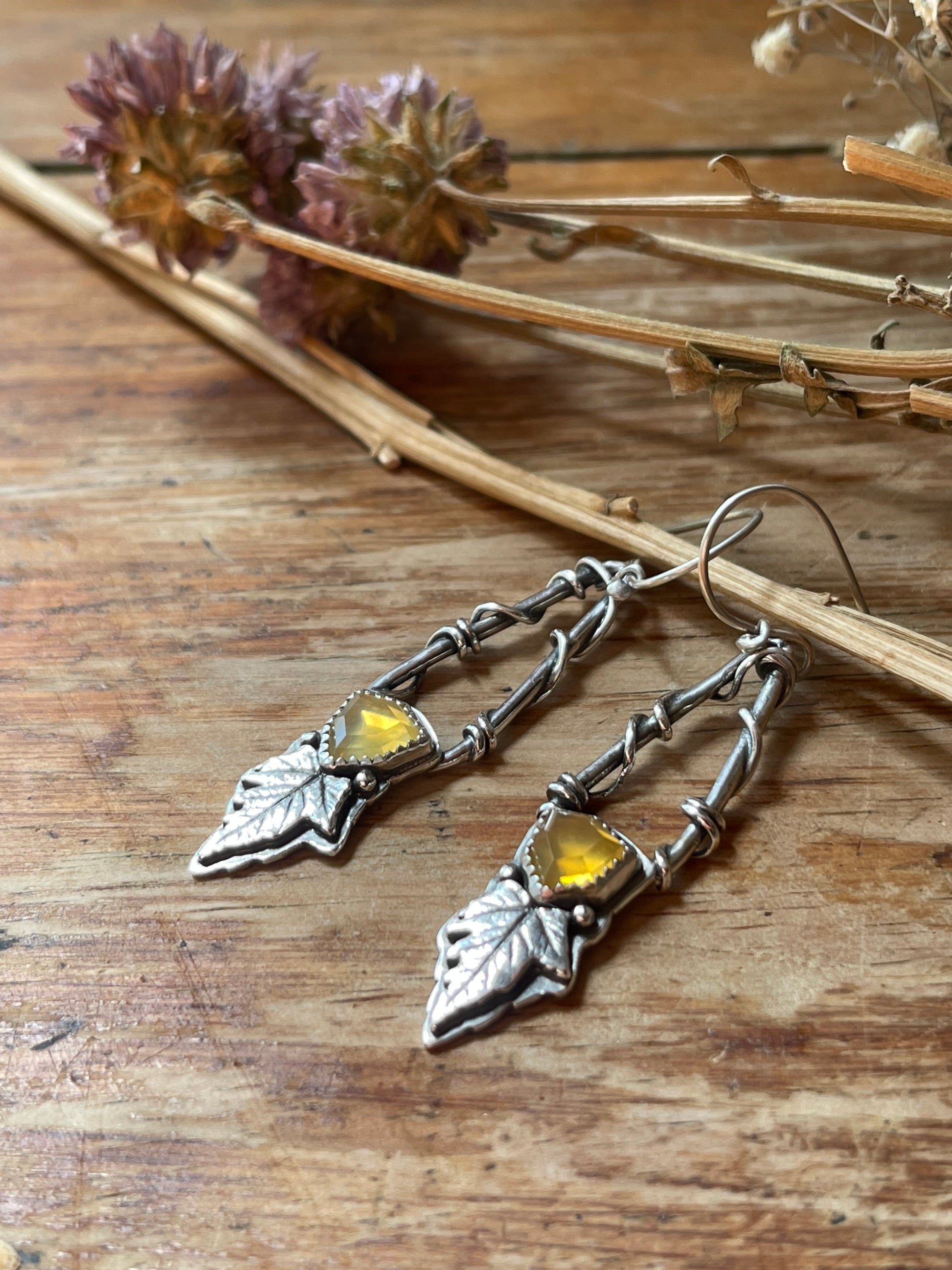 Step into a realm of enchantment with the *Leaves of Lórien* Statement Earrings, a breathtaking celebration of nature and artistry. These handcrafted sterling silver earrings feature the exquisite Oregon fire opal, a gemstone with a history as fiery and storied as the volcanoes that shaped it. Known for their mesmerizing golden-yellow hues and iridescent flashes, these opals evoke the magic of a radiant sunset.