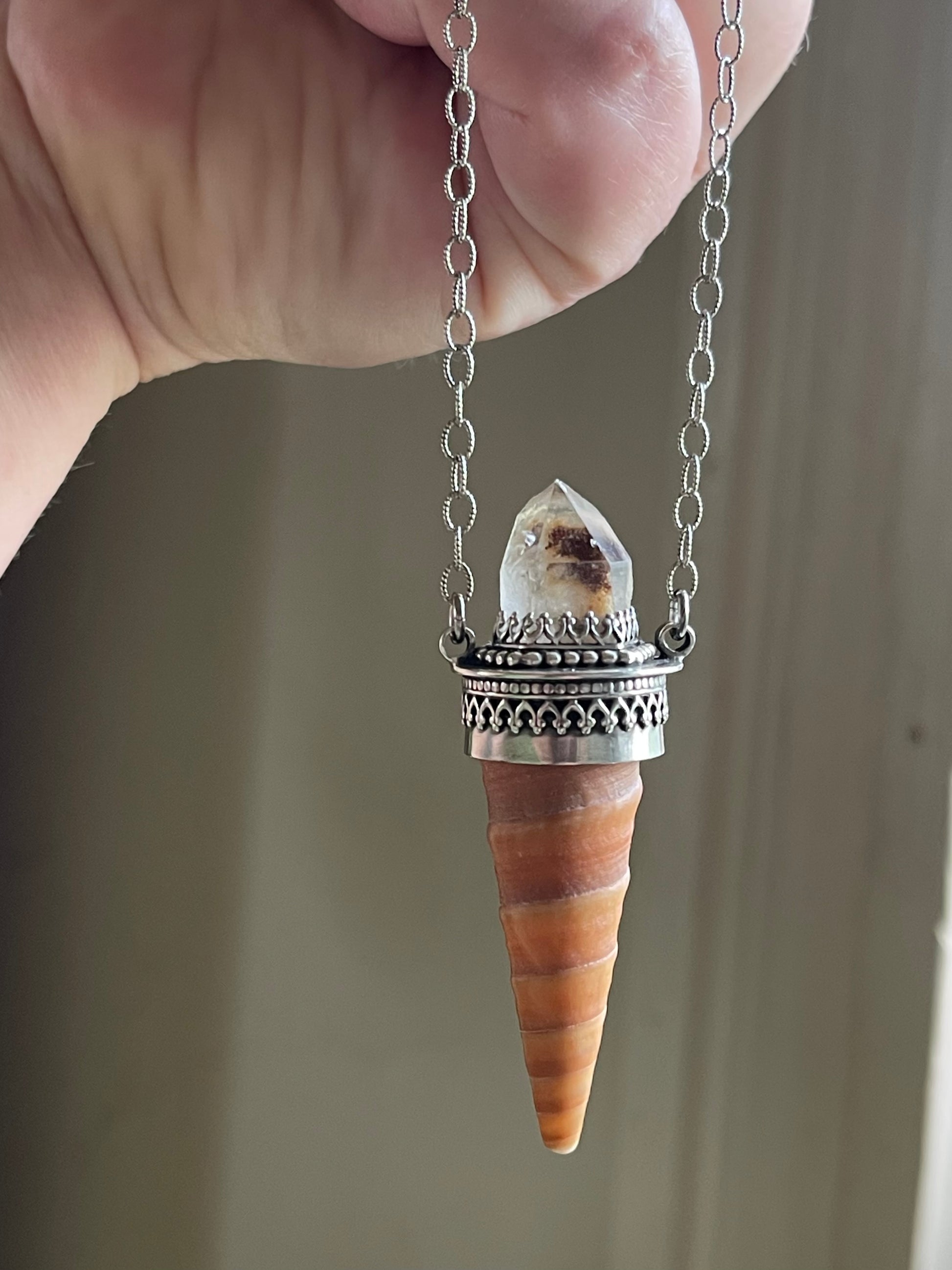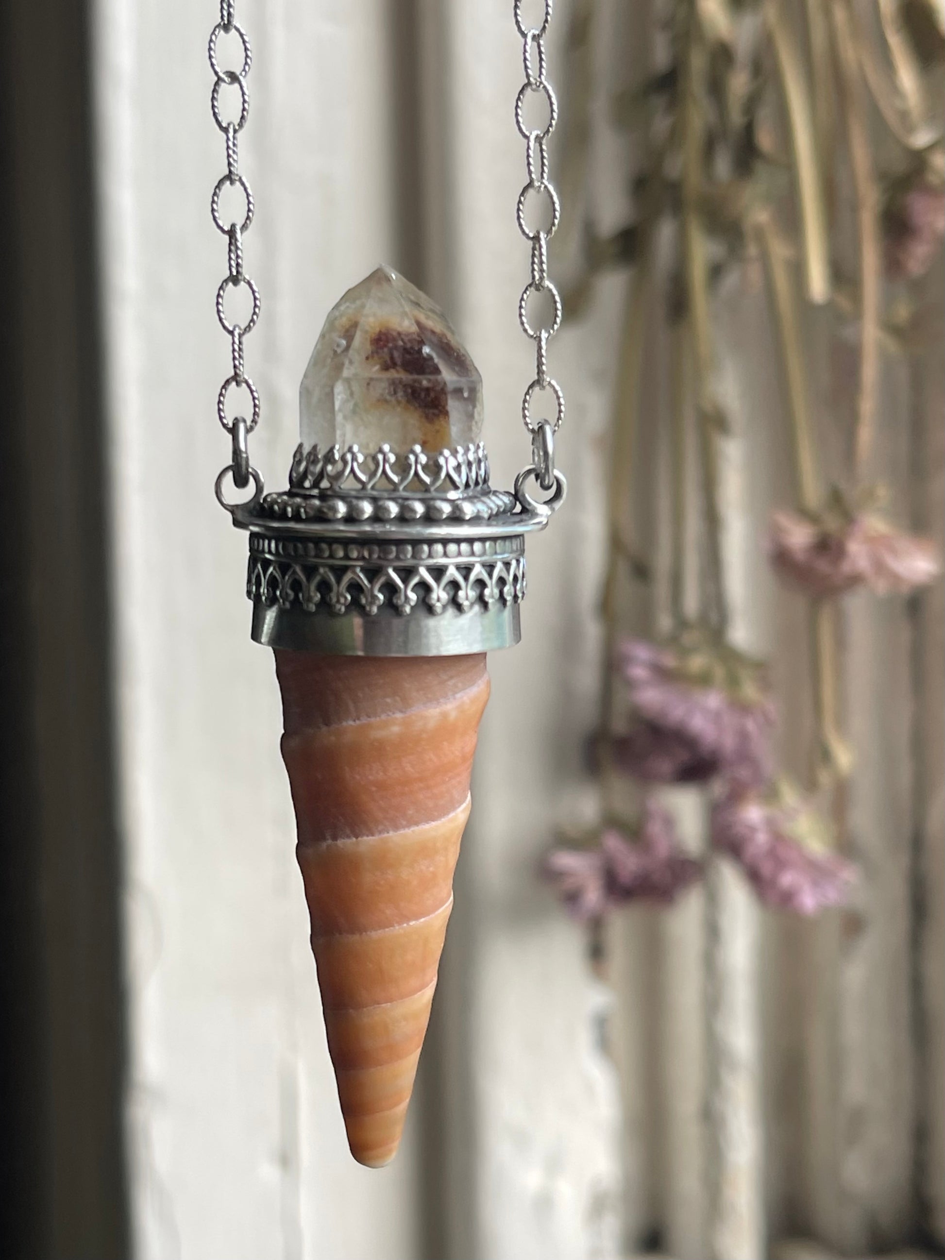 Elevate your style this Leo season with our *Leo • Included Quartz Cone Shell Statement Pendant Necklace. Boasting a hand-foraged cone shell, set in thick sterling silver for added depth and durability. Adorned with a stunning included quartz crystal, featuring striking red and yellow iron plumes. Complete with a nautical 26 inch sterling silver chain, this bold and alluring talisman is the perfect addition to your summer jewelry collection.