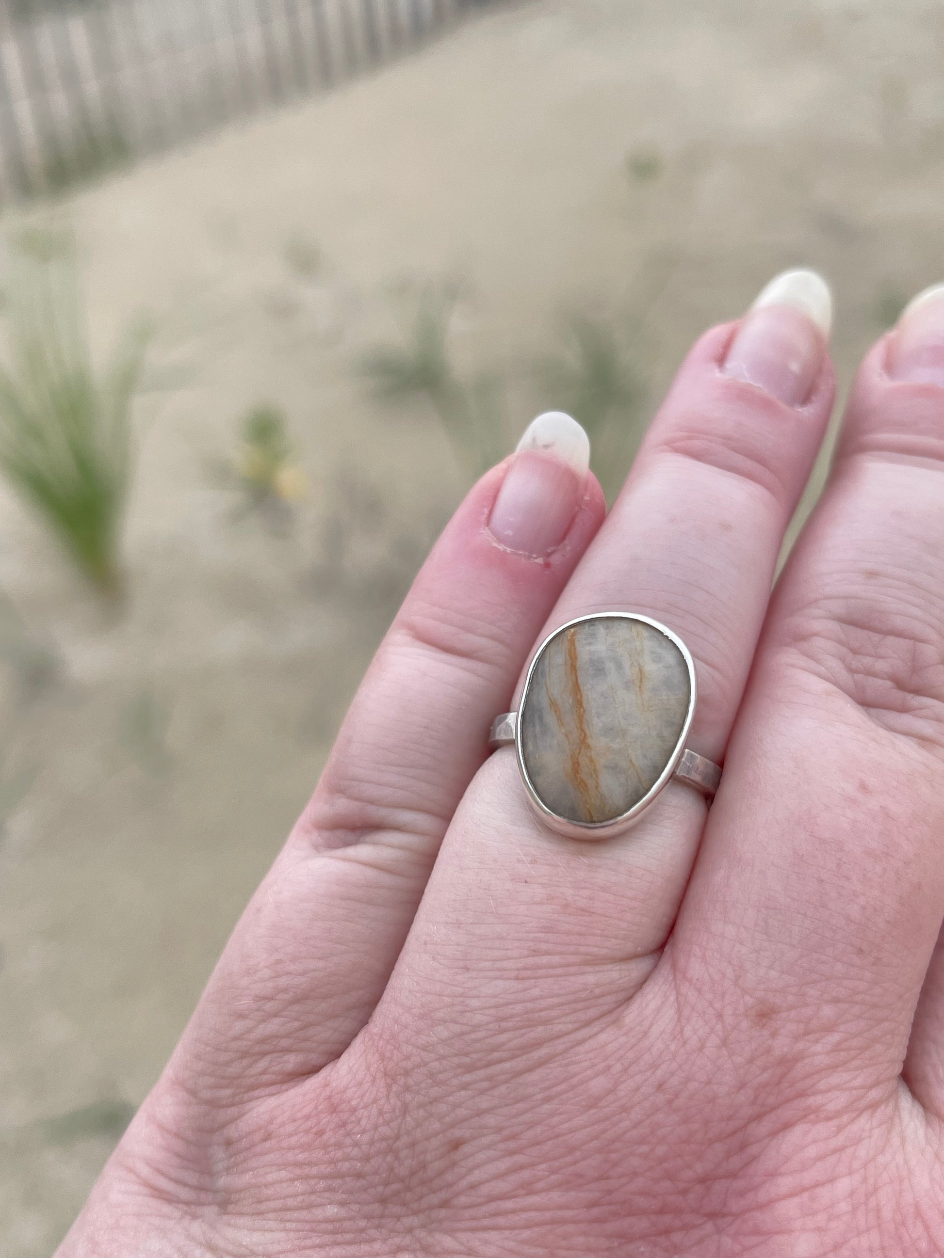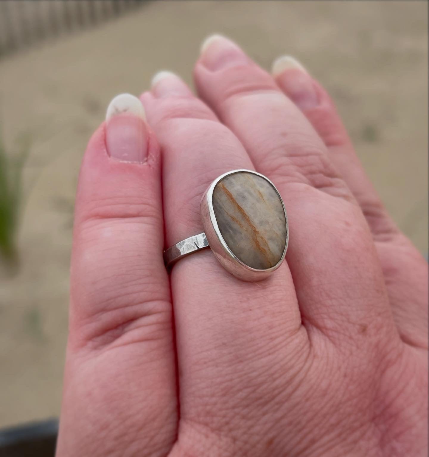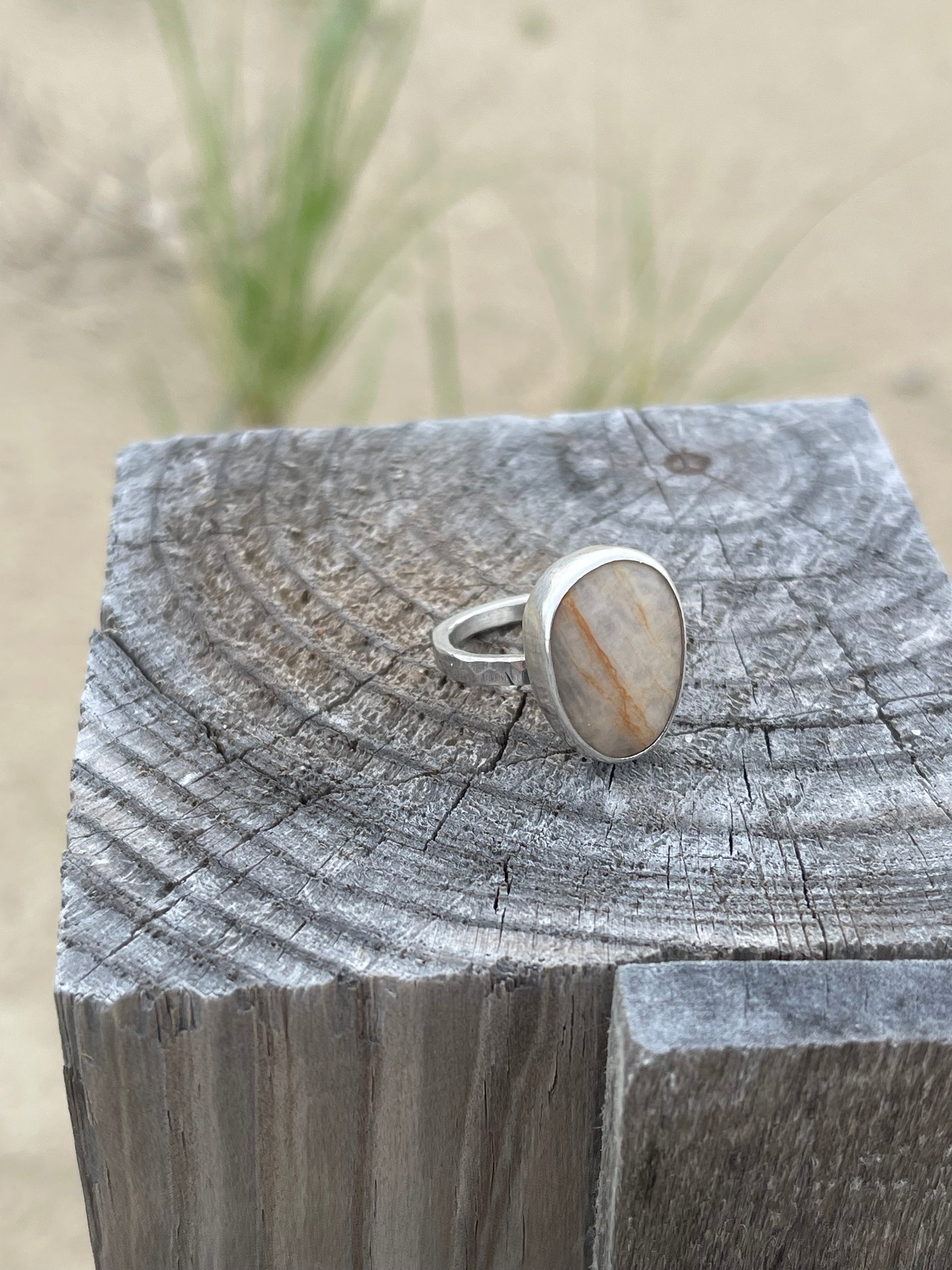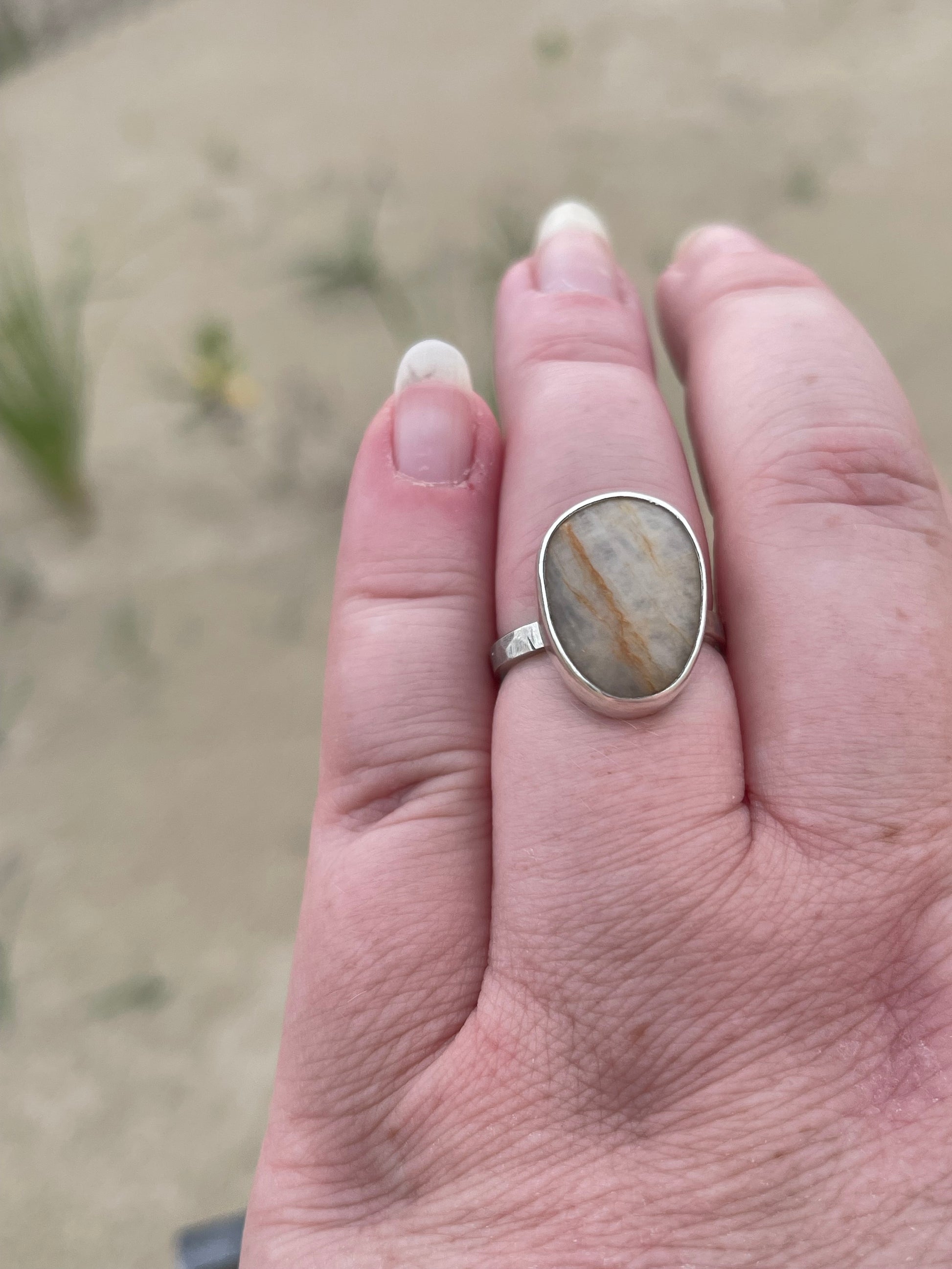 Set boldly in a thick, hammer-textured sterling silver shank, the ring echoes the rugged beauty of the rocky coastline it honors. Simple yet strong, it invites you to trace the stone’s smooth surface and feel instantly transported to the calming rhythm of waves and sand.