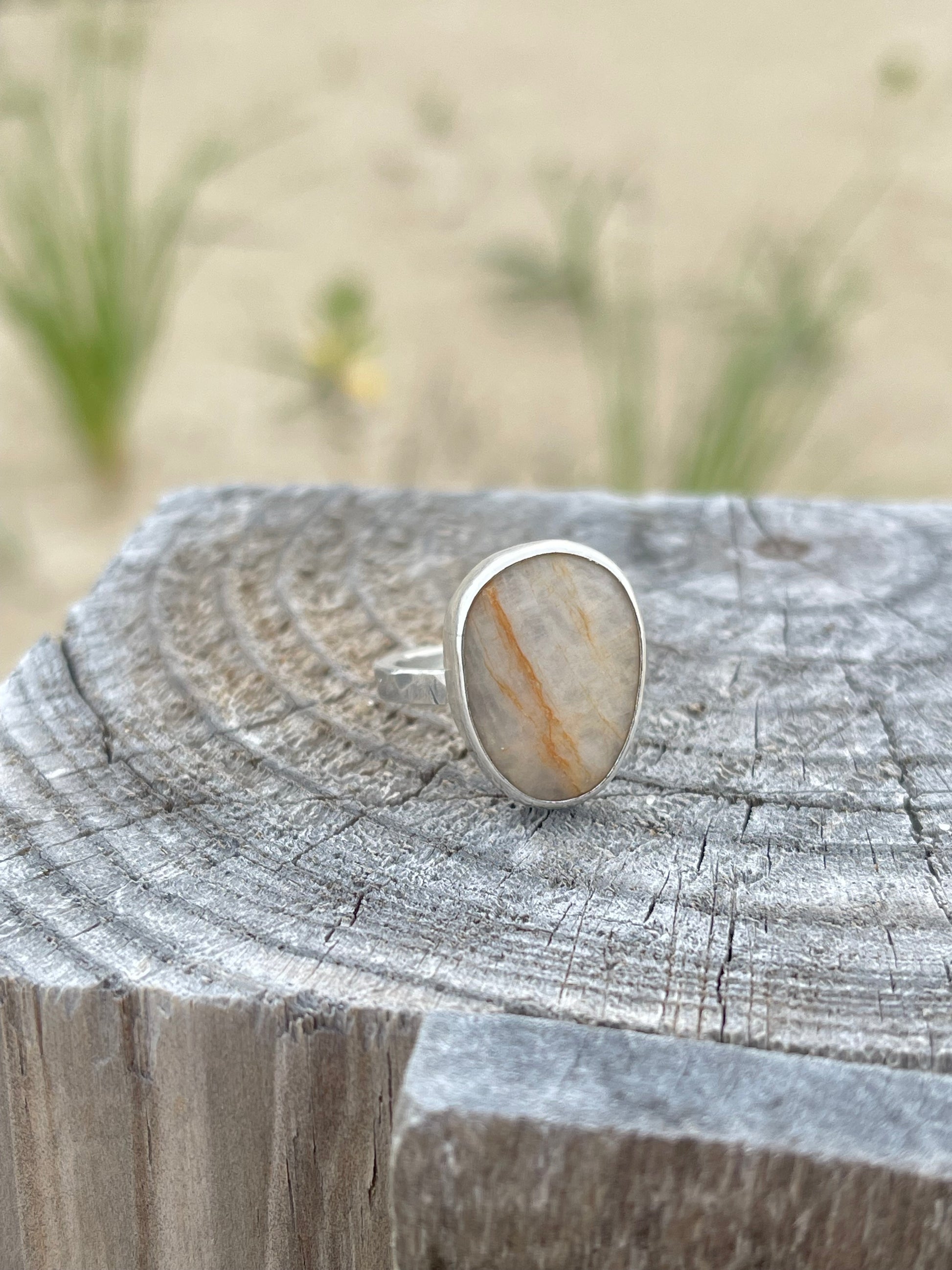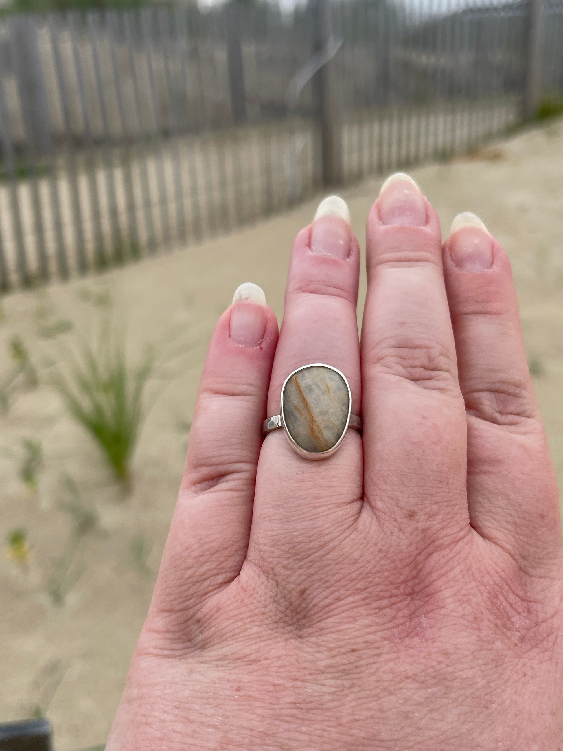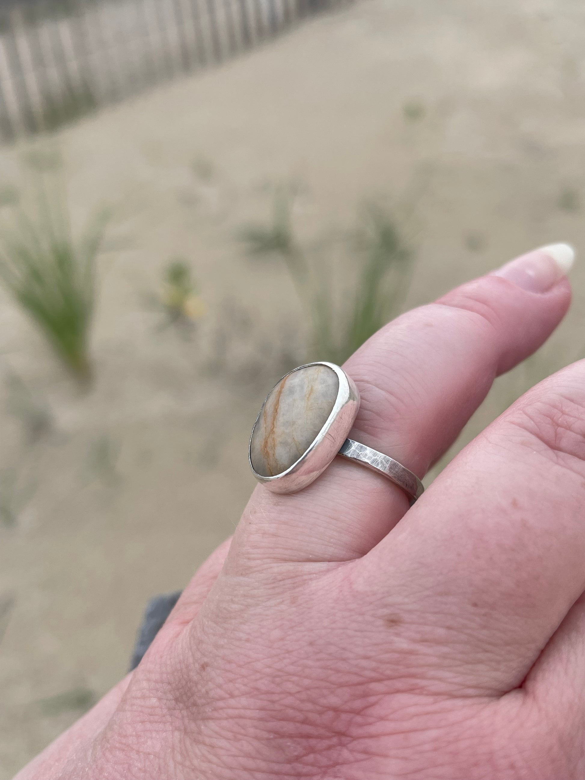 Set boldly in a thick, hammer-textured sterling silver shank, the ring echoes the rugged beauty of the rocky coastline it honors. Simple yet strong, it invites you to trace the stone’s smooth surface and feel instantly transported to the calming rhythm of waves and sand.