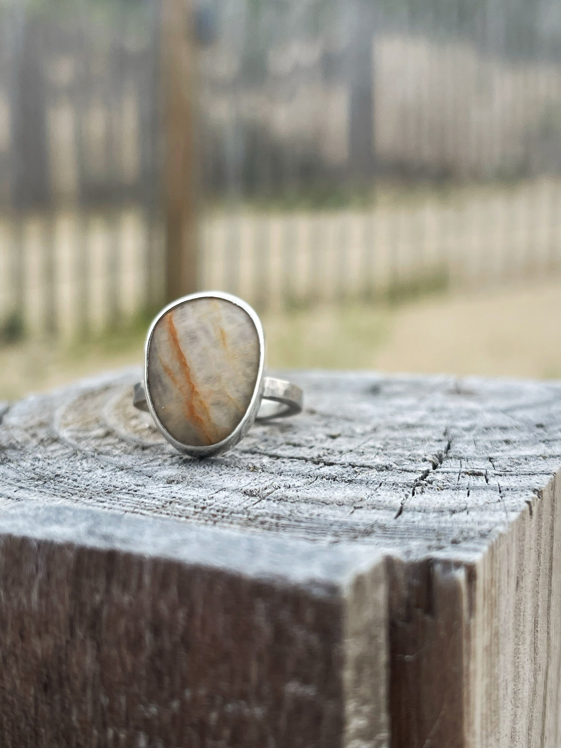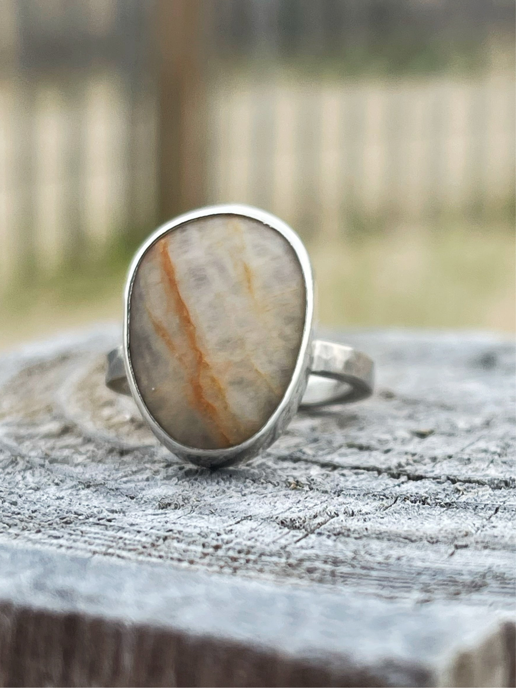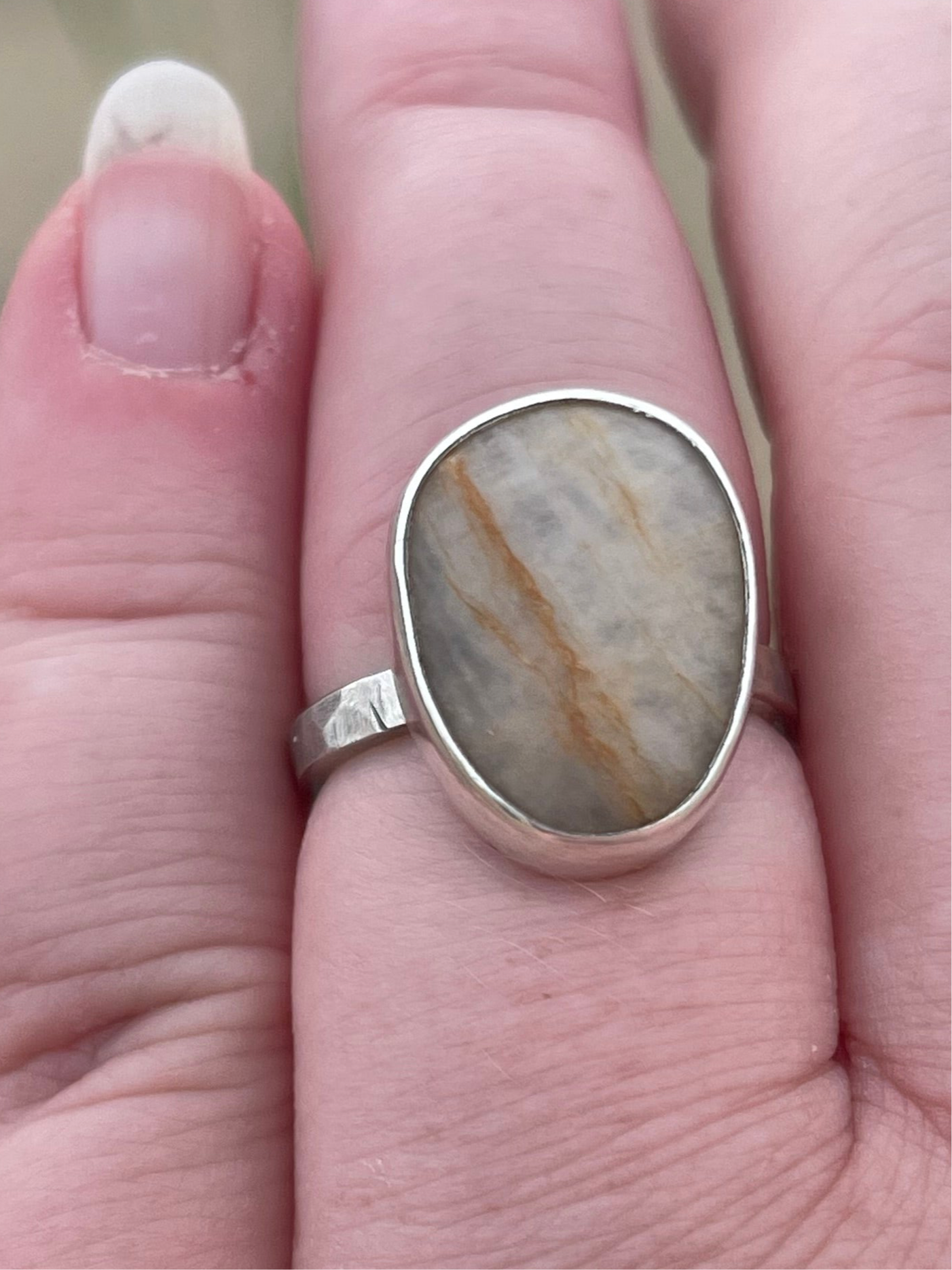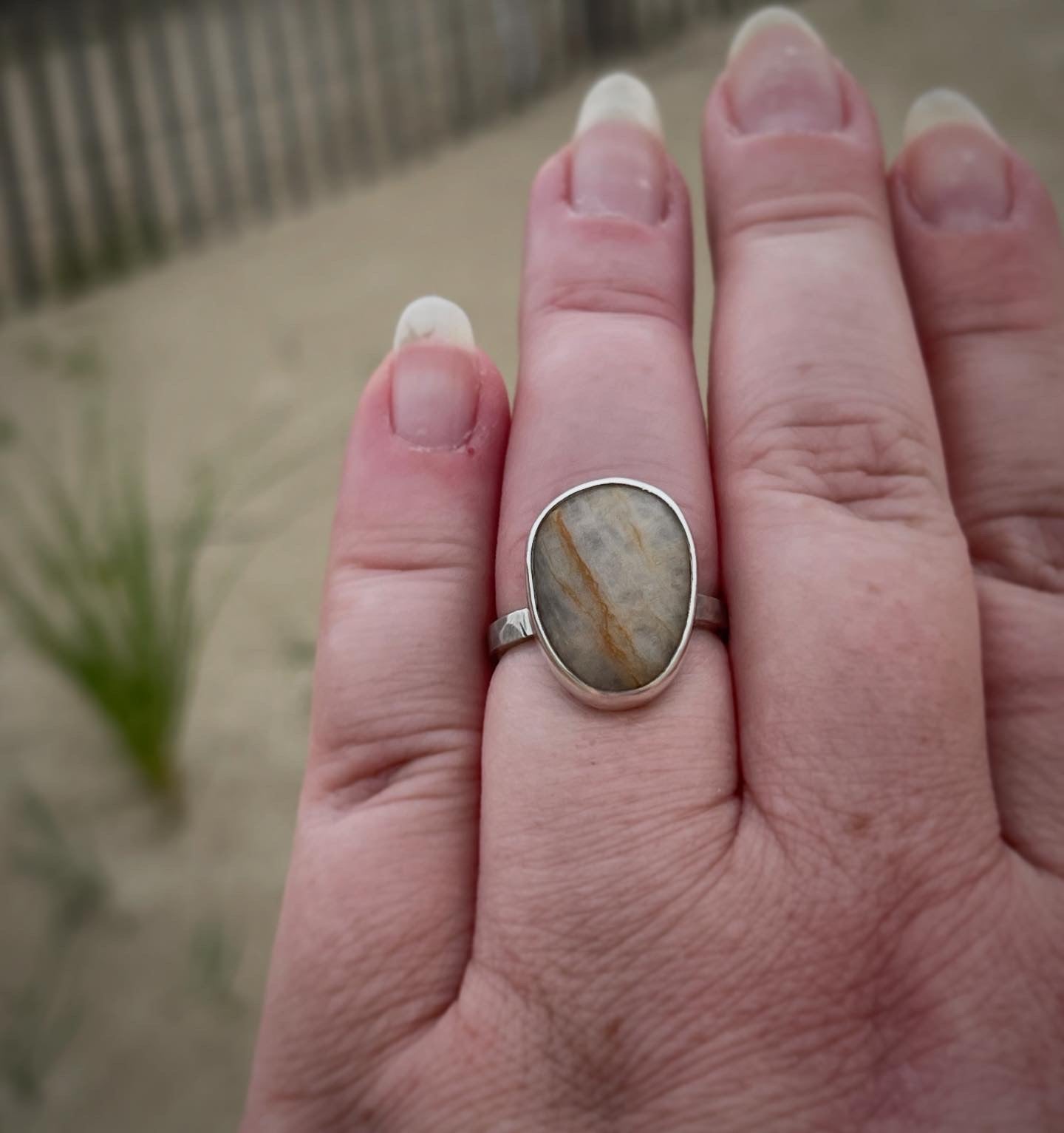 Set boldly in a thick, hammer-textured sterling silver shank, the ring echoes the rugged beauty of the rocky coastline it honors. Simple yet strong, it invites you to trace the stone’s smooth surface and feel instantly transported to the calming rhythm of waves and sand.