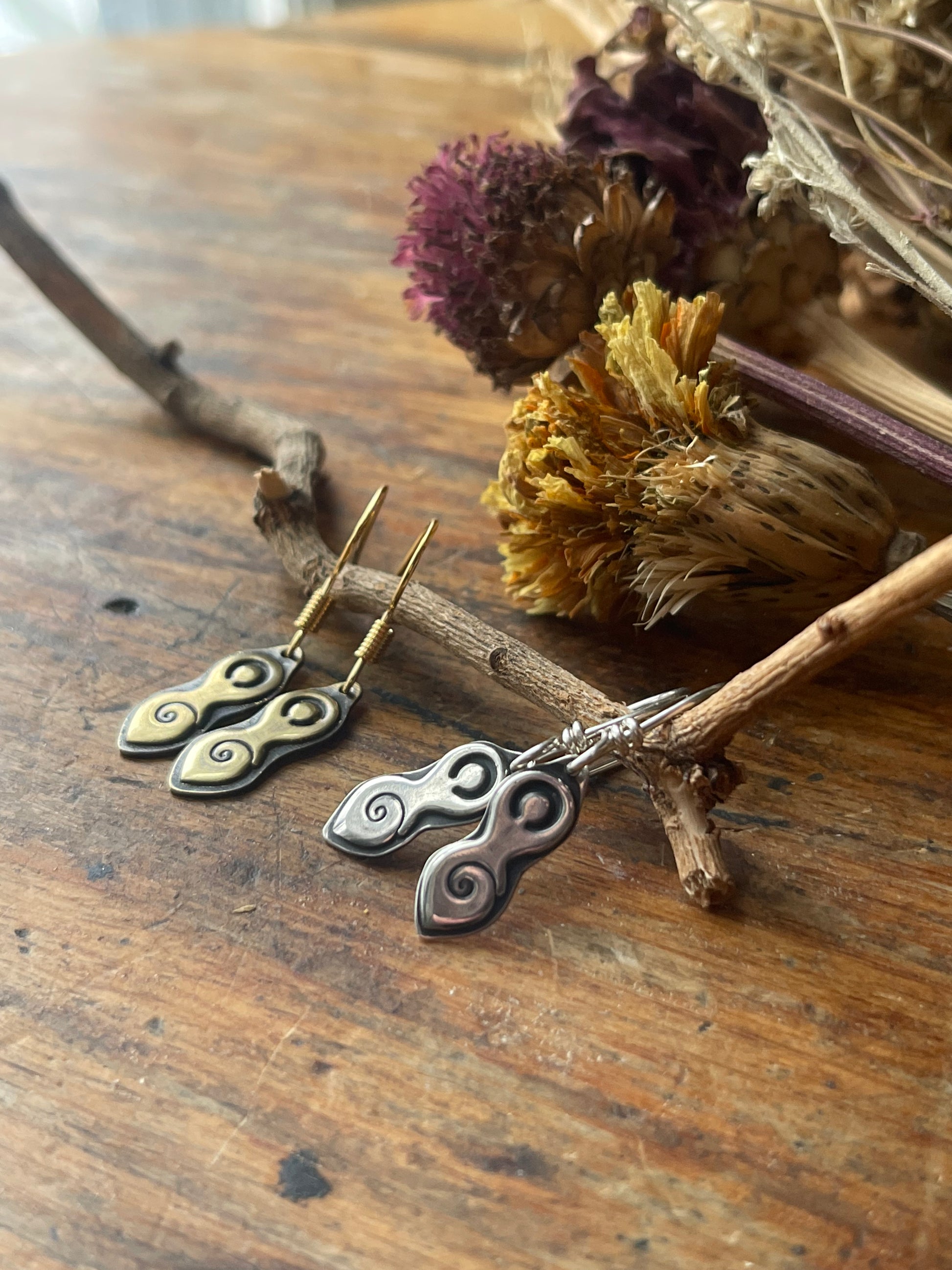 Brass earrings come on 18K gold plated ear hooks, sterling silver earrings come on solid silver sterling silver ear hooks.