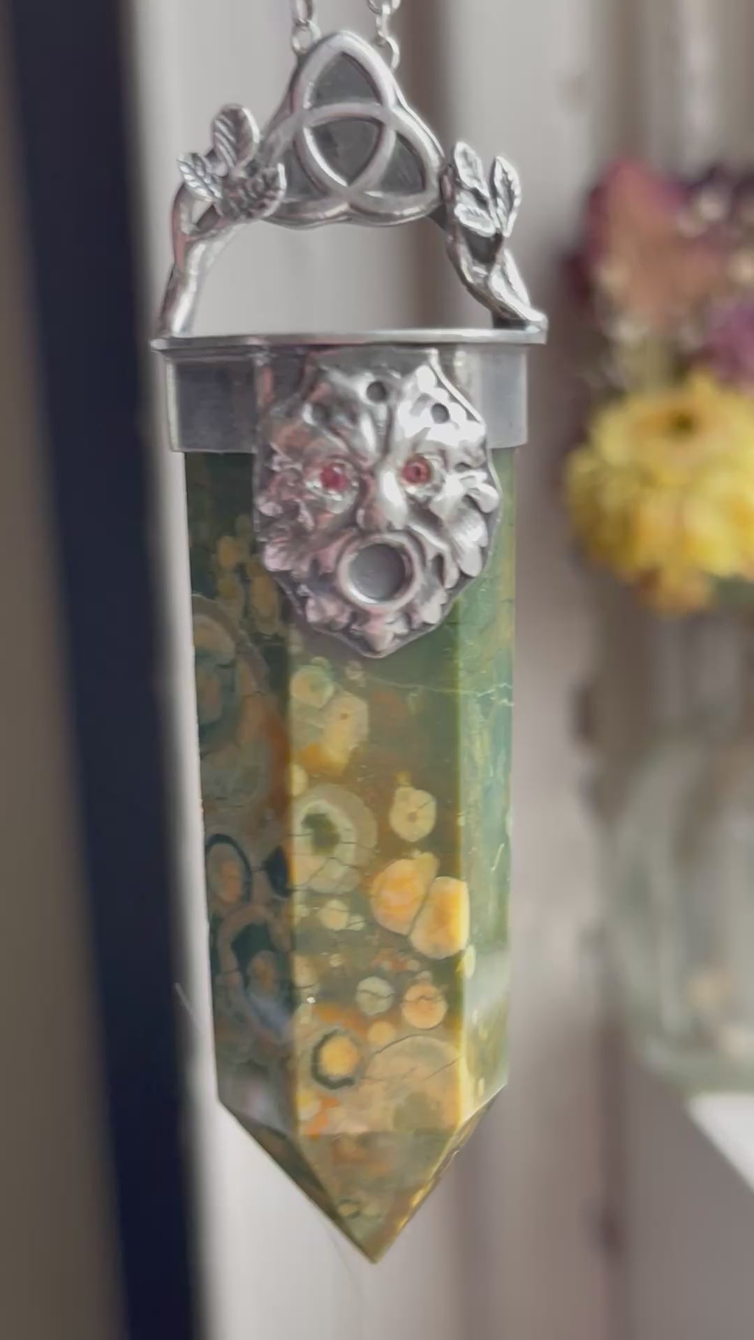 Oakfather’s Blessing • Rainforest Agate Greenman Crystal with Orange Sapphire Eyes • Sterling Silver Pendant