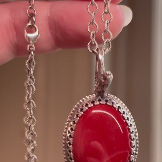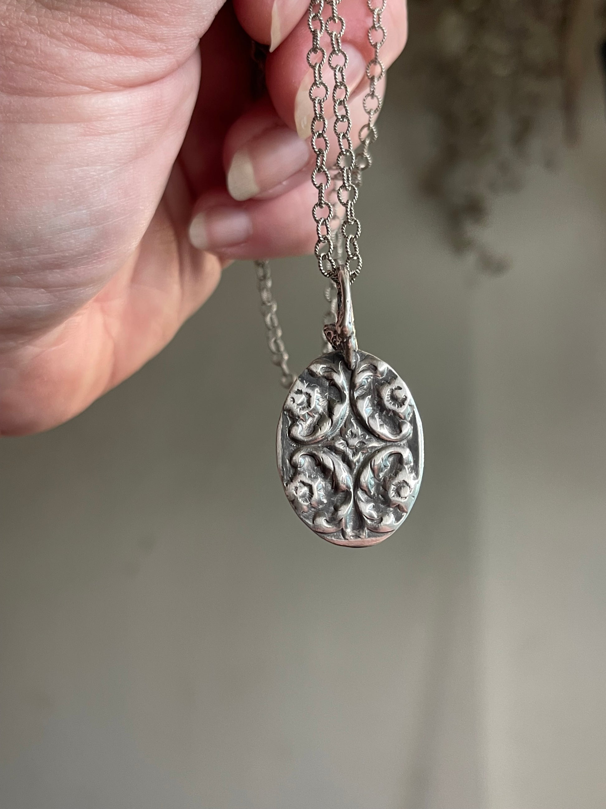 The jasper is set in a decorative sterling silver bezel, rich with hand-applied detail. On the reverse, the pendant hides a secret: a heavy, deeply impressed floral pattern reminiscent of Slavic folk art. The design blooms across the back in textured relief, a private homage to old-world motifs and ancestral craft traditions.
