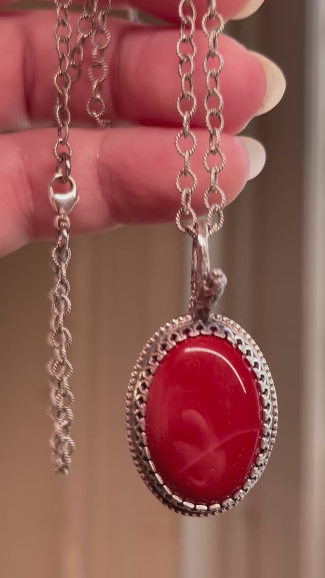 Red Blossom for the Ancestors is a piece rooted in memory, folklore, and the quiet strength of those who came before us. At its center rests a vibrant red jasper—earthy, bold, and full of grounding energy. Its deep crimson tones evoke hearth embers and ceremonial textiles, making it a stone that feels both protective and alive.