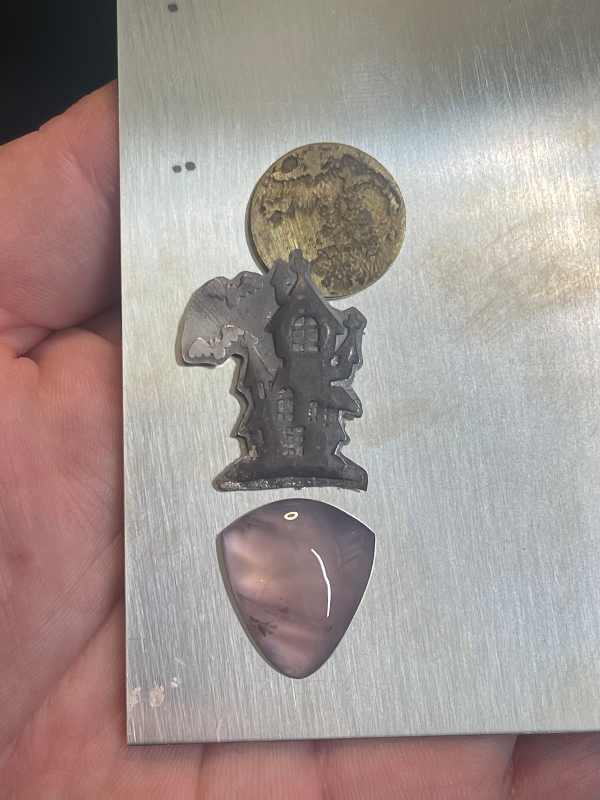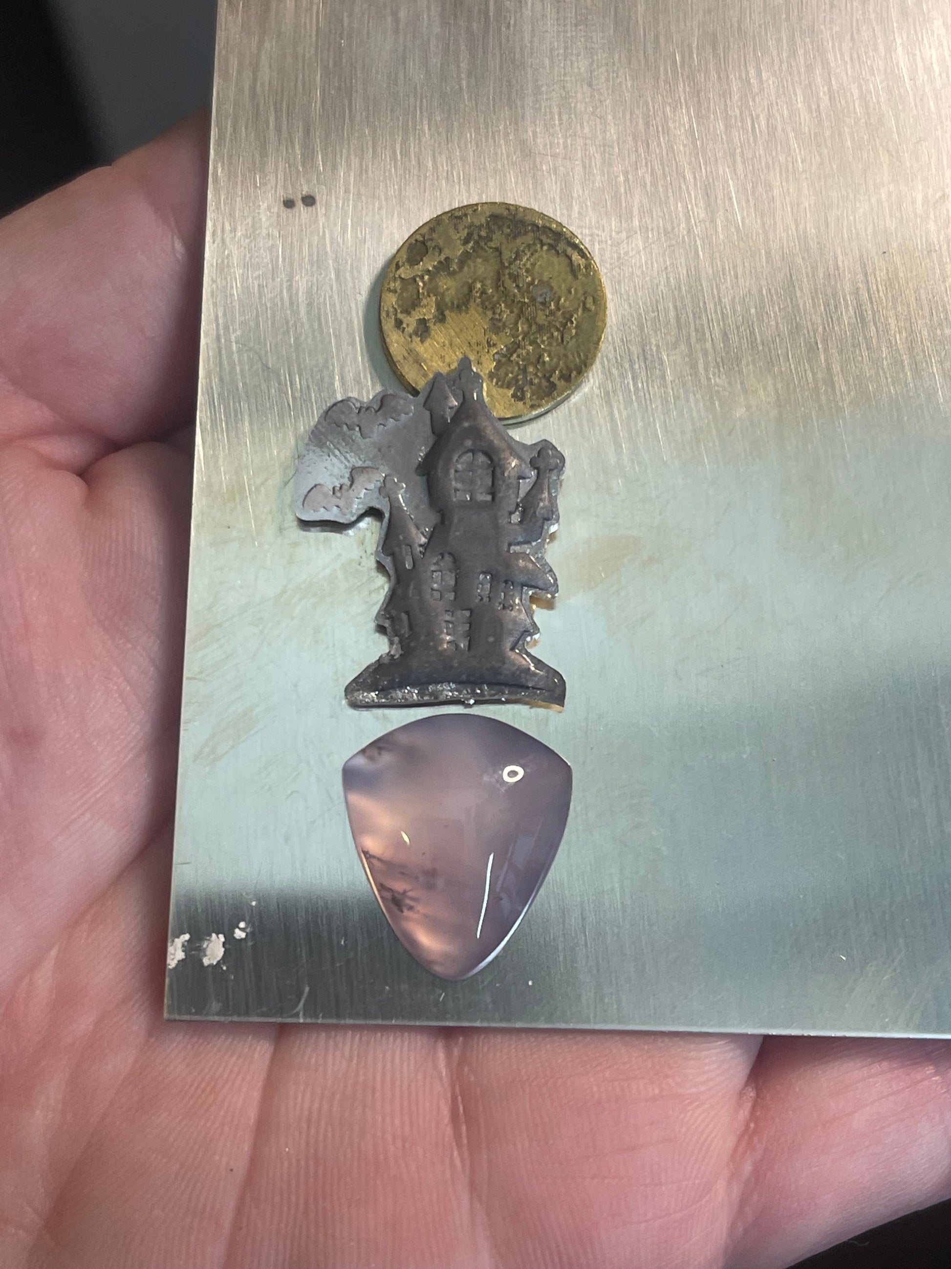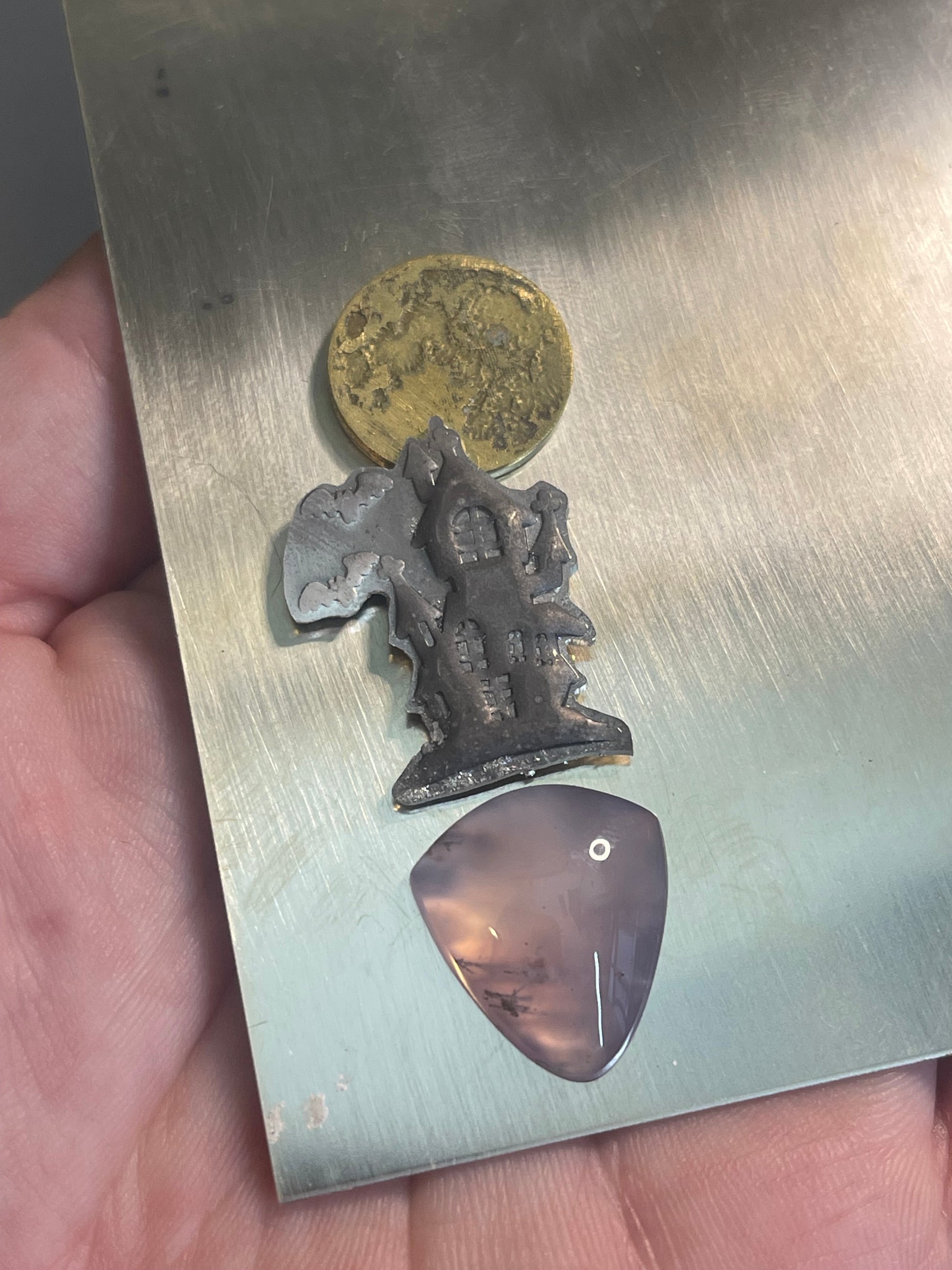Sterling silver haunted house pendant. Purple moss agate stone with two bat cut-outs underneath and a bat bail. Thick etched brass moon behind the pressed haunted house. Pure spooky perfection 👻