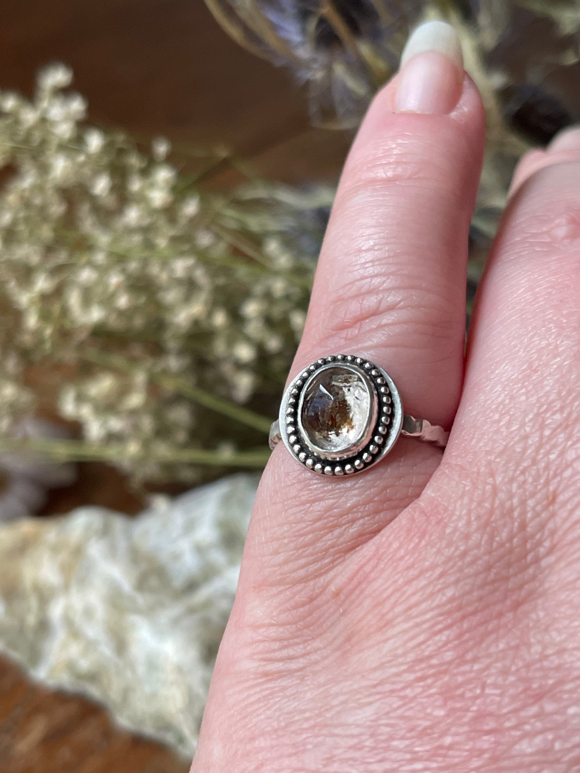Handcrafted in sterling silver, this one-of-a-kind ring features a stunning Herkimer Diamond that captures the essence of sunlit shores. The rose-cut stone shimmers with natural brilliance, while a unique copper-brown sandy inclusion evokes the warmth and texture of sun-drenched earth. The cut and clarity of the Herkimer Diamond enhance its inner light, offering a captivating play of sparkle and depth. Like a memory of golden hours spent by the sea, Sand & Sun brings elemental beauty to your everyday.