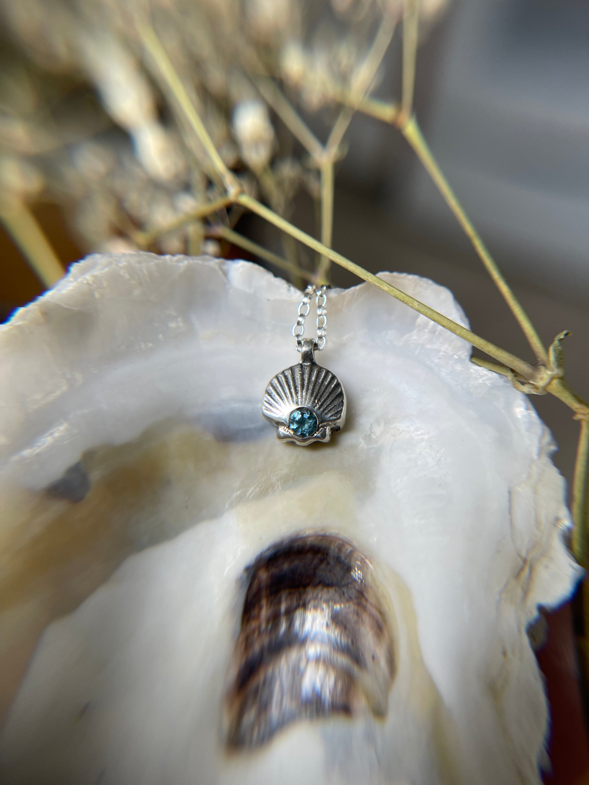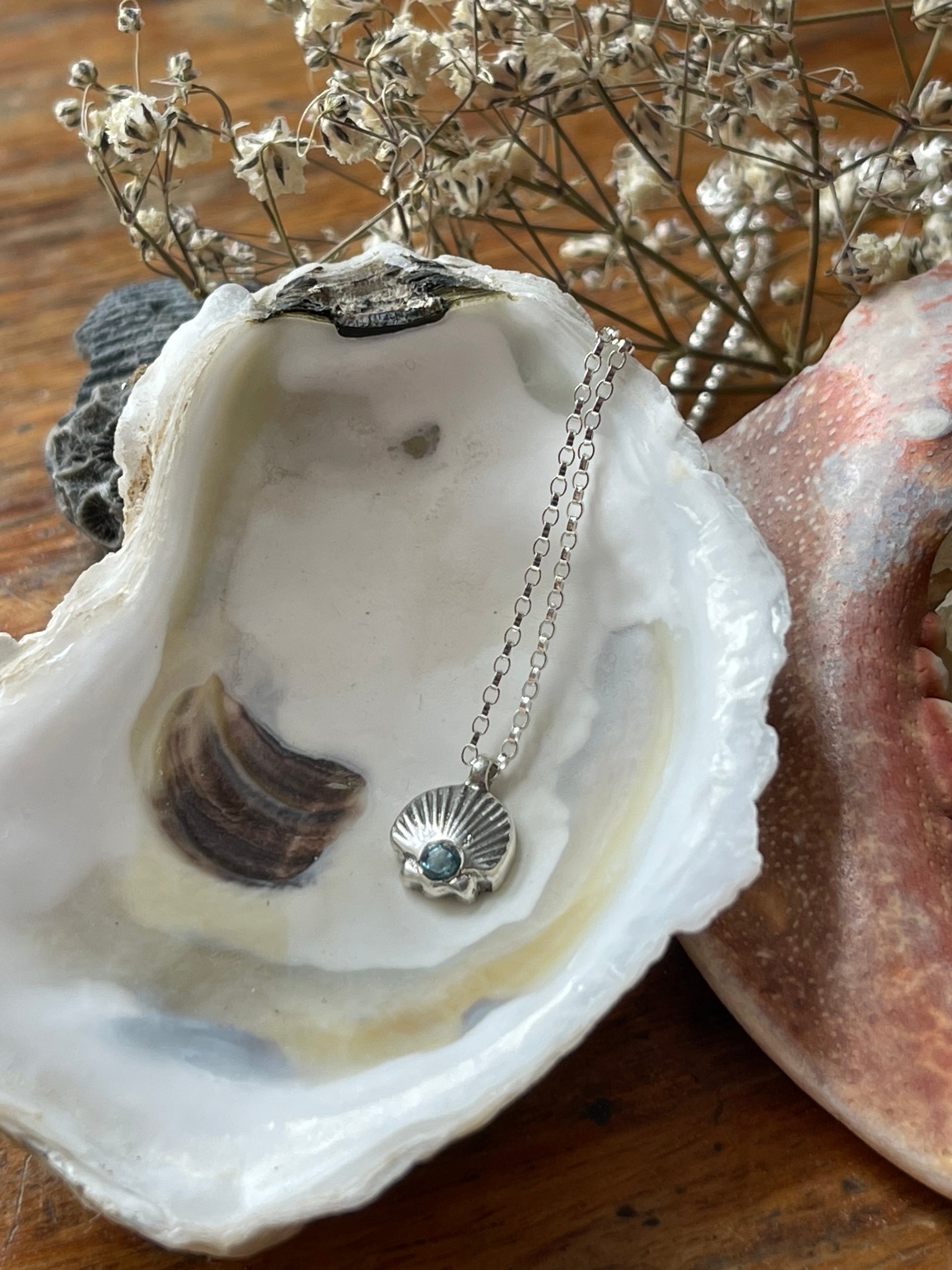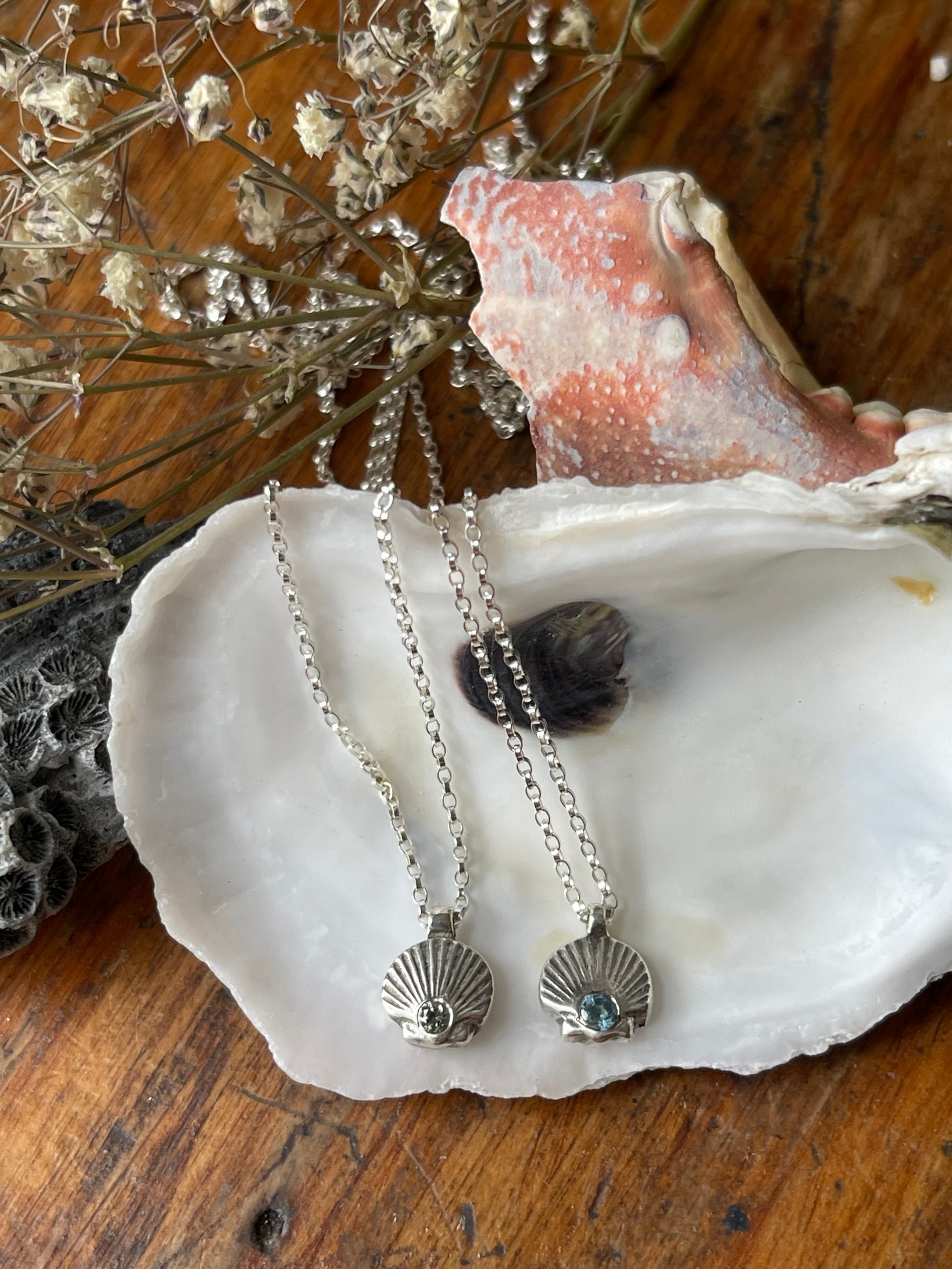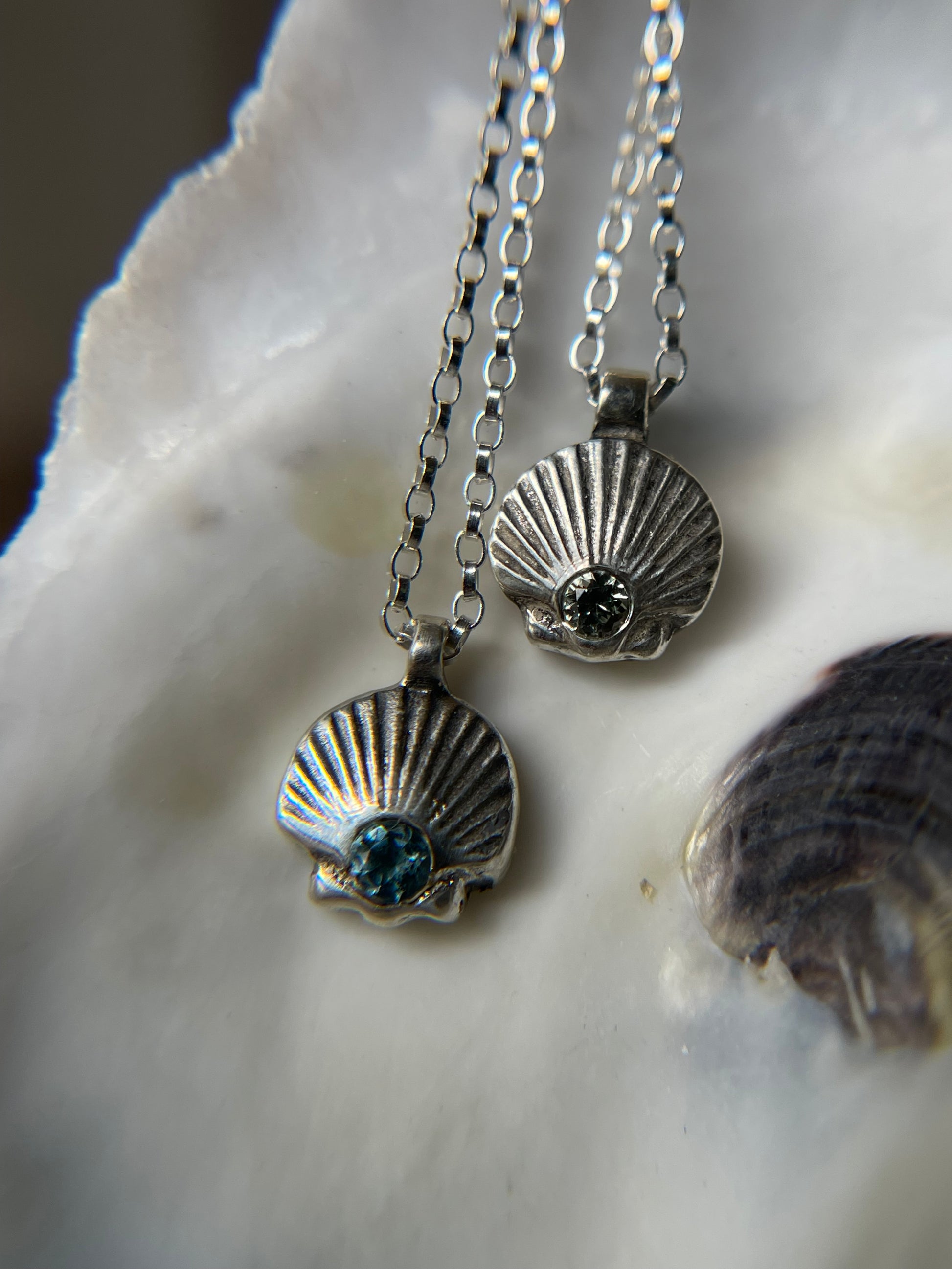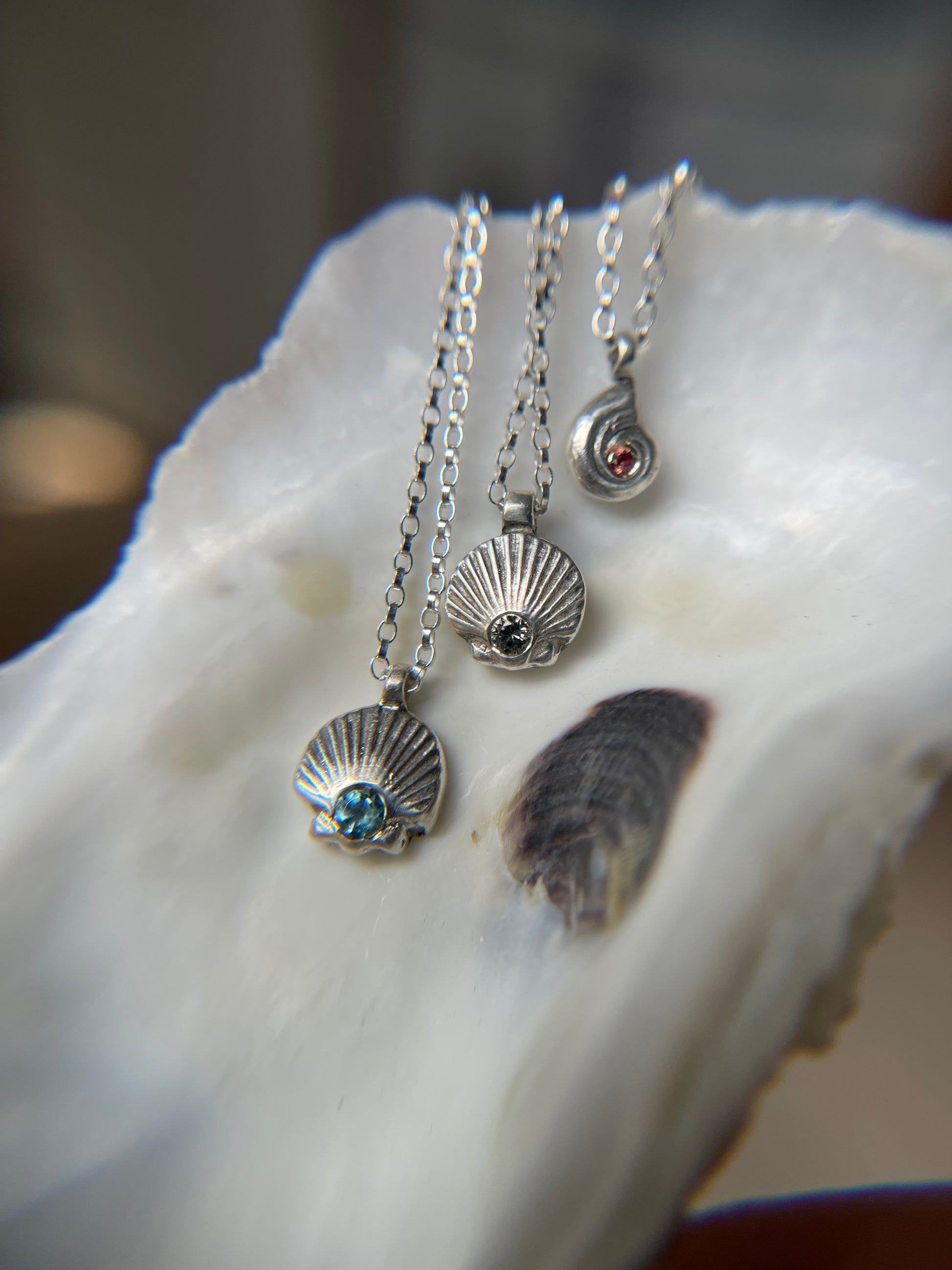 Introducing our limited edition made to order Seashells by the Seashore gemstone charm necklaces. Each shimmering shell is made to order with a sparkling gemstone accent. Choose from London blue topaz or green sapphire for the scallop shell charm and/or a tiny orange Padparadscha sapphire for the sea snail shell charm. Handcrafted from thick recycled sterling silver, these unique and simple necklaces will add a touch of elegant sparkle to your summer wardrobe.