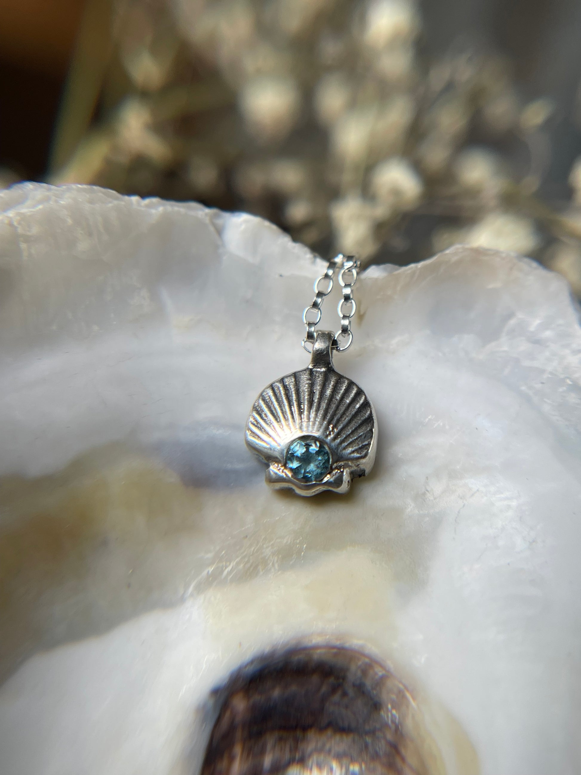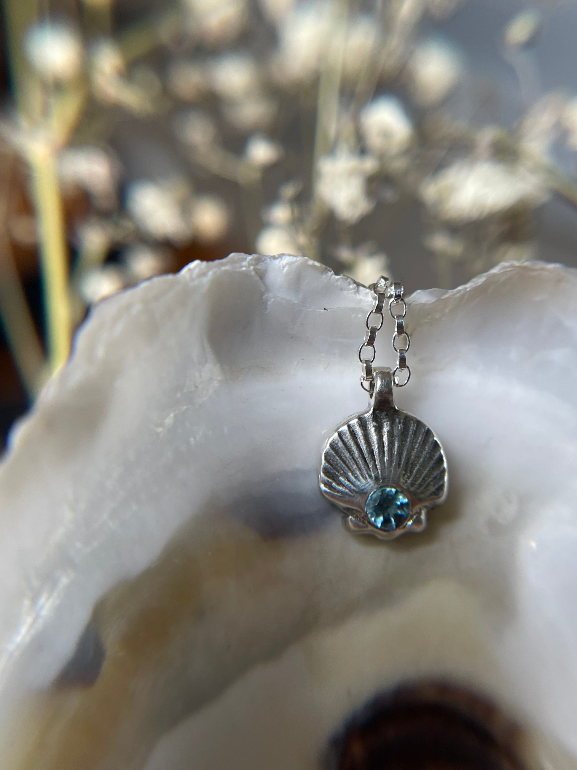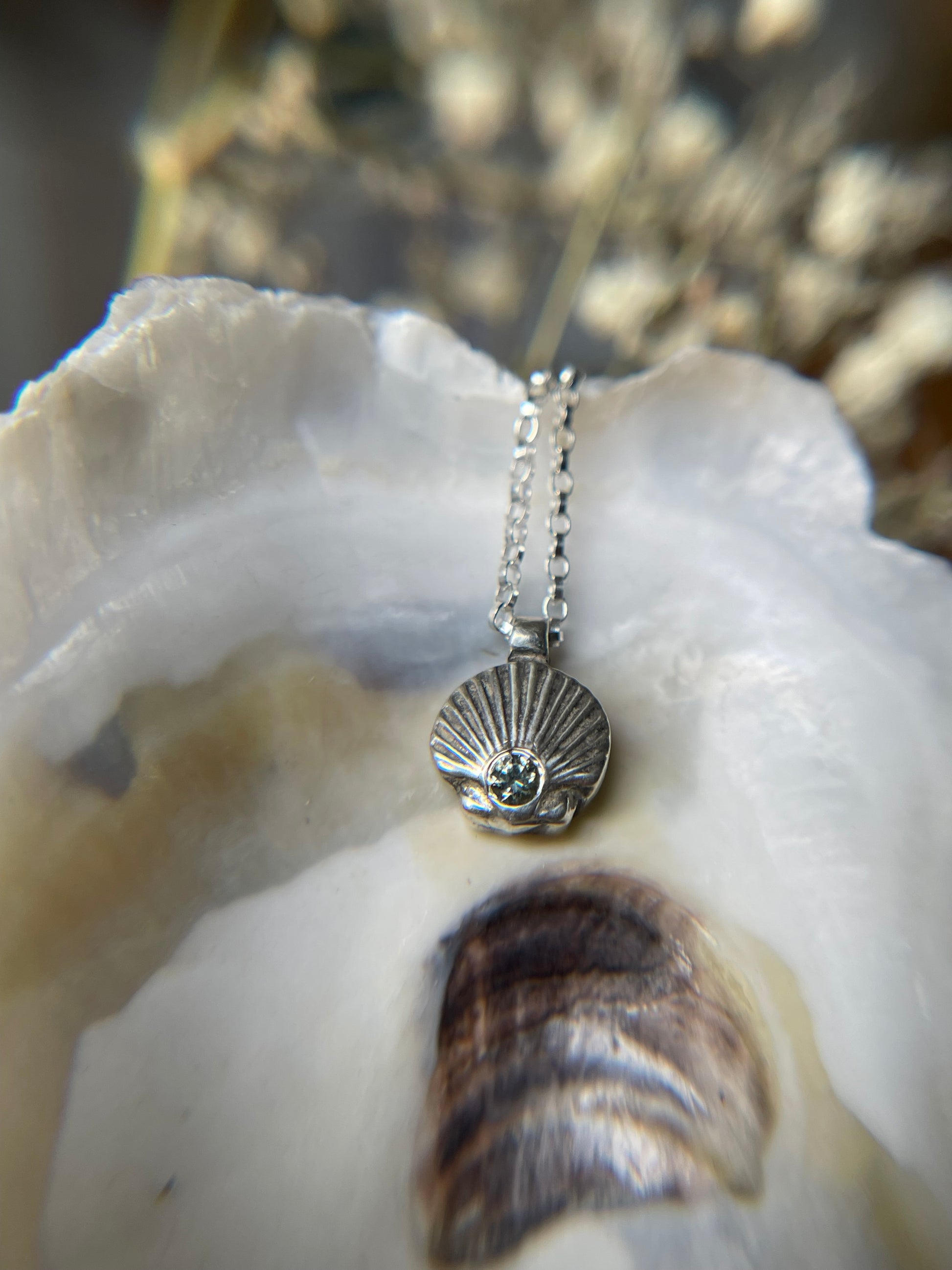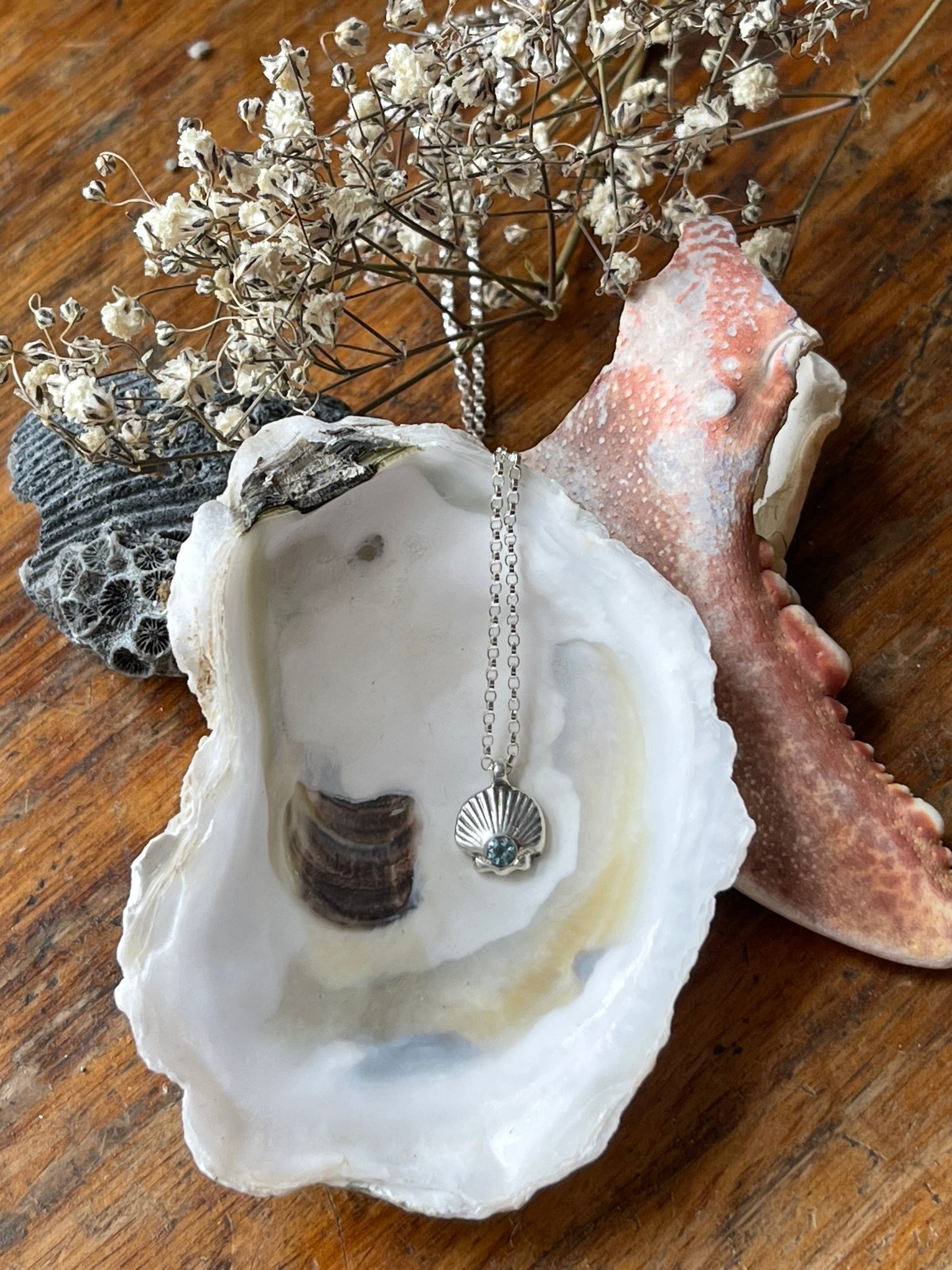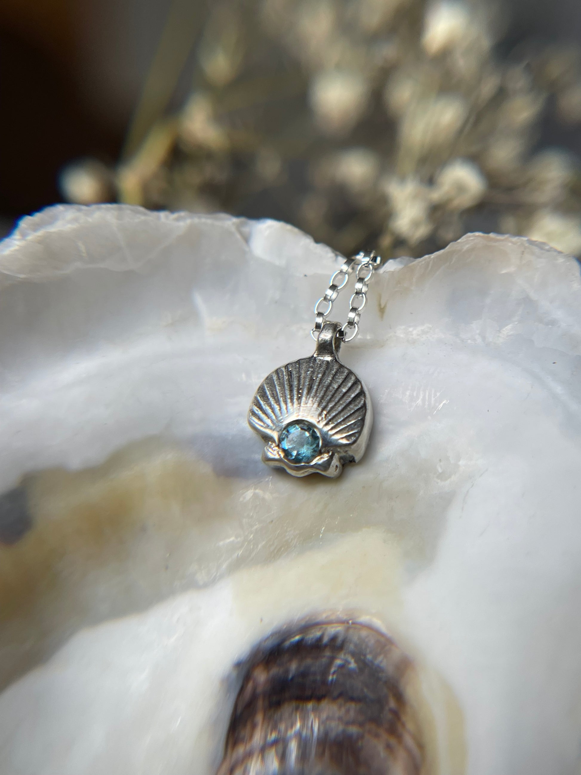 Introducing our limited edition made to order Seashells by the Seashore gemstone charm necklaces. Each shimmering shell is made to order with a sparkling gemstone accent. Choose from London blue topaz or green sapphire for the scallop shell charm and/or a tiny orange Padparadscha sapphire for the sea snail shell charm. Handcrafted from thick recycled sterling silver, these unique and simple necklaces will add a touch of elegant sparkle to your summer wardrobe.