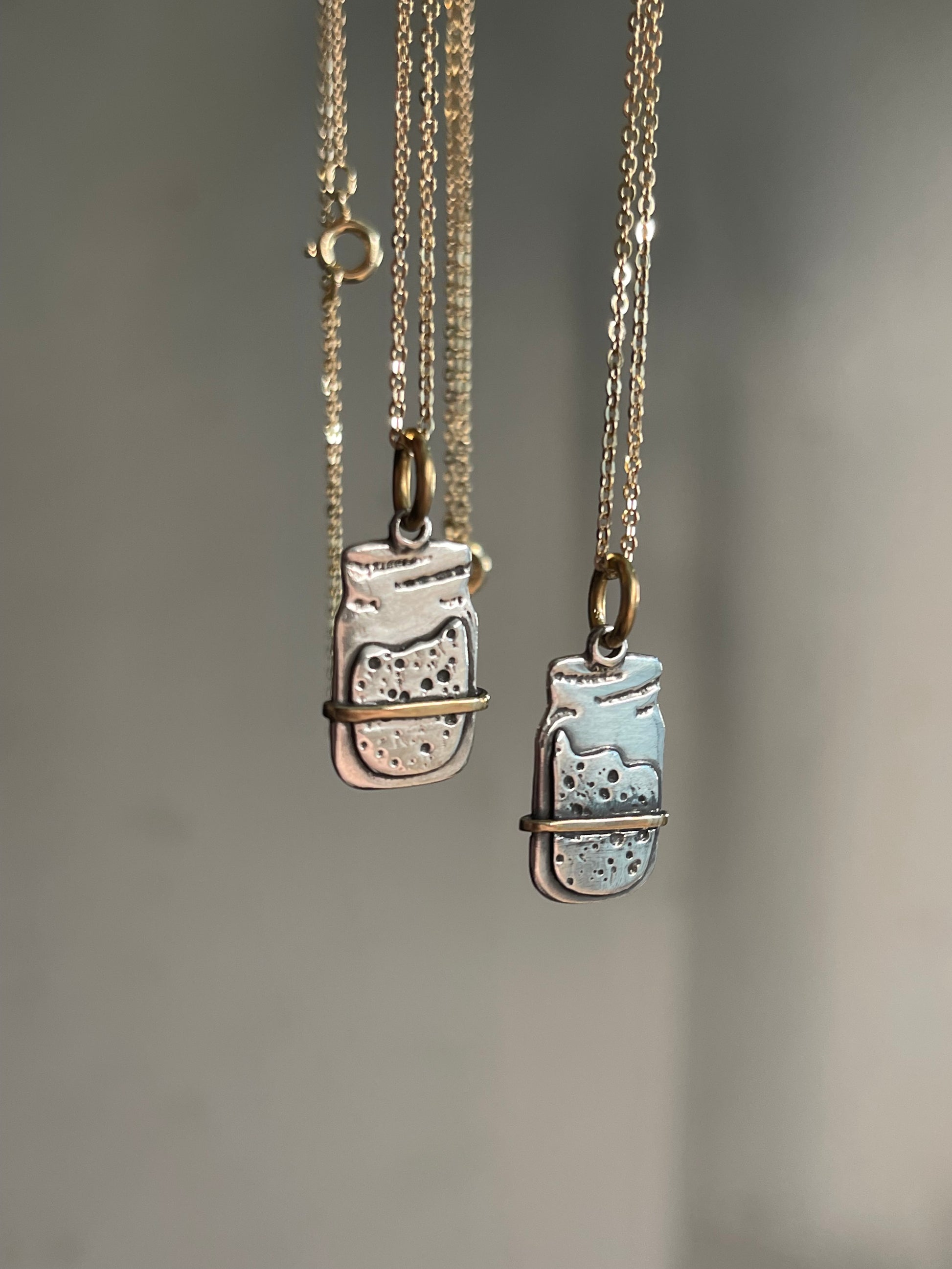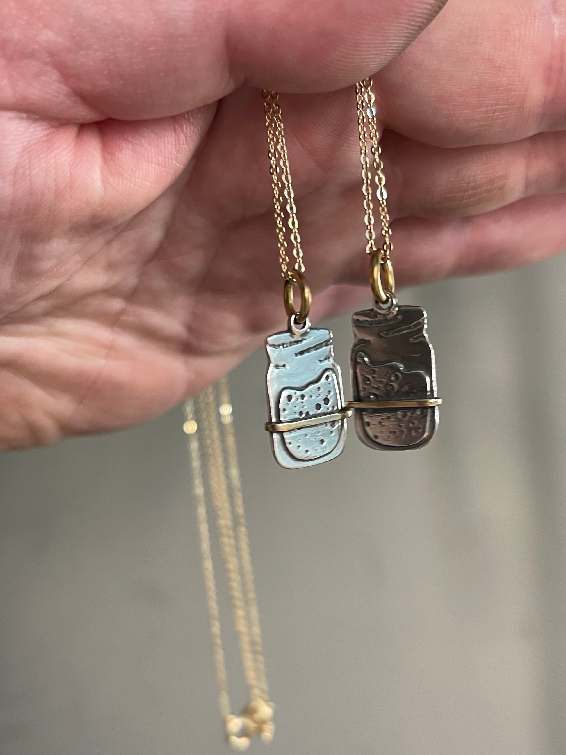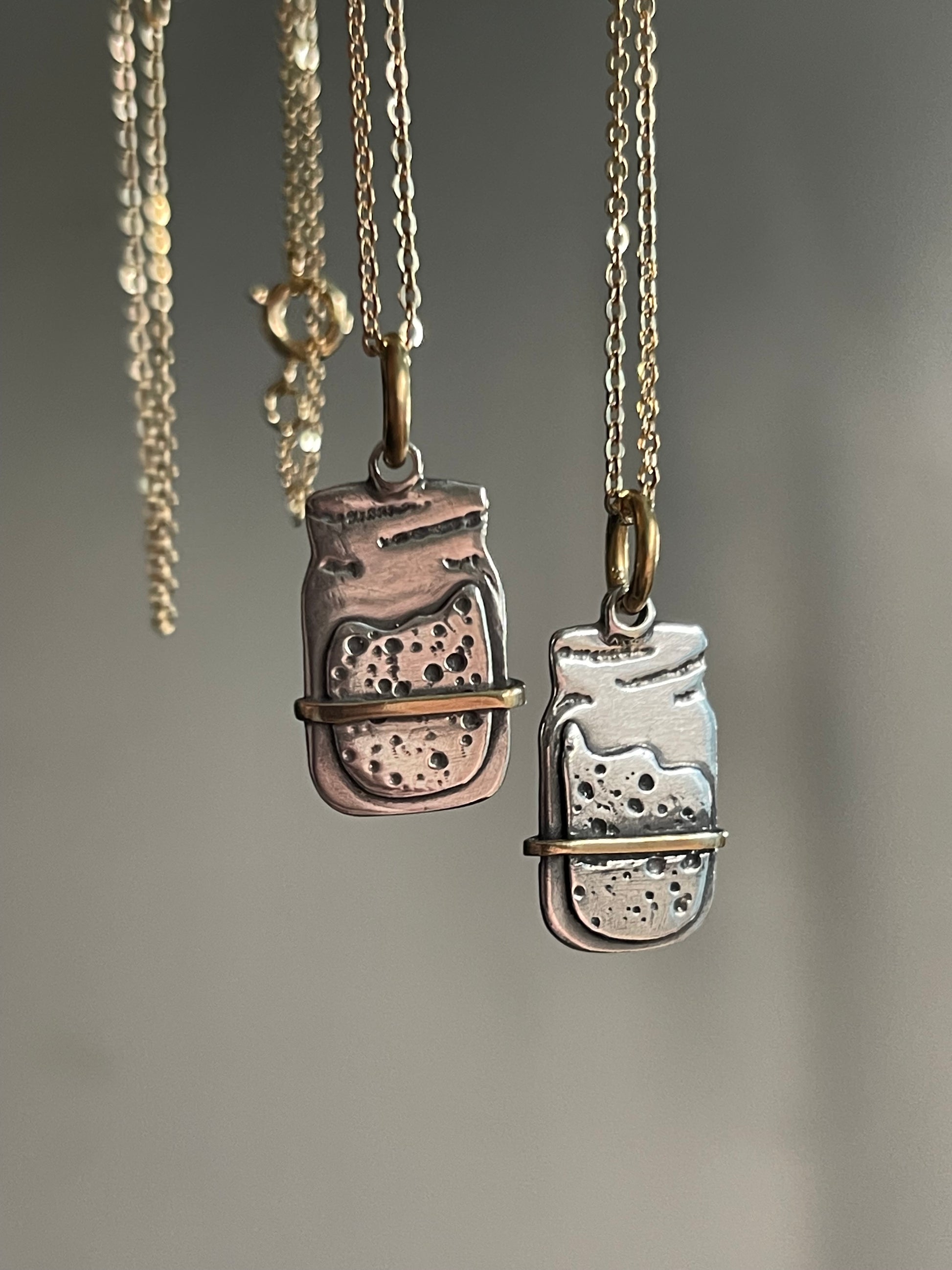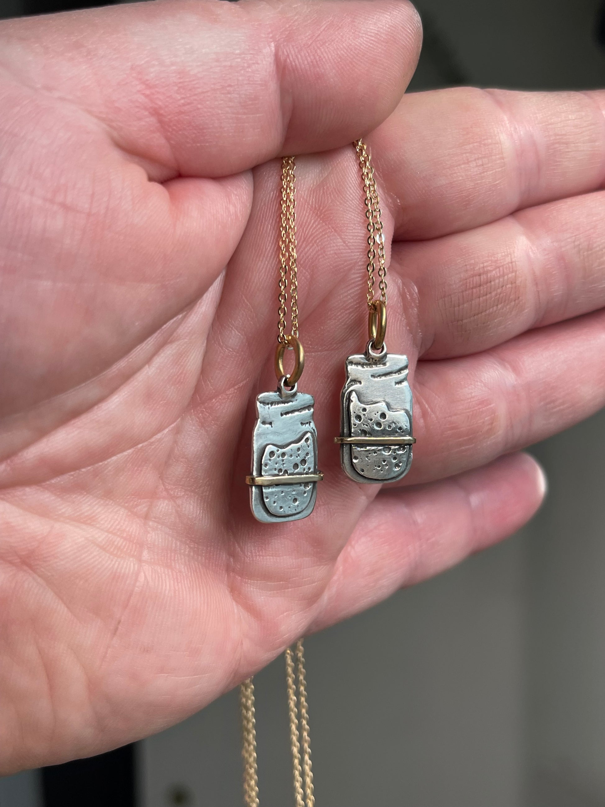 🥖 The Sourdough Starter Necklace – A single sterling silver sourdough starter jar, designed with layered silver to create the bubbly, active starter look, complete with a delicate copper strip to mimic the classic rubber band marker. Suspended from an 18 inch fine sterling silver cable chain with shepherds hook clasp (retails for $25), this minimalist piece is perfect for everyday wear.