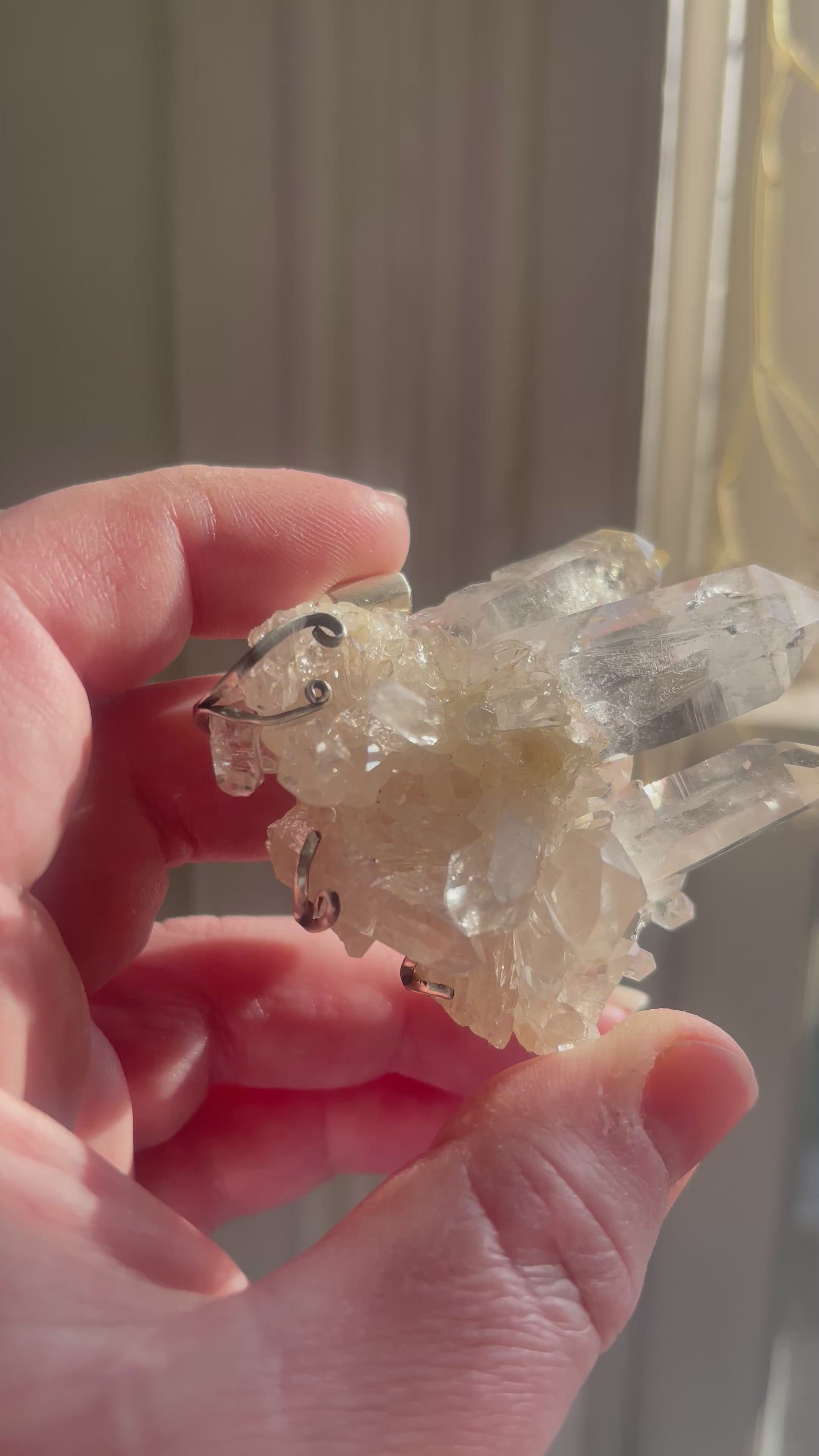 Handcrafted from thick sterling silver, the crystalline knowledge jewel embodies emergence in its purest form. this breathtaking quartz cluster holds wonder in every point—some glimmer with rainbow inclusions, while all radiate with an ethereal sparkle and ancient lore. Intricately cradled in a swirling prong setting, the design adds a touch of whimsy, as if the crystal is still growing, still becoming.