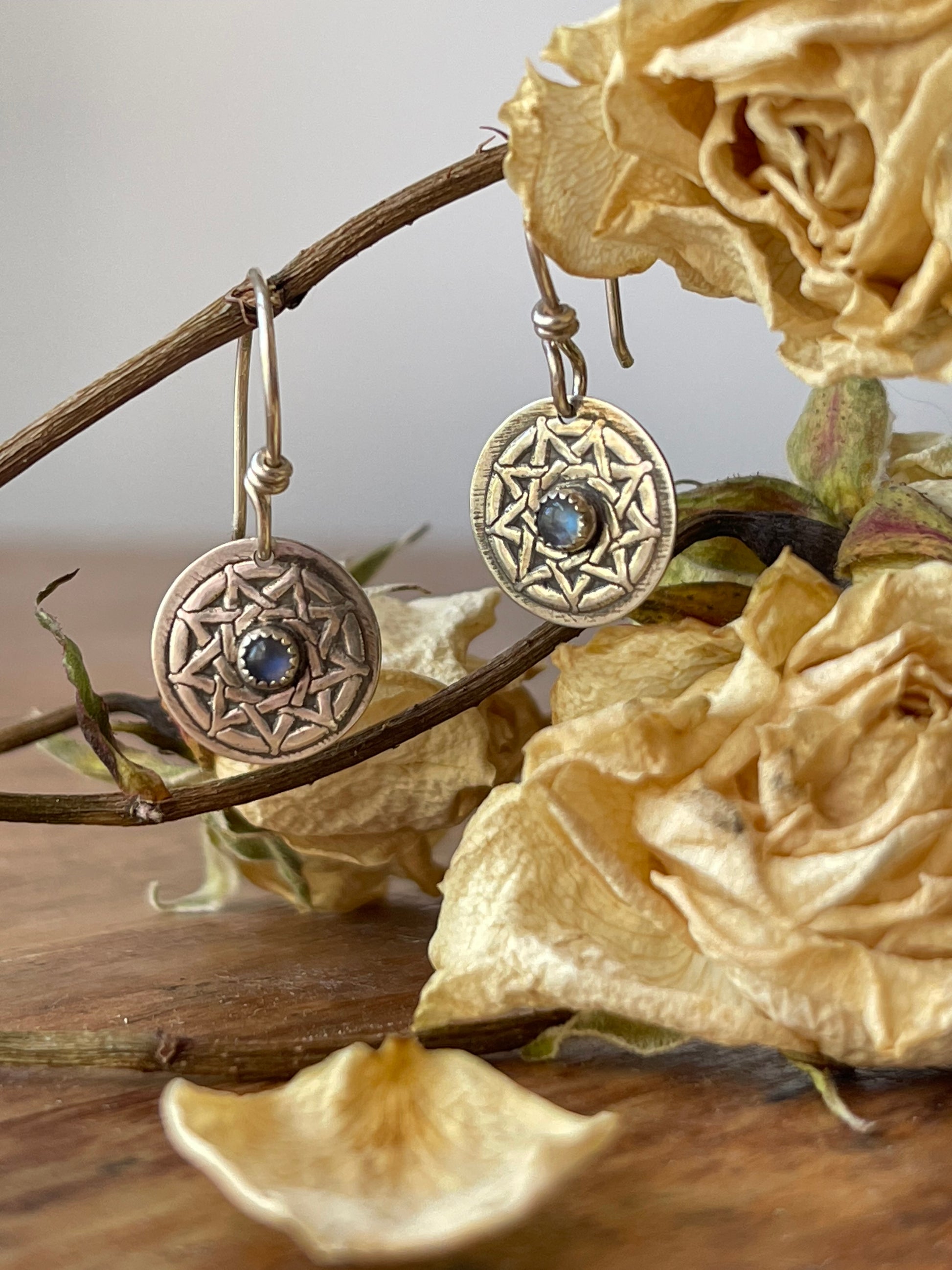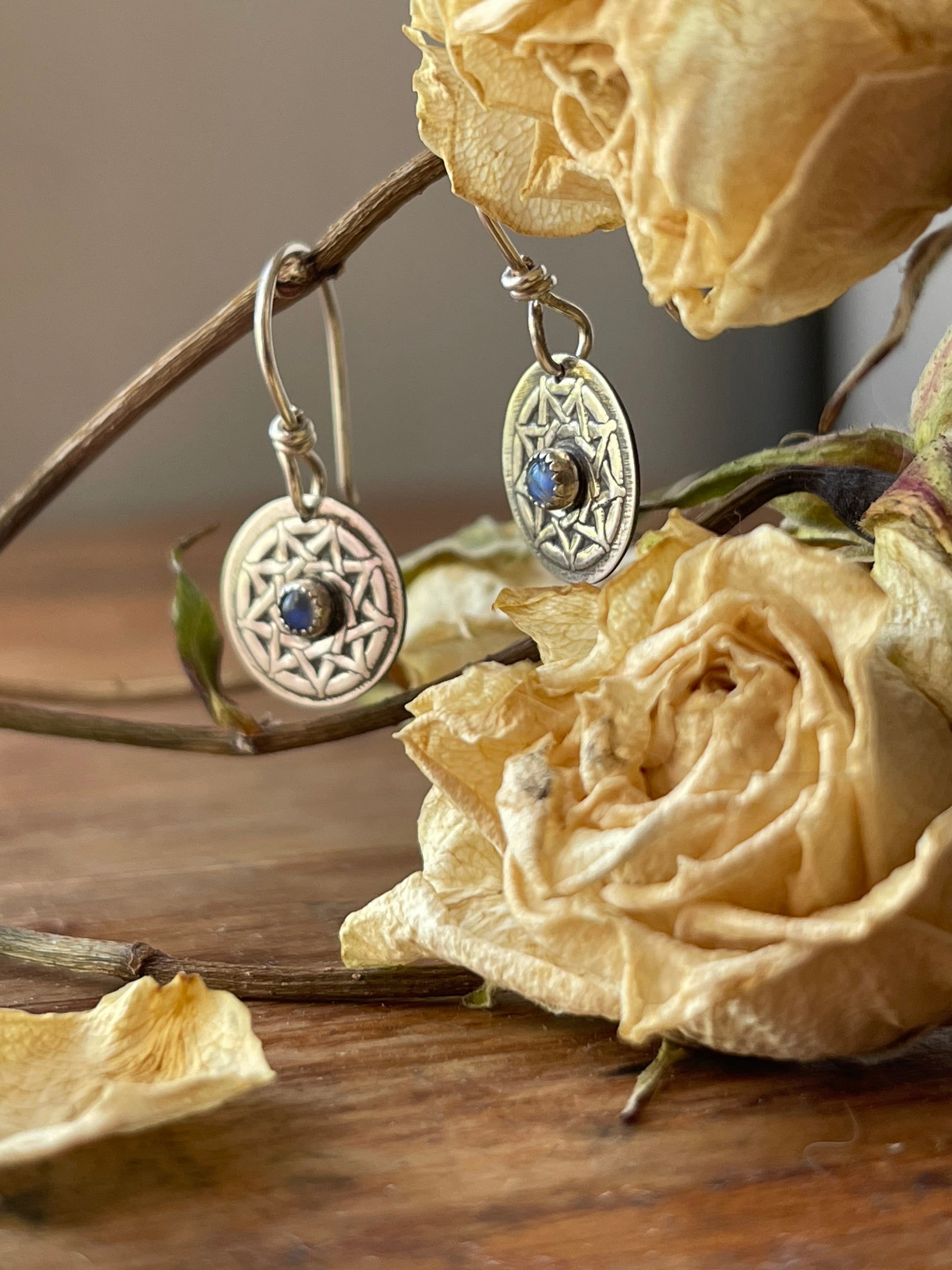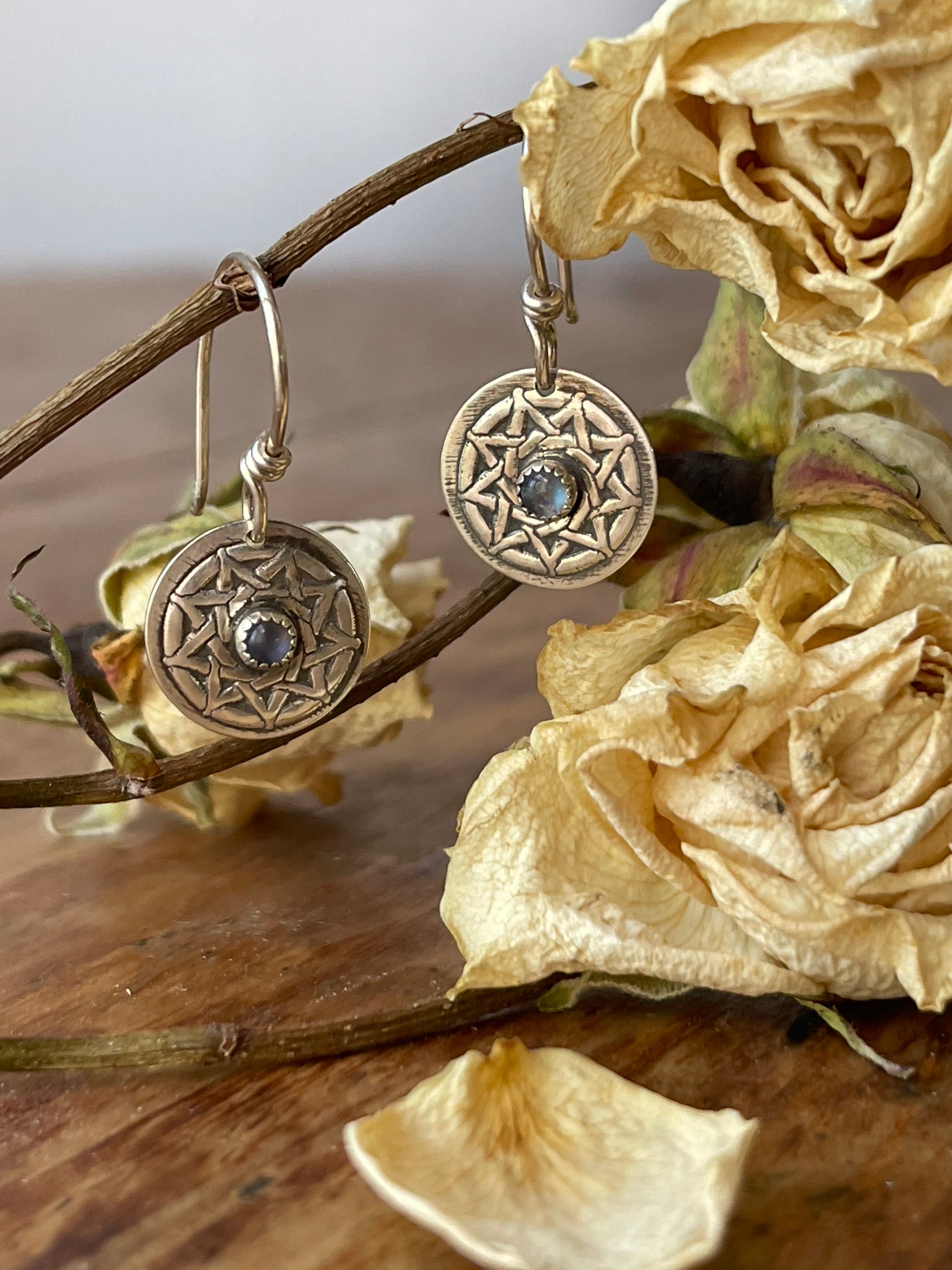 Fierce yet elegant, these Viking Shield dangle earrings are inspired by ancient Nordic design and crafted for the modern warrior. A detailed Viking knot forms the heart of each piece, symbolizing strength, protection, and interconnectedness. At the center, your choice of either a glowing rainbow moonstone or a richly faceted London blue topaz adds a powerful focal point. Made entirely of sterling silver and safe for sensitive ears, these earrings bring timeless legend and striking beauty to your everyday armor.