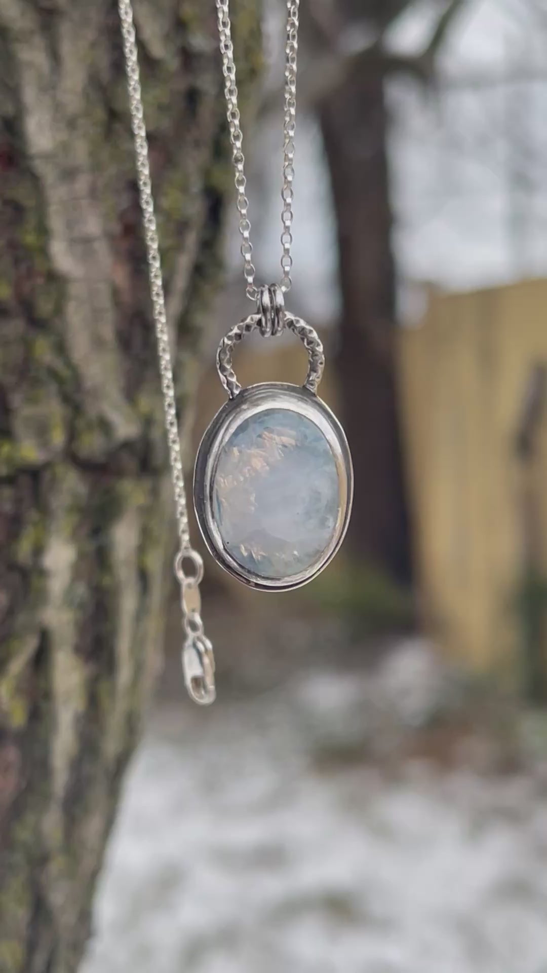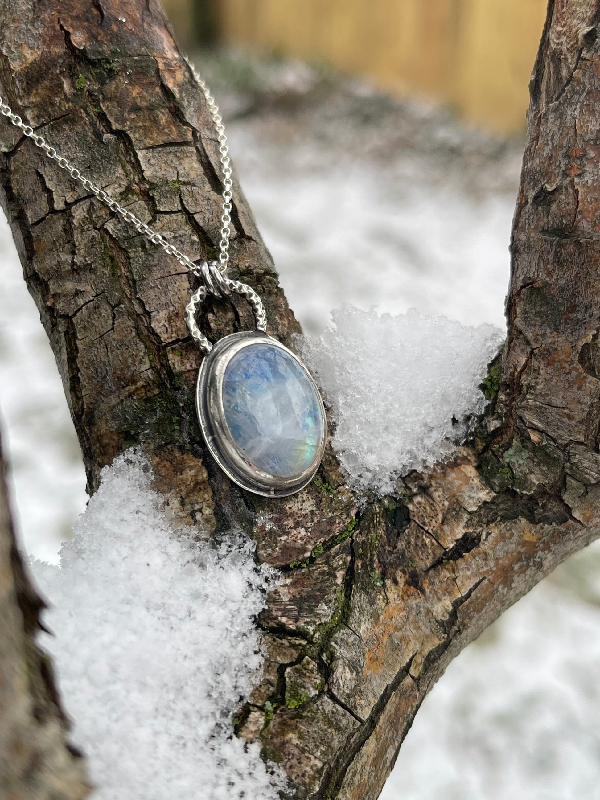 This pendant features a captivating rainbow moonstone, alive with a yellow-blue band of natural rainbow flash that shifts beautifully as it catches the light. The stone glows from within, echoing the way winter moonlight dances across ice and snow.