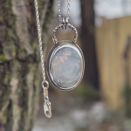Crafted in sterling silver, the setting holds a hidden detail: a cut-out crescent moon on the back of the pendant. Visible through the stone and best seen in motion (see video for a view of the back), this celestial touch adds depth and quiet whimsy to the design. The pendant is finished on a sterling silver chain, secured with durable stainless steel jump rings for added strength and longevity.