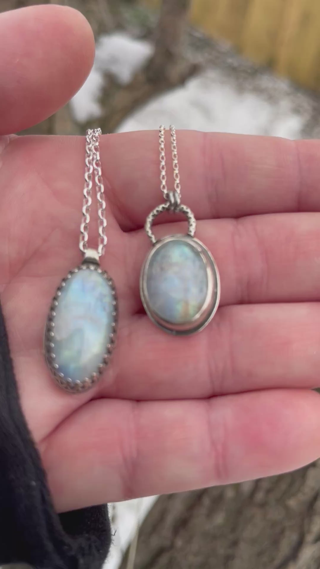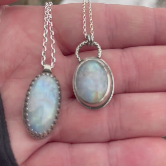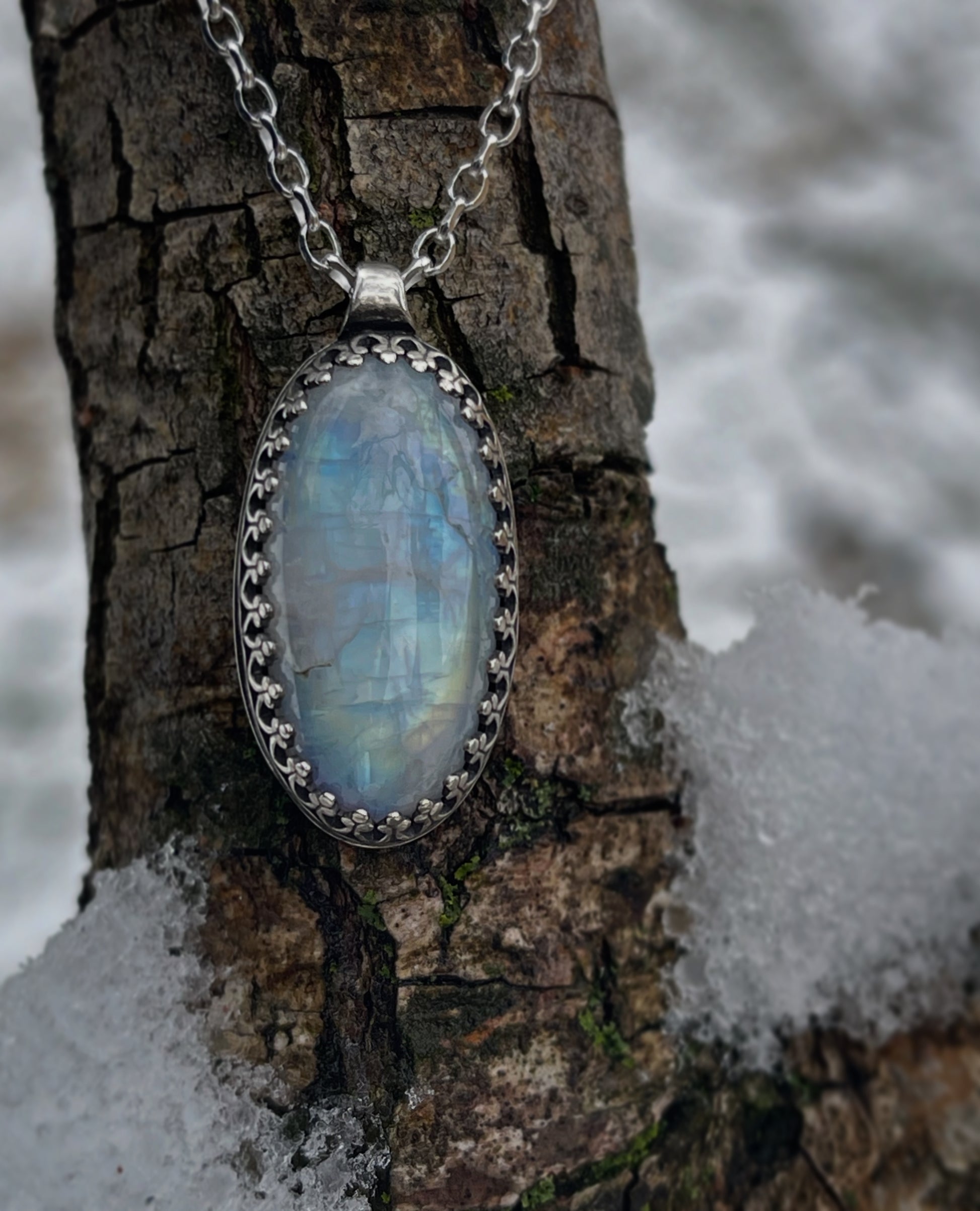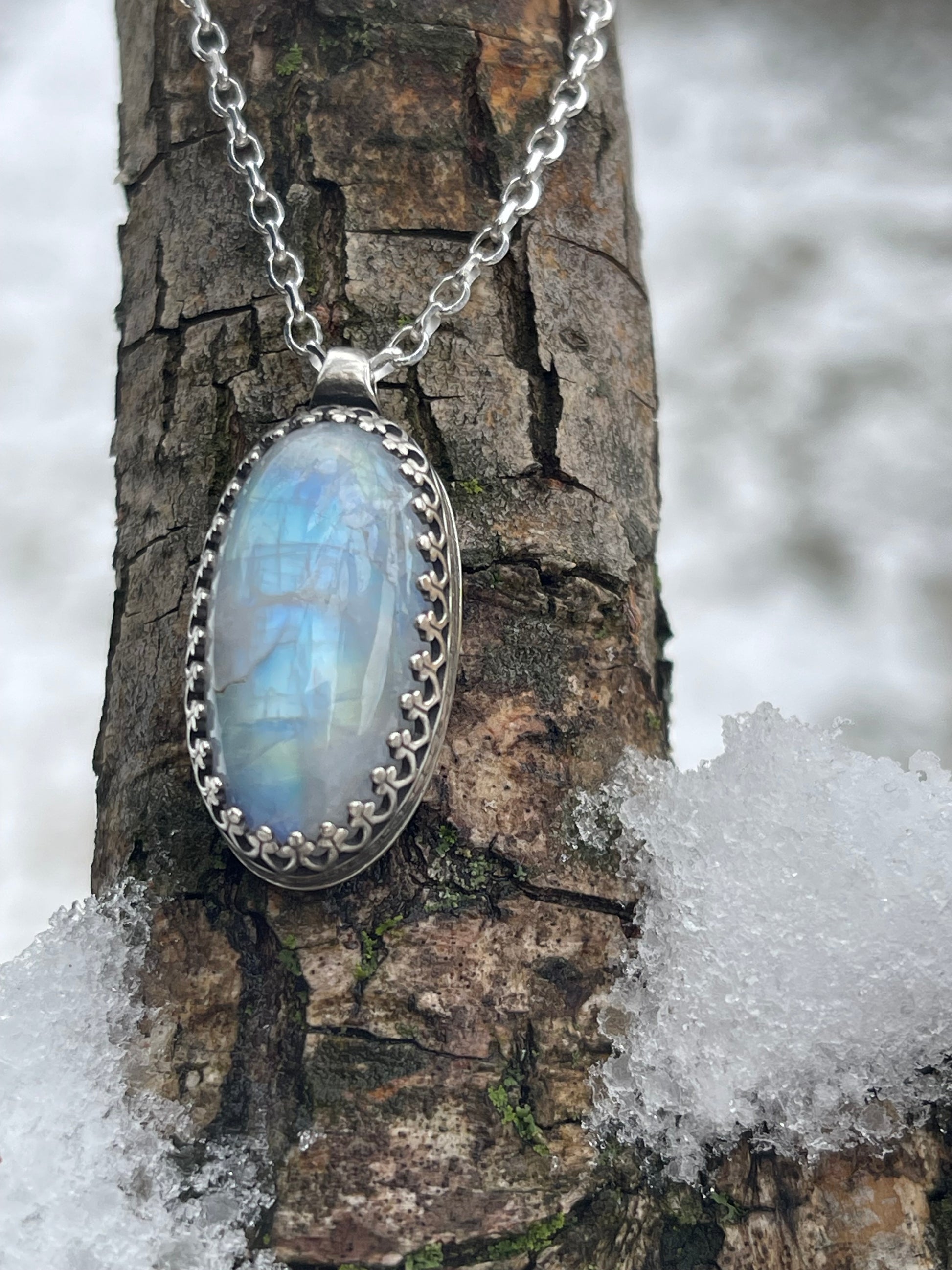 This pendant features an elongated oval rainbow moonstone, glowing with a fluid, diffused flash of color that moves gracefully throughout the entire stone. Unlike the bold shimmer of Winter Moon, this moonstone’s light is subtle and expansive, spreading softly like winter sunrays across fresh snow.